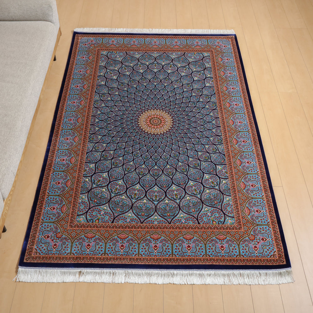シルクのような滑らかな肌触りと光沢感は、まるで高級なペルシャ絨毯のよう。パイル部分は機械で織られており、その細かさは手織りの2倍以上、その分デザインの高級感が高く、房部分は天然シルクを使用して、縁や毛足を整える仕上げは手作業で行われています。