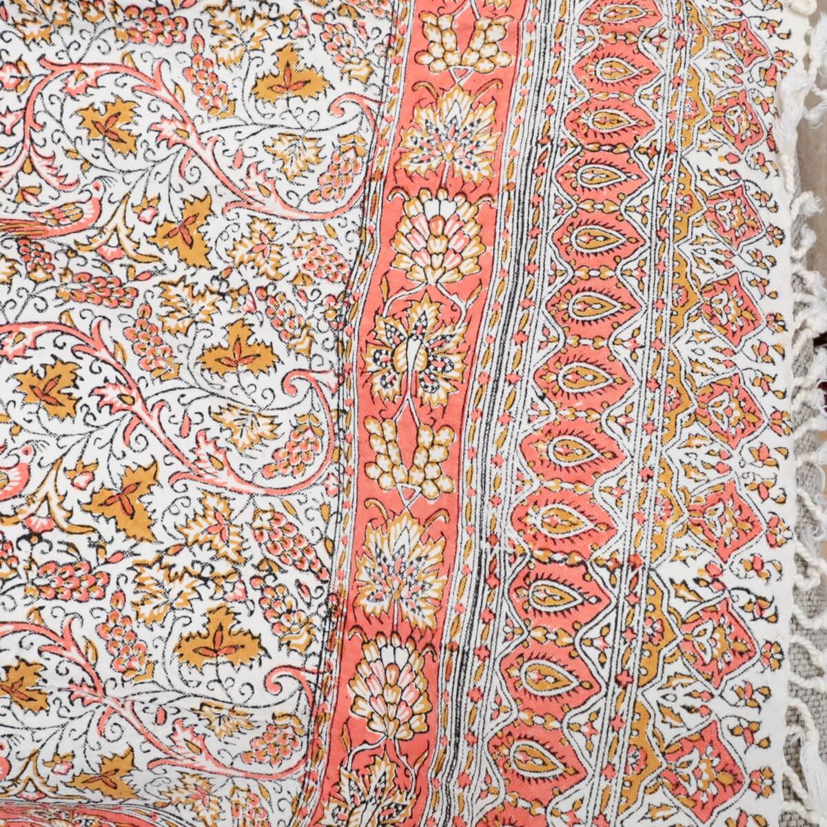 ペルシャ更紗(ガラムカール)は、年季の入った幾つもの手彫りの木型を使って、型を変え、色を変えて、何度も何度も手作業で型押しして染められます。イランの古都イスハファーンの工房で、職人さんが一枚ずつ丁寧に染め付け、まわりの房を手で撚り合わせて、全てハンドメイドで仕上げていきます。機械で一度に高速プリントされる布とは違う、手間のかけられた手仕事の職人技をぜひ楽しんでください。手作りの為、押し染めで染料が飛んだり擦れたりした部分がある場合もございます。程度の大きなものはコメントをつけておりますが、商品特性となります。