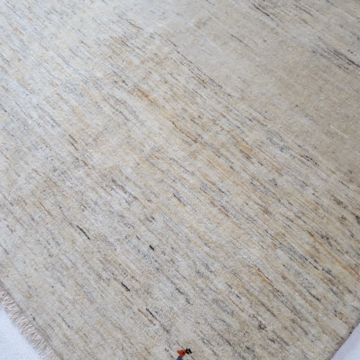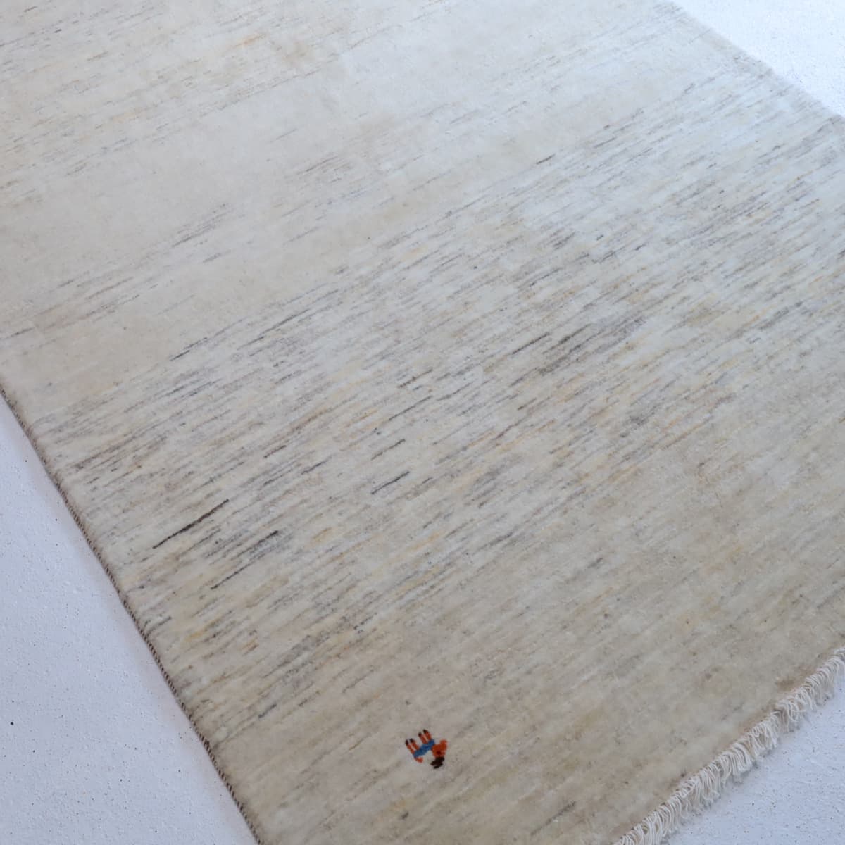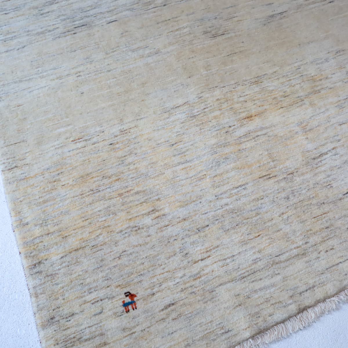 羊の毛色をそのまま活かした無染色の羊色のベースは、どんな場所にも似合うナチュラルな風合い。薄いグレーやベージュのグラデーションがやんわり入った、シンプルなデザインのギャッベです。