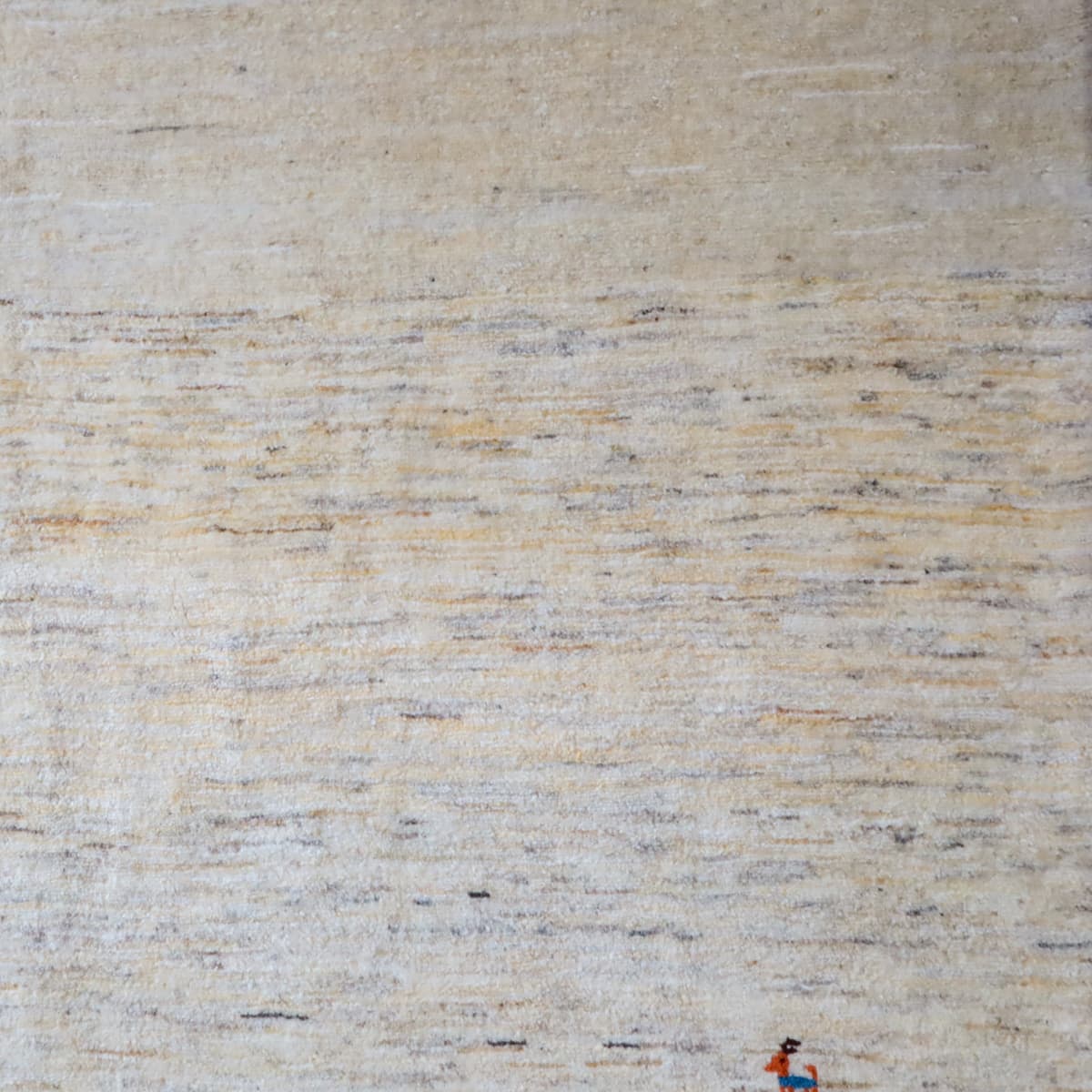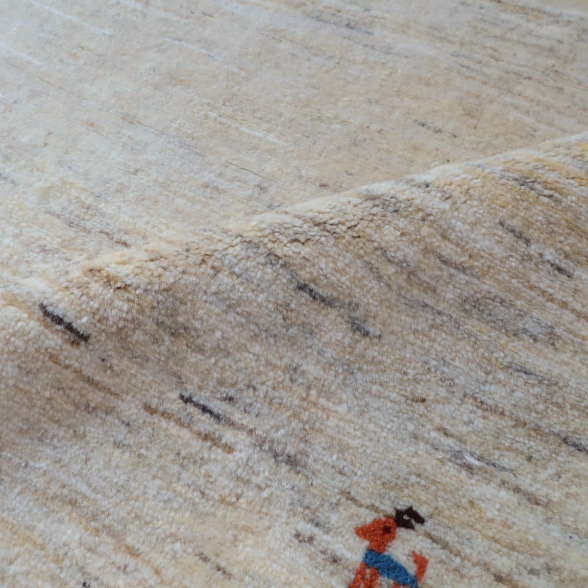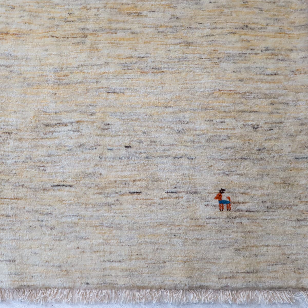 羊の毛色をそのまま活かした無染色の羊色のベースは、どんな場所にも似合うナチュラルな風合い。薄いグレーやベージュのグラデーションがやんわり入った、シンプルなデザインのギャッベです。
