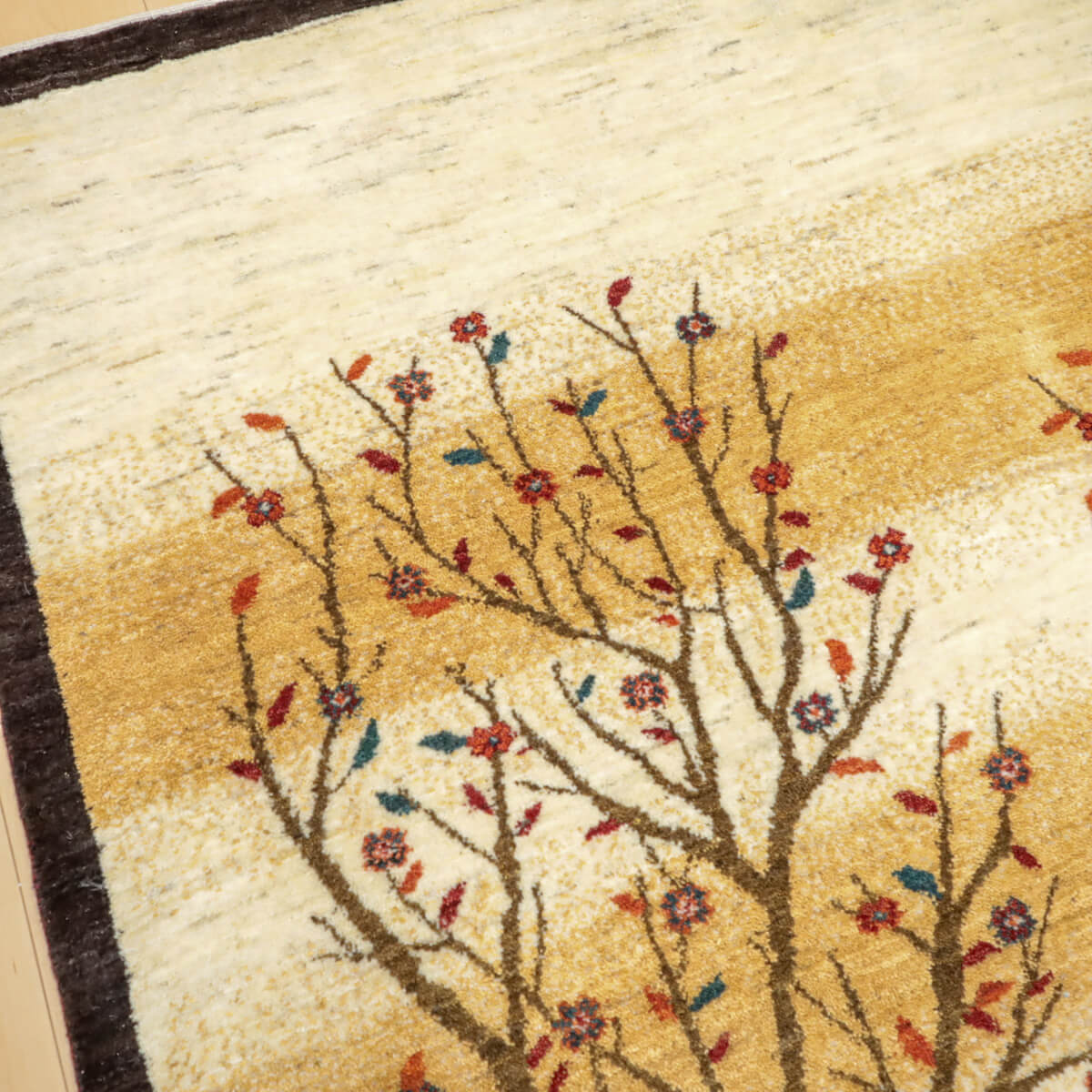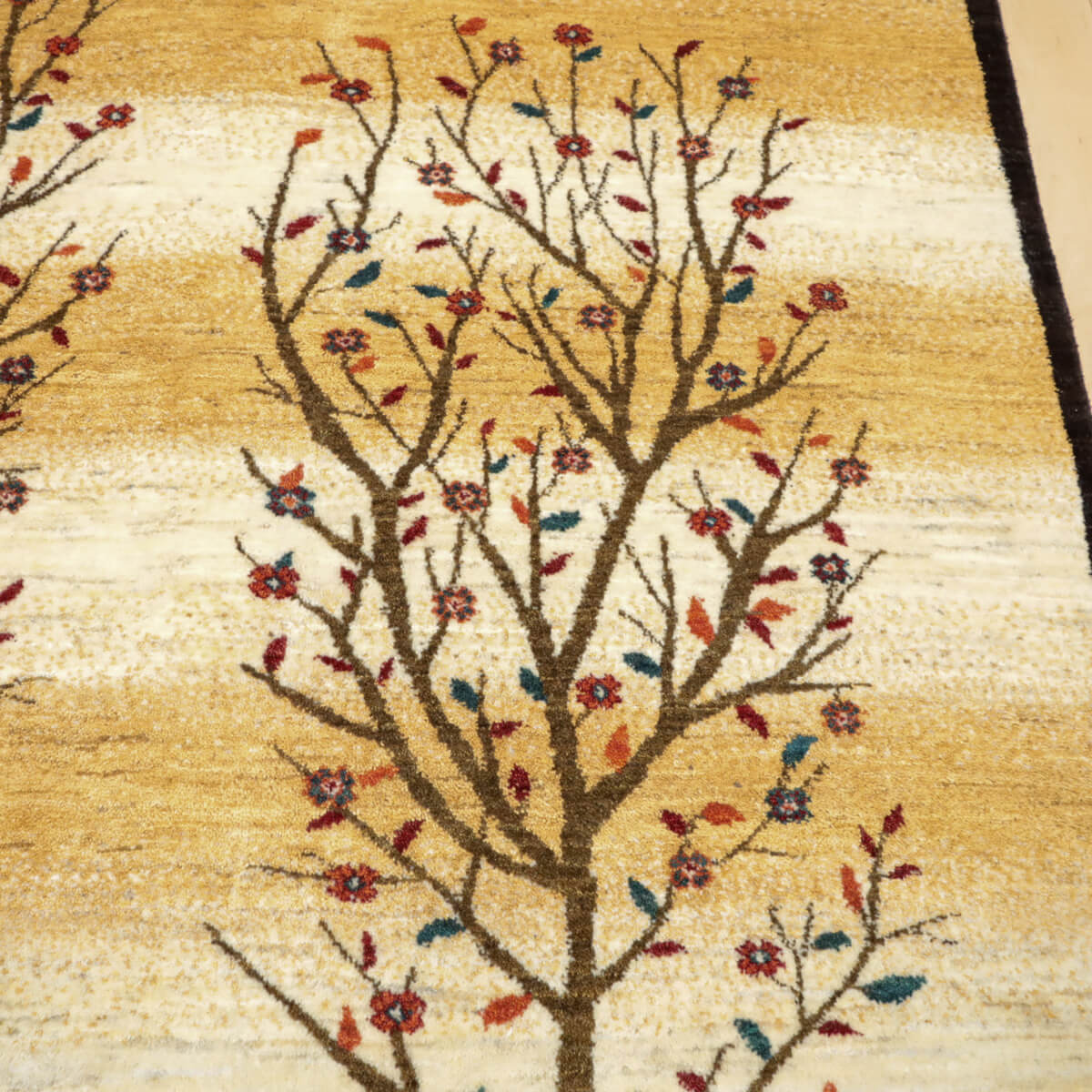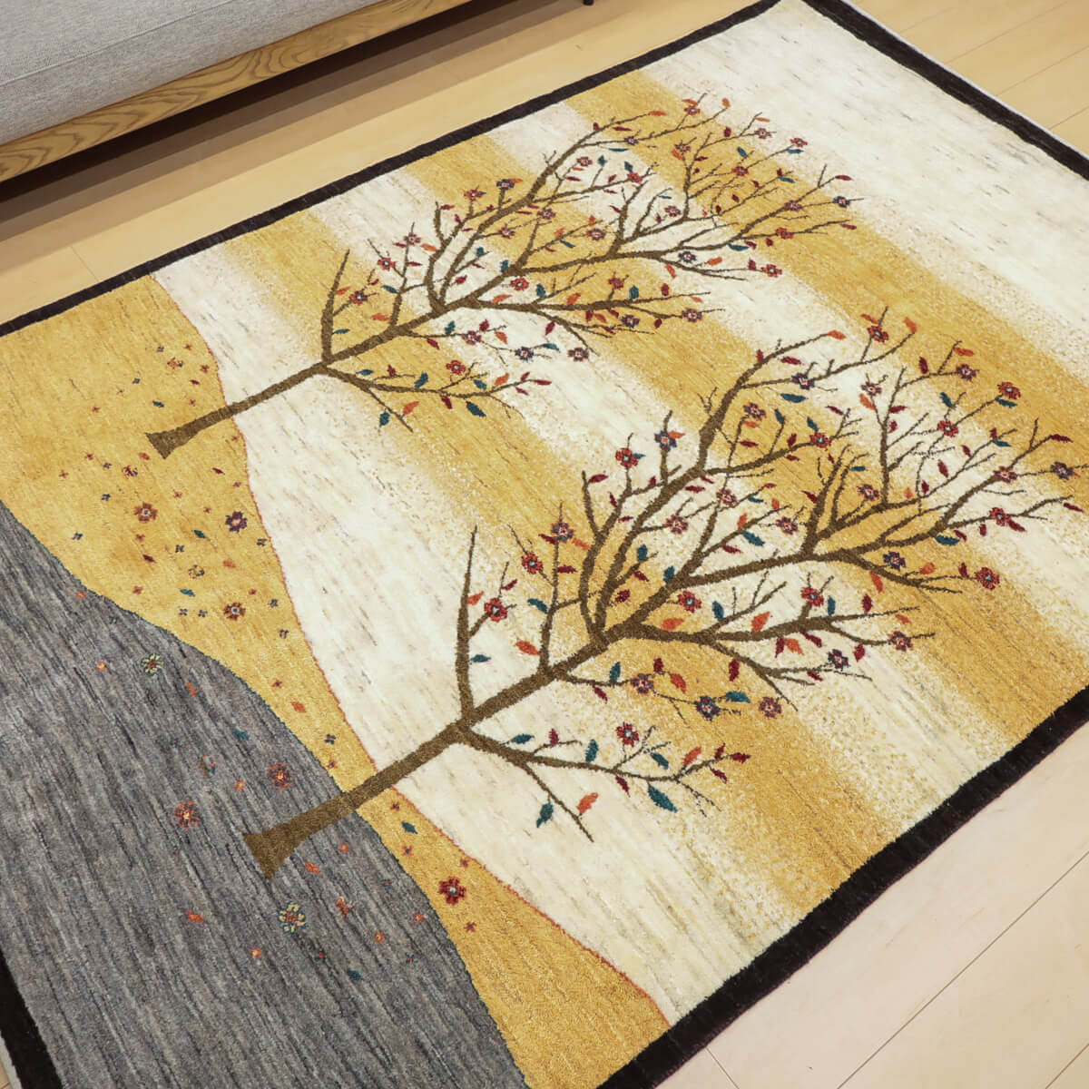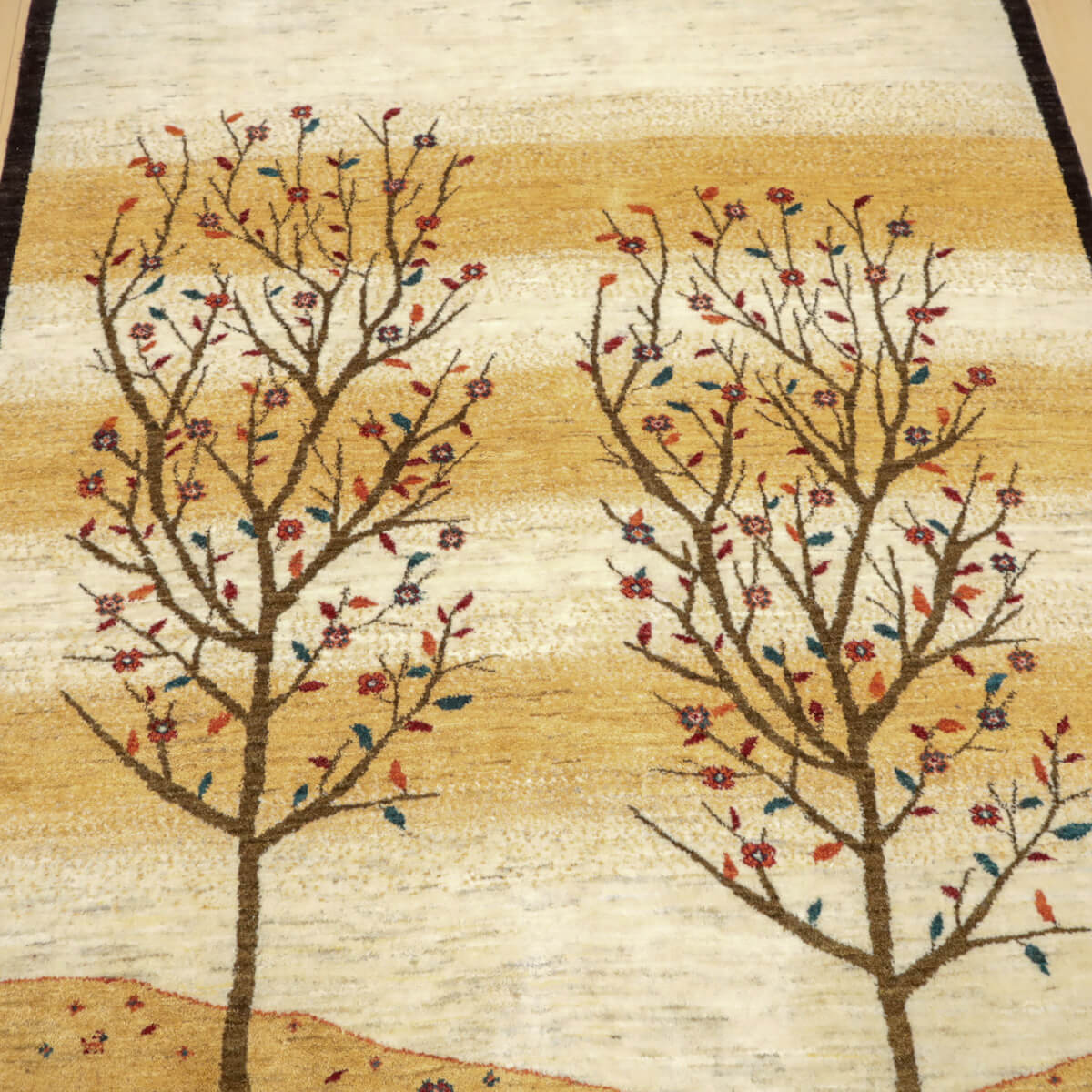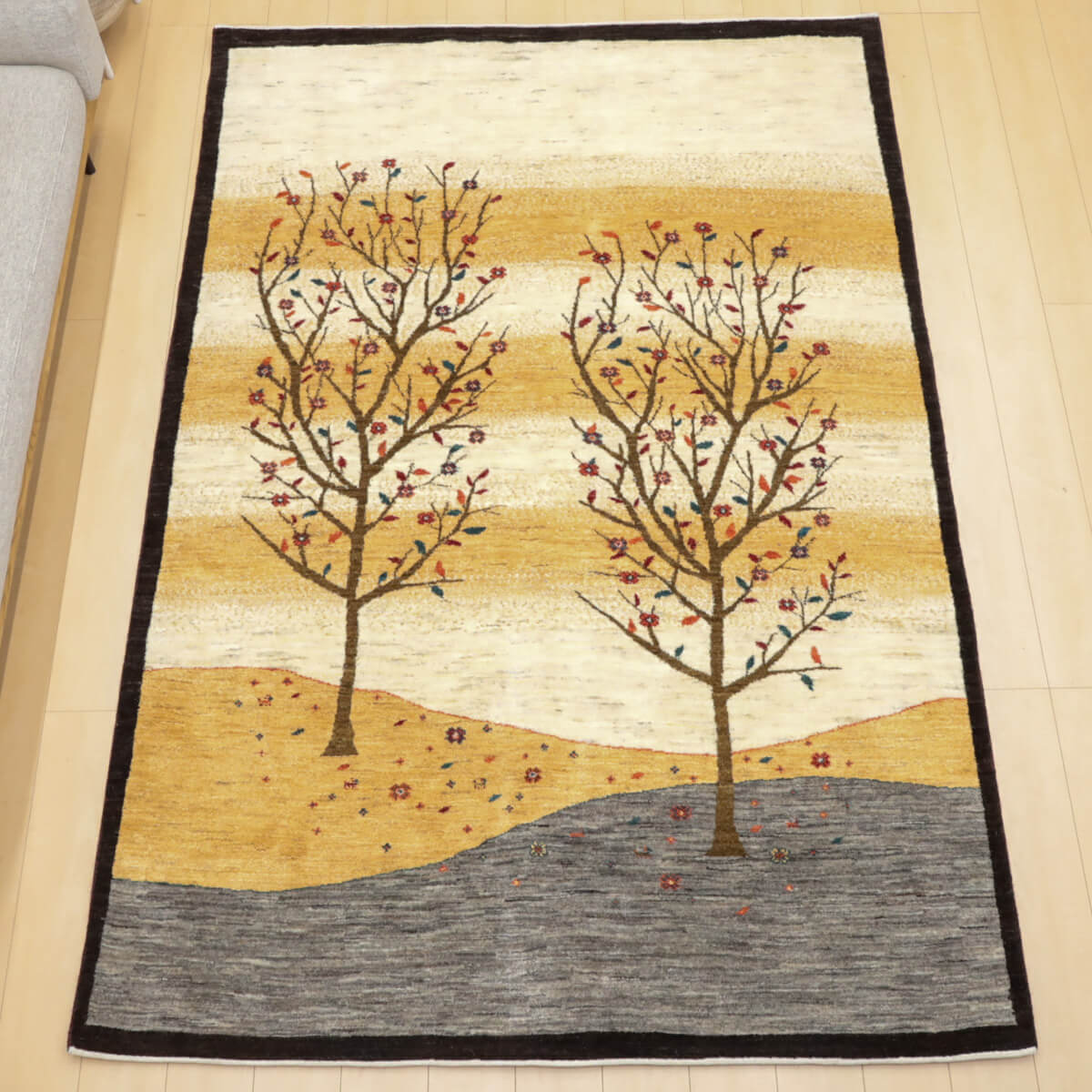 デザインの魅力 季節の移ろいを表現した二本の樹木が、黒い縁取りで引き締められた洗練された構図です。草花が散る風景は穏やかで、四季を感じさせる優美な物語性があります。リビングに飾るだけで、自然との繋がりを感じられる芸術的な一枚になります。 色 黄金色と生成り、濃いグレーが奏でる落ち着いた色合いです。赤や紫の小さな花々がアクセントになり、全体を引き締めています。モダンな空間にも、温かみのあるお部屋にも調和しやすい、時間が経つほど魅力が増す色選びです。 質感の良さ イラン産ギャッベ特有の、丁寧に織り込まれた密度の高いウールが、柔らかく弾力のある踏み心地を実現しています。細部まで丁寧に仕上げられた織目と、天然素材ならではのぬくもりが、毎日のご使用で深い風合いを醸し出します。