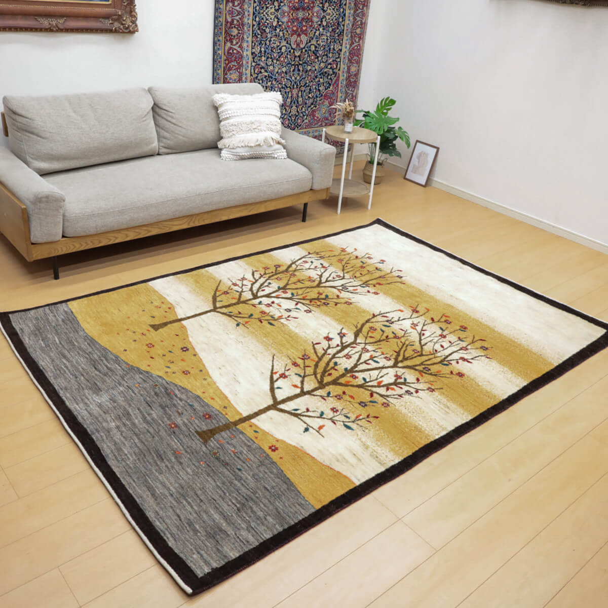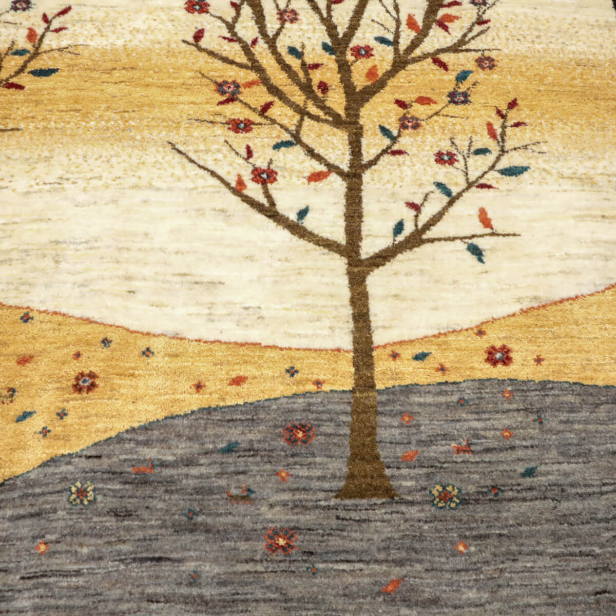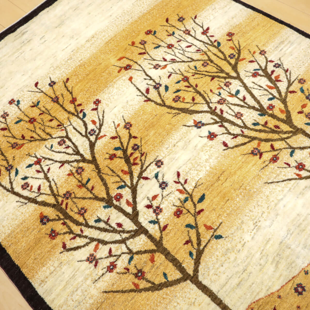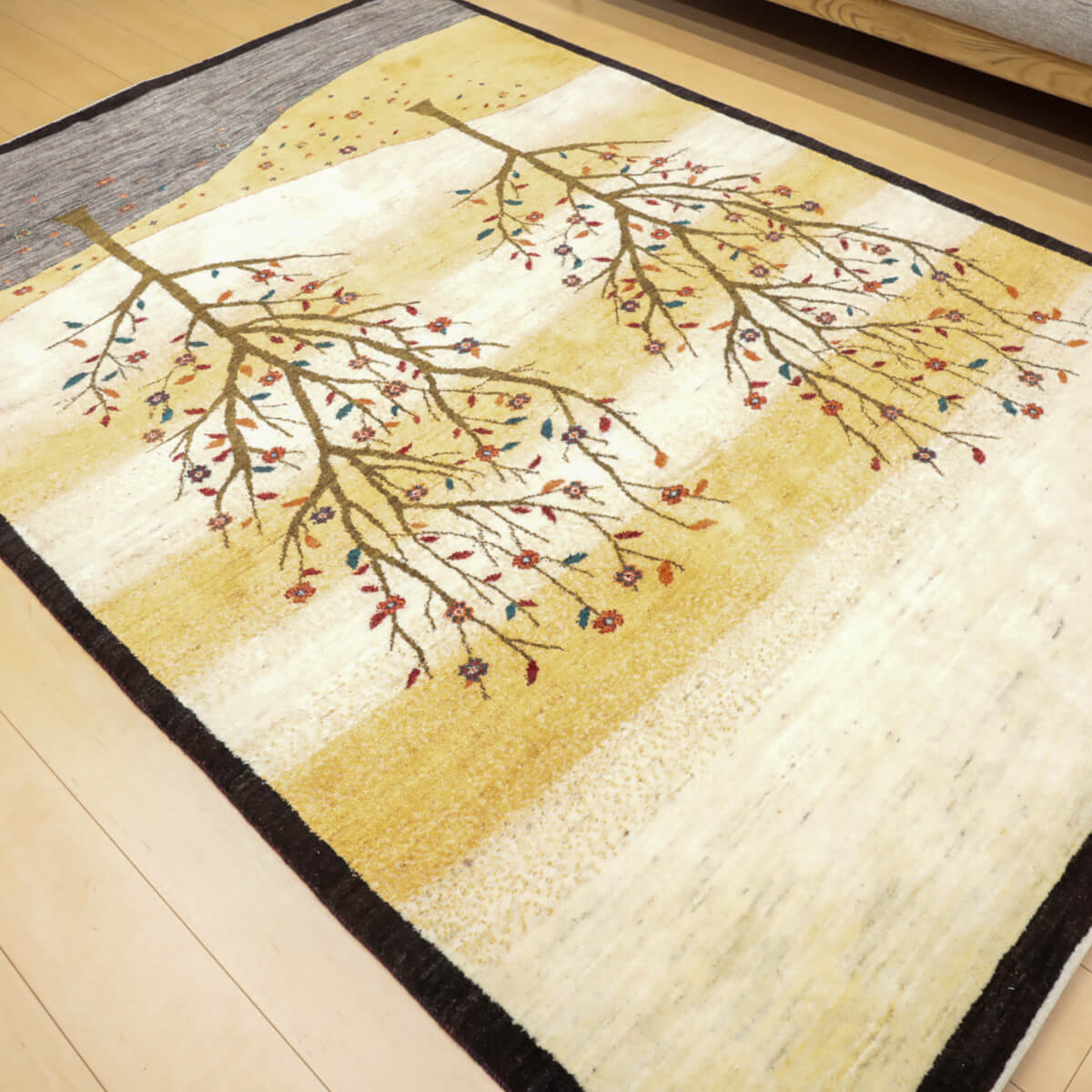 デザインの魅力 季節の移ろいを表現した二本の樹木が、黒い縁取りで引き締められた洗練された構図です。草花が散る風景は穏やかで、四季を感じさせる優美な物語性があります。リビングに飾るだけで、自然との繋がりを感じられる芸術的な一枚になります。 色 黄金色と生成り、濃いグレーが奏でる落ち着いた色合いです。赤や紫の小さな花々がアクセントになり、全体を引き締めています。モダンな空間にも、温かみのあるお部屋にも調和しやすい、時間が経つほど魅力が増す色選びです。 質感の良さ イラン産ギャッベ特有の、丁寧に織り込まれた密度の高いウールが、柔らかく弾力のある踏み心地を実現しています。細部まで丁寧に仕上げられた織目と、天然素材ならではのぬくもりが、毎日のご使用で深い風合いを醸し出します。
