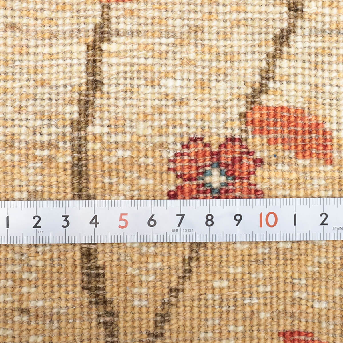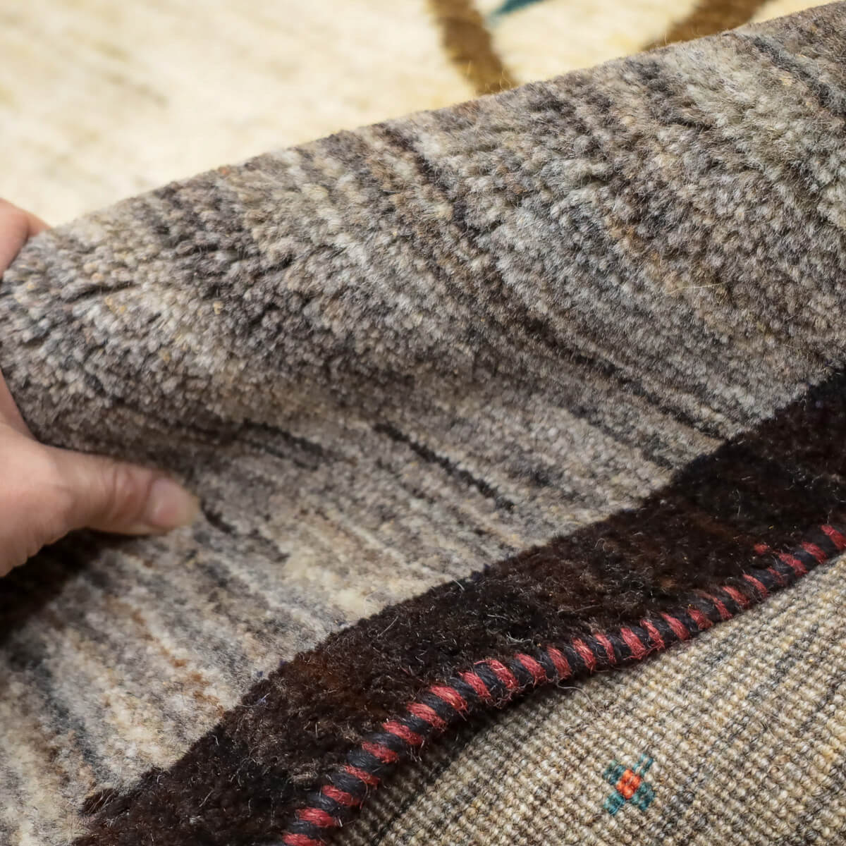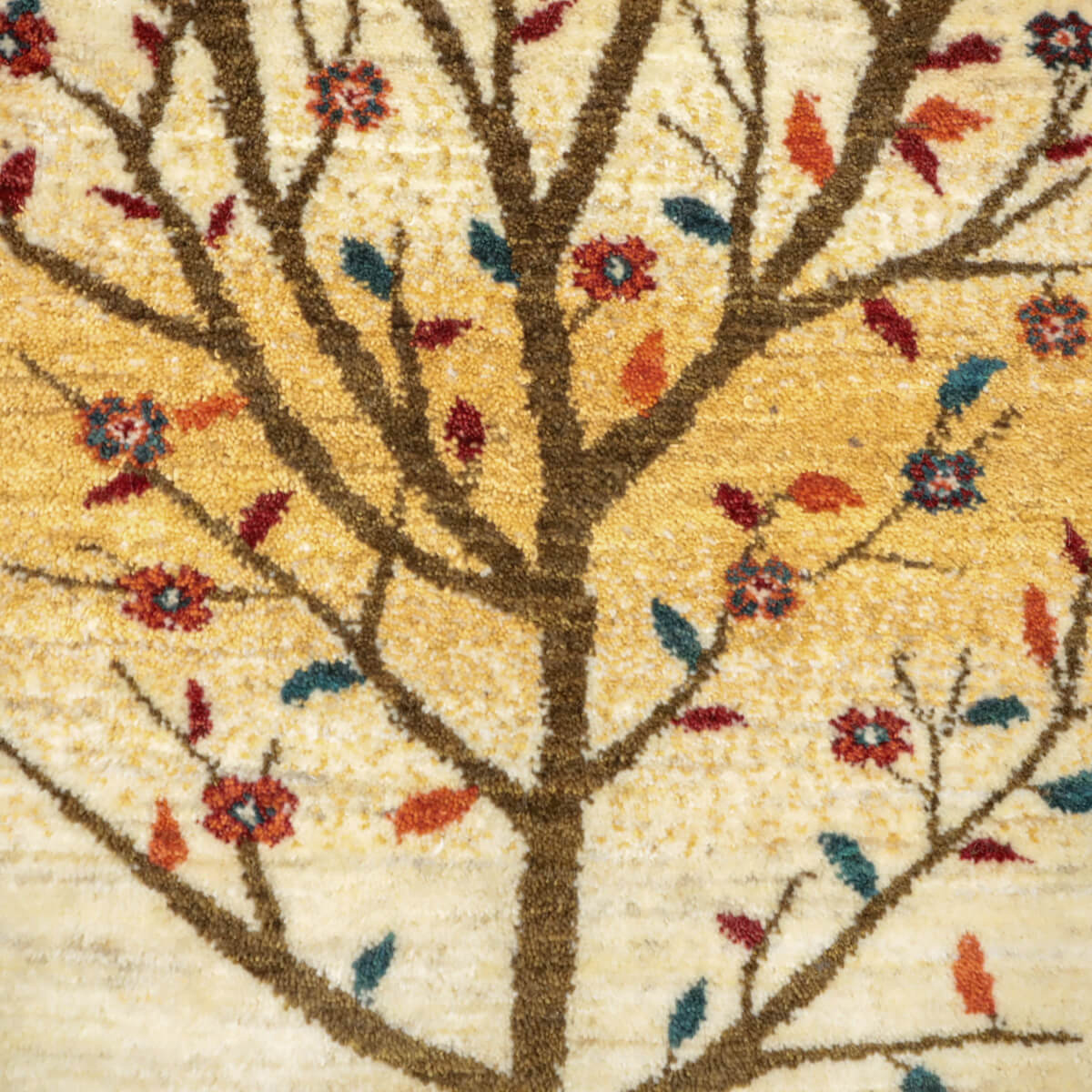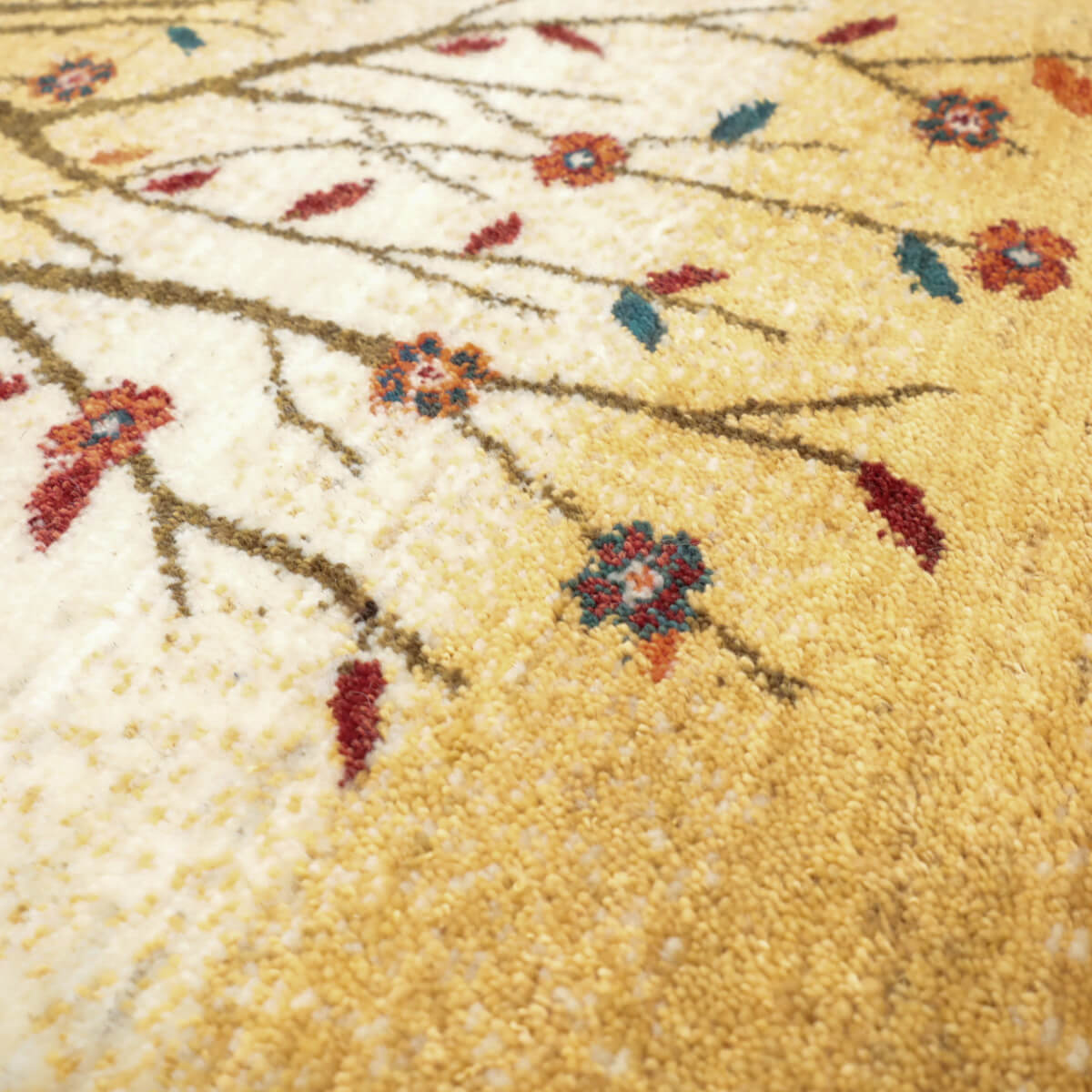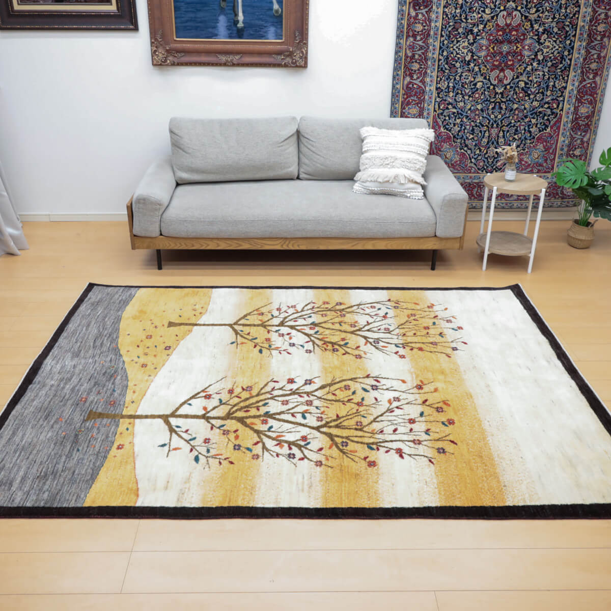 デザインの魅力 季節の移ろいを表現した二本の樹木が、黒い縁取りで引き締められた洗練された構図です。草花が散る風景は穏やかで、四季を感じさせる優美な物語性があります。リビングに飾るだけで、自然との繋がりを感じられる芸術的な一枚になります。 色 黄金色と生成り、濃いグレーが奏でる落ち着いた色合いです。赤や紫の小さな花々がアクセントになり、全体を引き締めています。モダンな空間にも、温かみのあるお部屋にも調和しやすい、時間が経つほど魅力が増す色選びです。 質感の良さ イラン産ギャッベ特有の、丁寧に織り込まれた密度の高いウールが、柔らかく弾力のある踏み心地を実現しています。細部まで丁寧に仕上げられた織目と、天然素材ならではのぬくもりが、毎日のご使用で深い風合いを醸し出します。