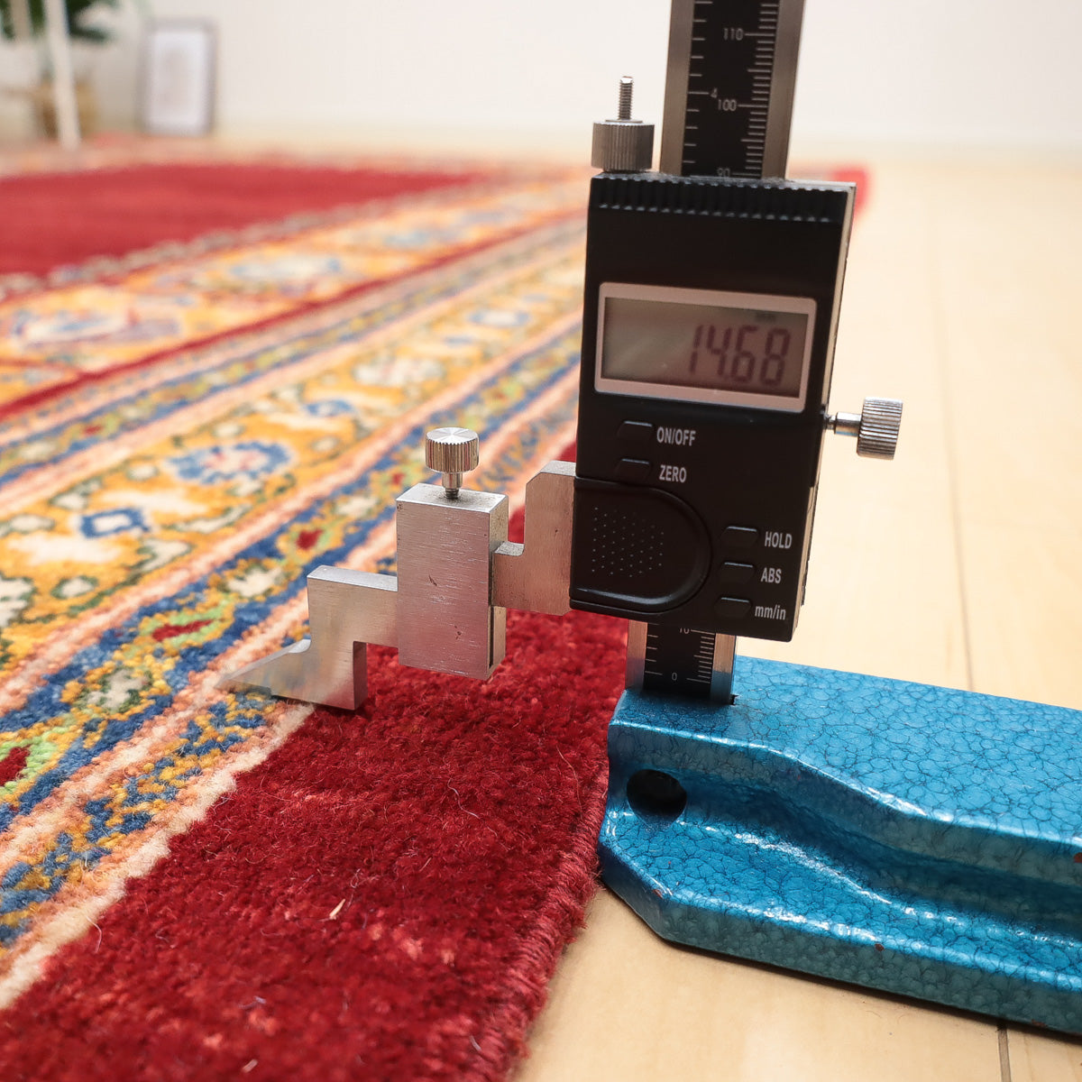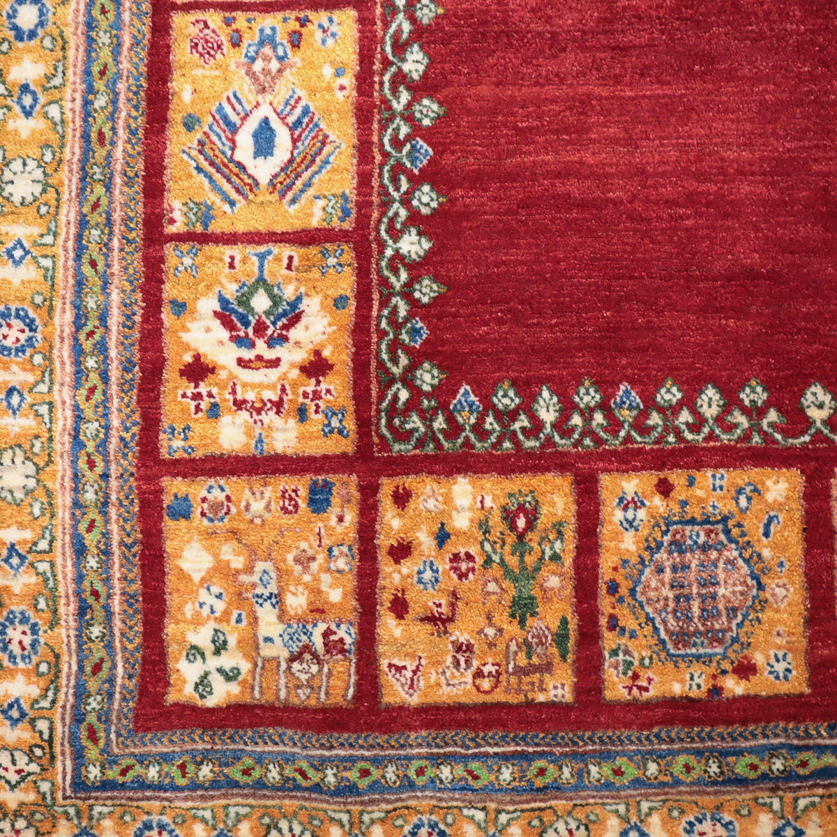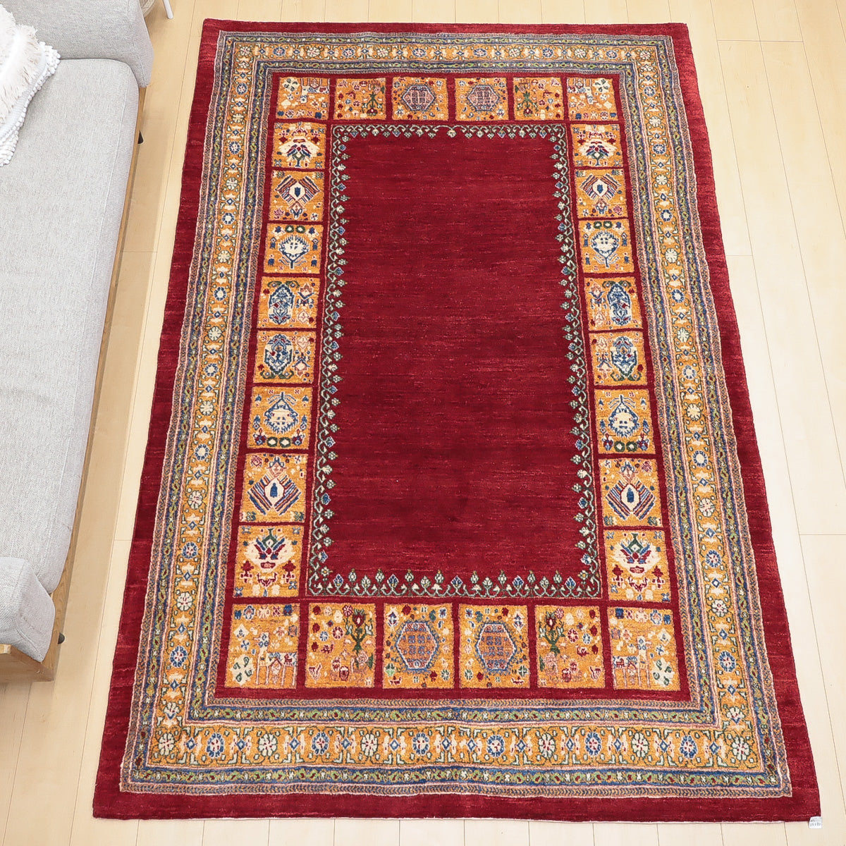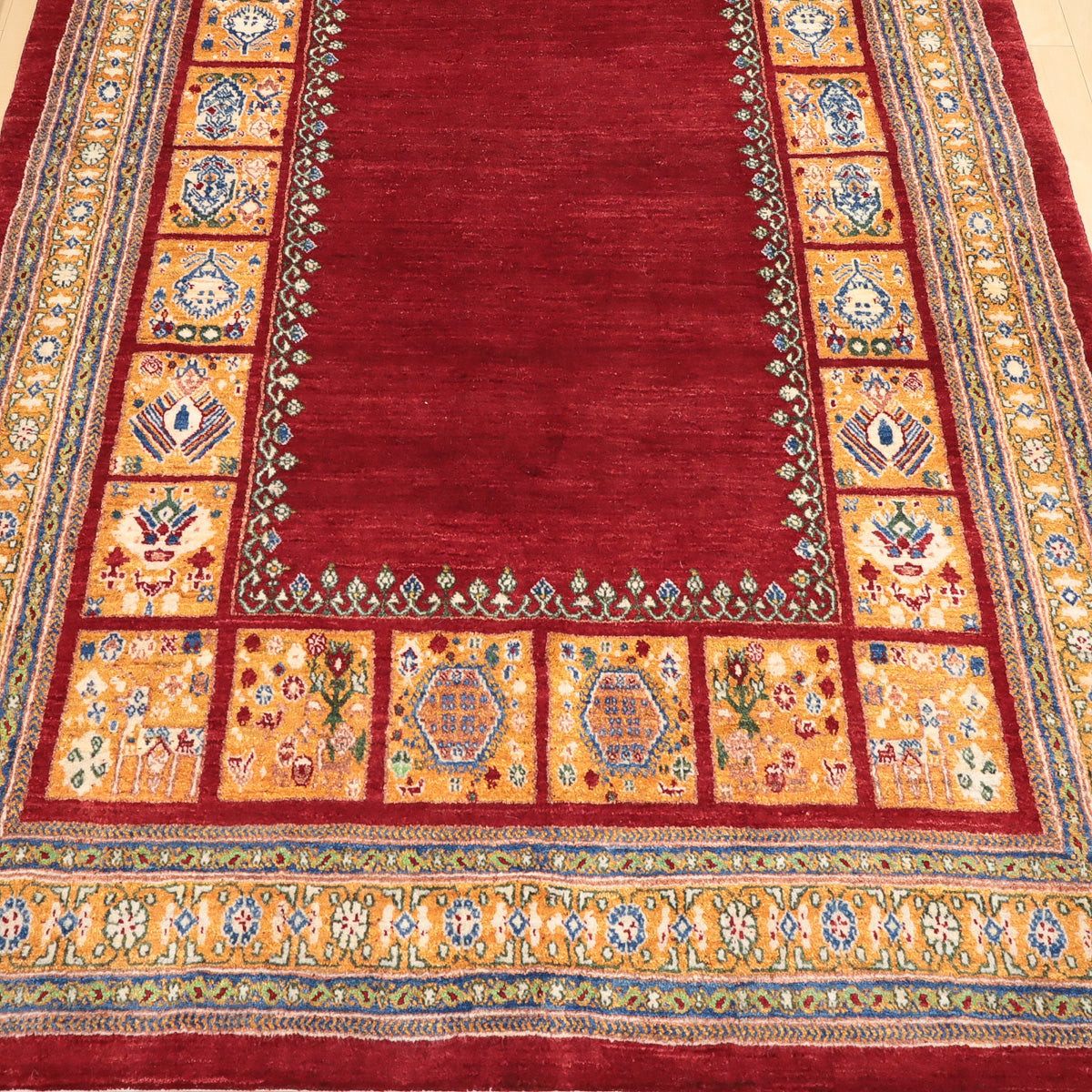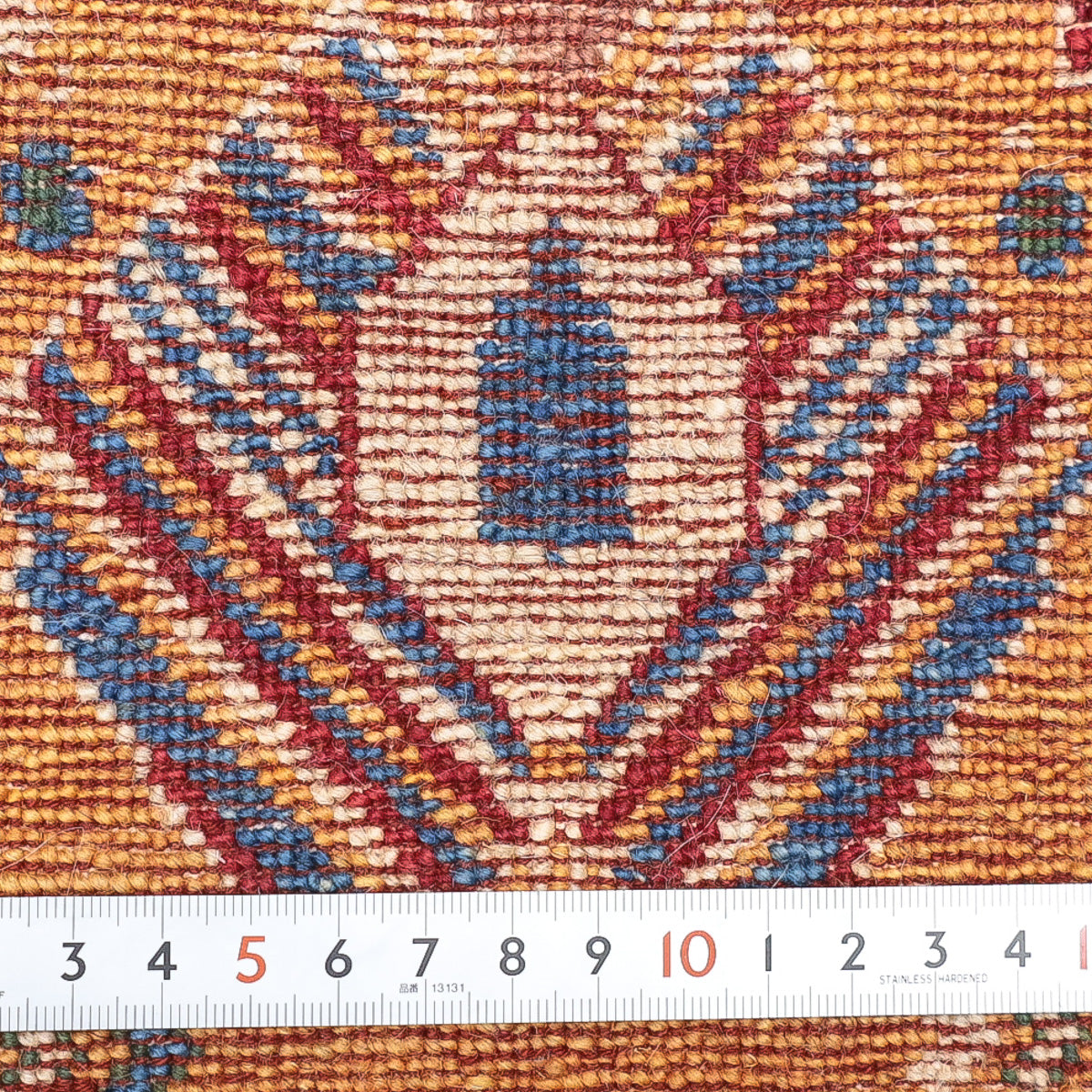 織りは、10cmあたり、およそ40から45目という普通のギャッベの数倍にもなる大変細かなルリバフ。抜け毛が少なく、手触りはふわりと柔らか。踏んだ時やんわりと沈み込む踏み心地です。腕の良い選りすぐられた織り子だけが手掛ける極上の手仕事です。