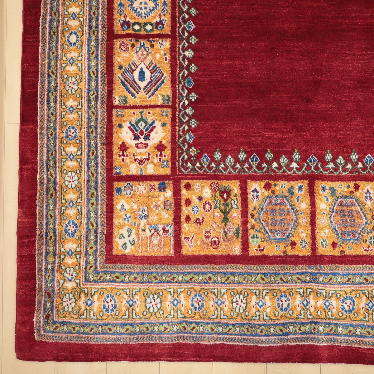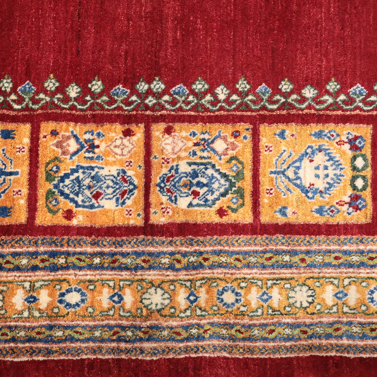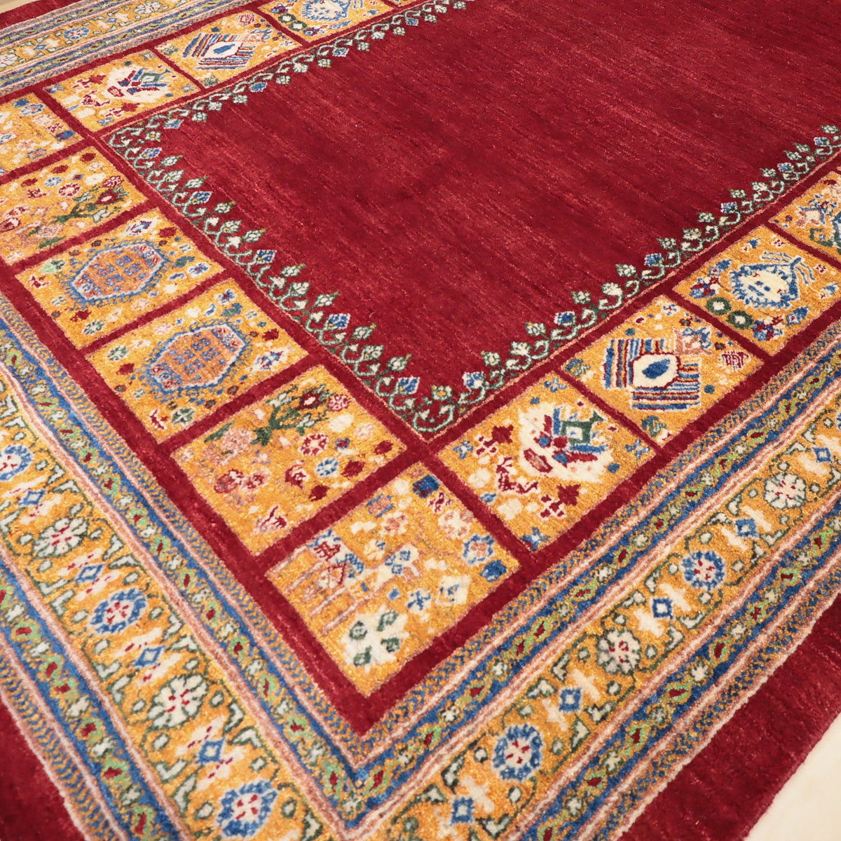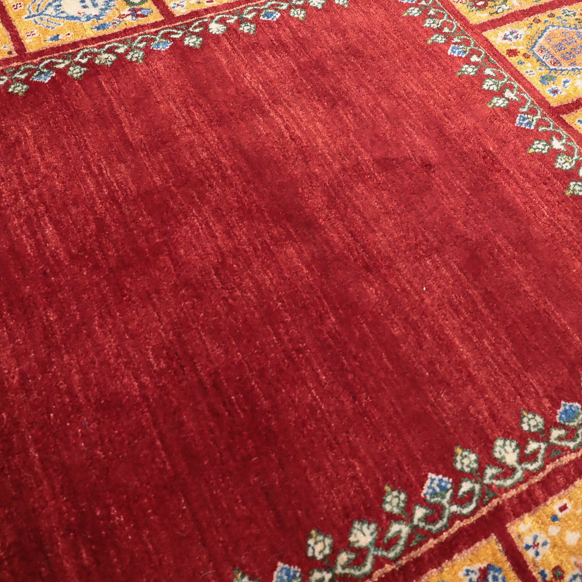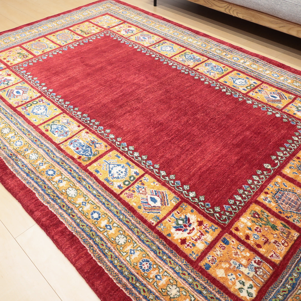 温かみのある赤がベース、濃淡のグラデーションが細かく重なり合って美しい色の変化となっています。明るいオレンジと草花の伝統柄で太く囲んだボリューム感のある伝統的なルリバフデザインです。