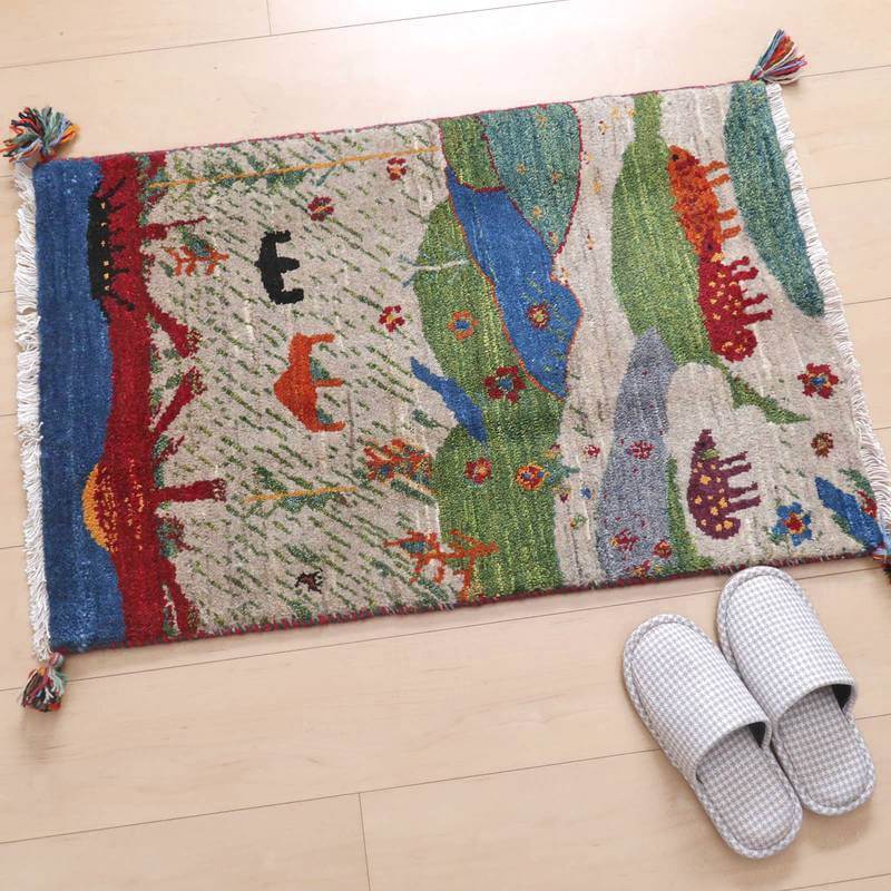 遊牧生活のテントの周りに広がる大自然の景色を落ち着いたアースカラーで描いたランドスケープ。ユニークな可愛らしさがあってお子様用のラグとしてもおすすめです。