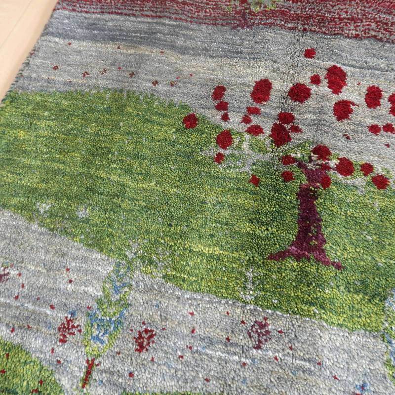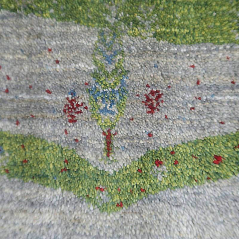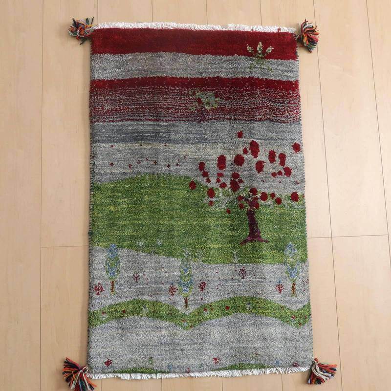 緑の草原と太陽の照り返し、広がりのある風景をギャッベに写しとった絵本の挿絵のような幻想的な雰囲気のある美しいランドスケープデザインです。シックなグレーが落ち着いたカラー。右端で88センチ、左端で90センチと長さに手織りならではの少しの違いがございます。