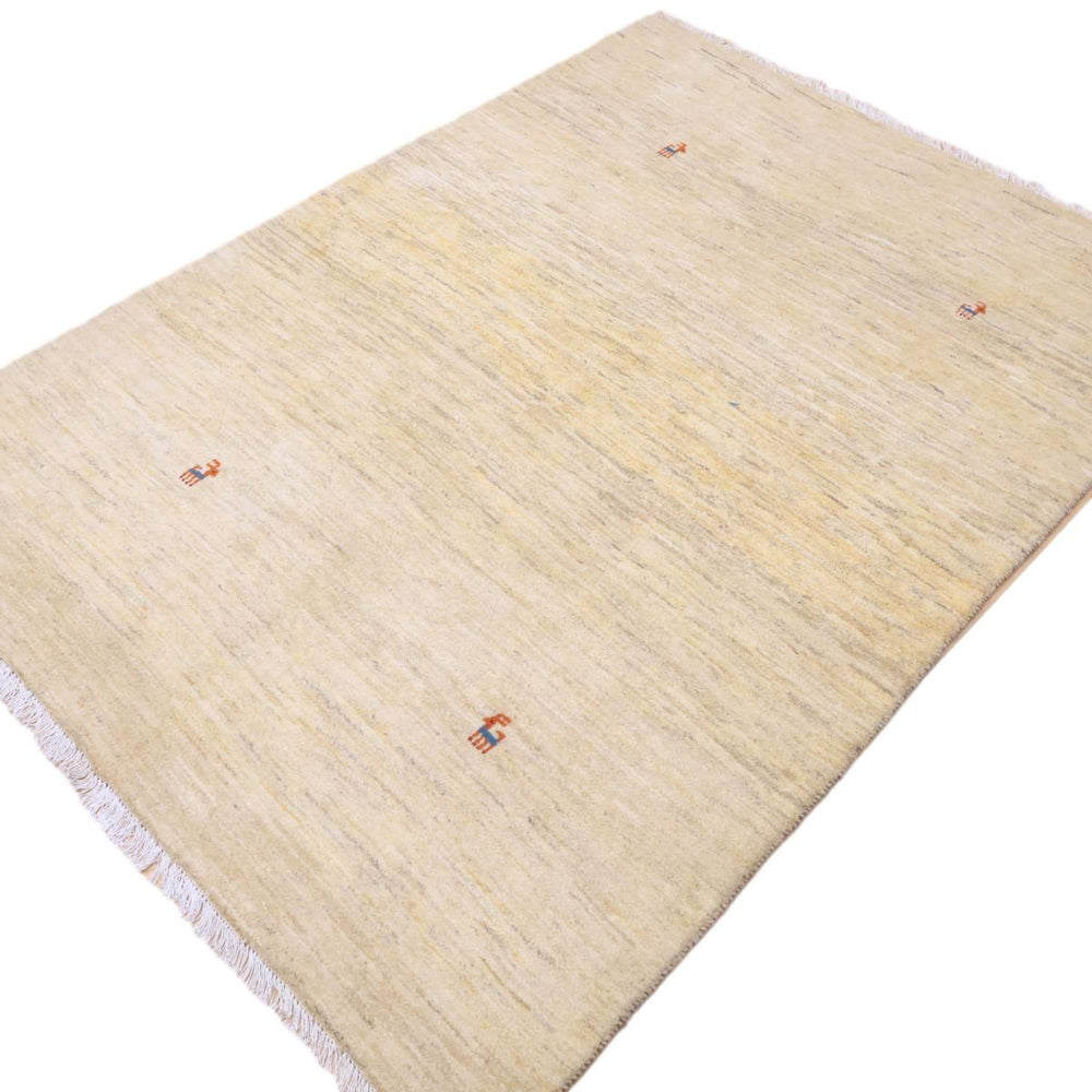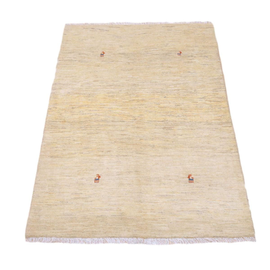 羊の毛色をそのまま活かした無染色の羊色のベースは、どんな場所にも似合うナチュラルな風合い。薄いグレーやベージュのグラデーションがやんわり入った、シンプルなデザインのギャッベです。