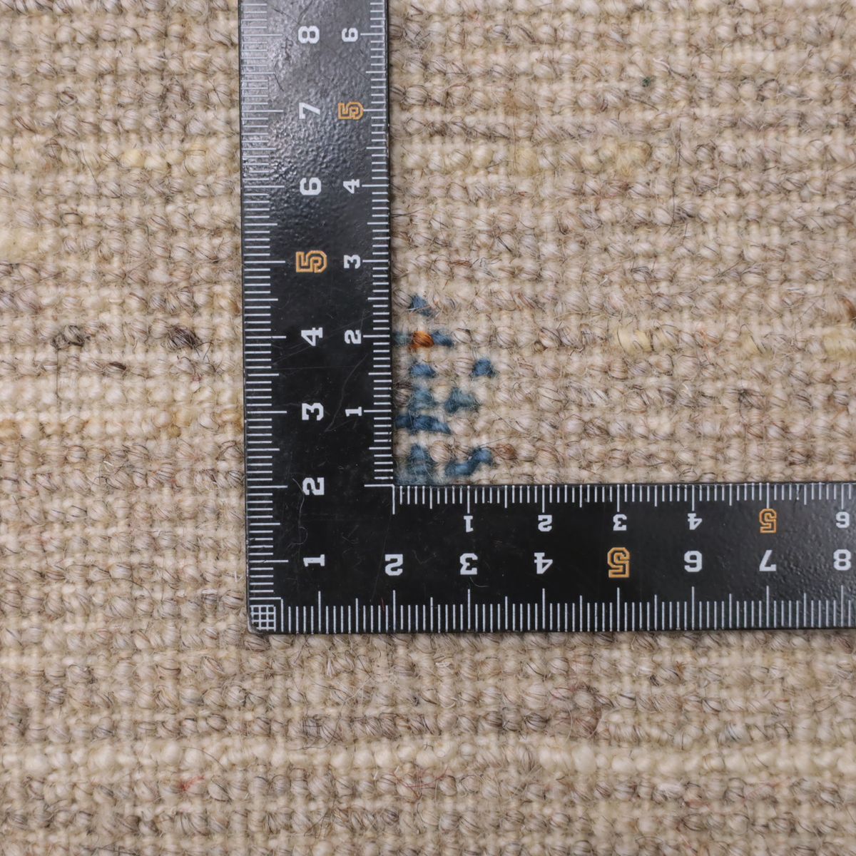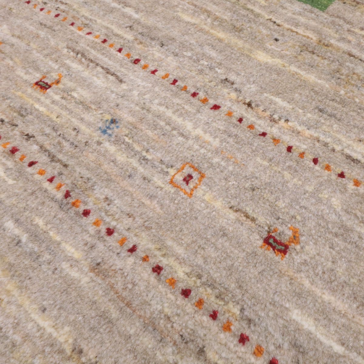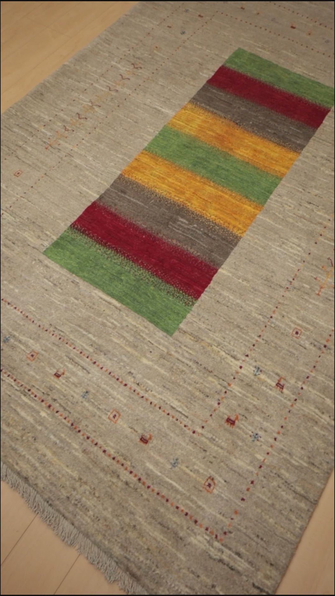 羊の毛色をそのまま活かした無染色の羊色のベースは、どんな場所にも似合うナチュラルな風合い。薄いグレーやベージュのグラデーションがやんわり入った、シンプルなデザインのギャッベです。