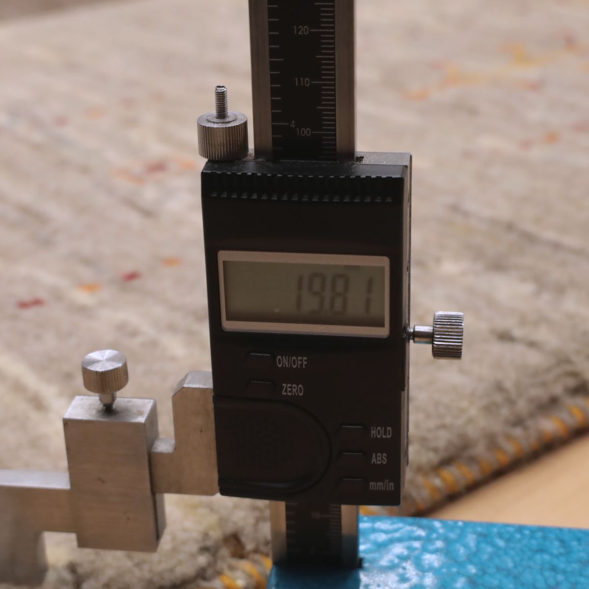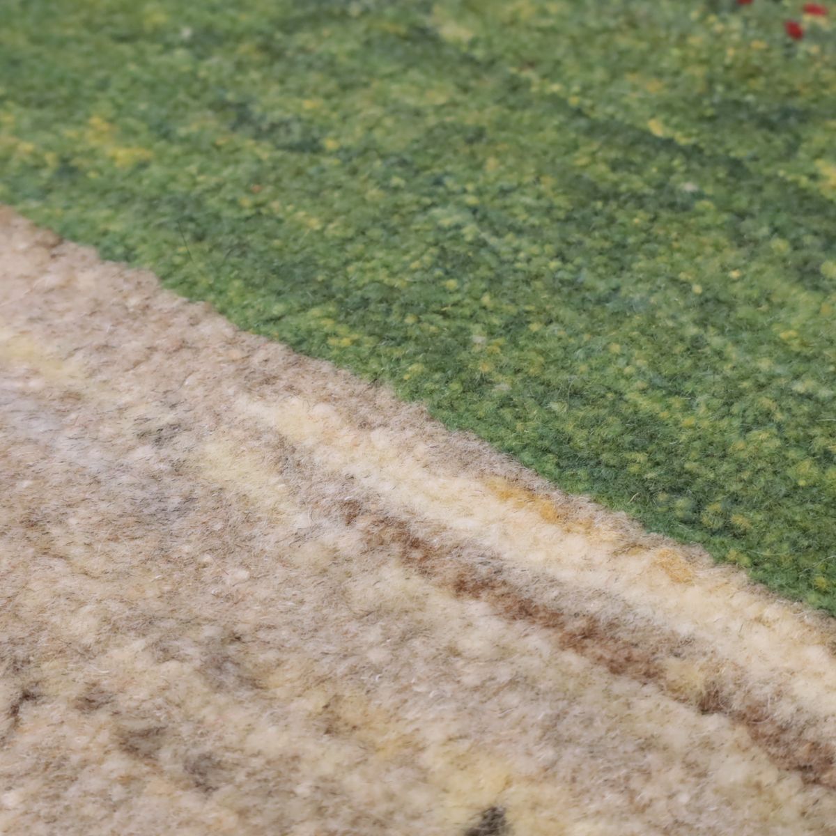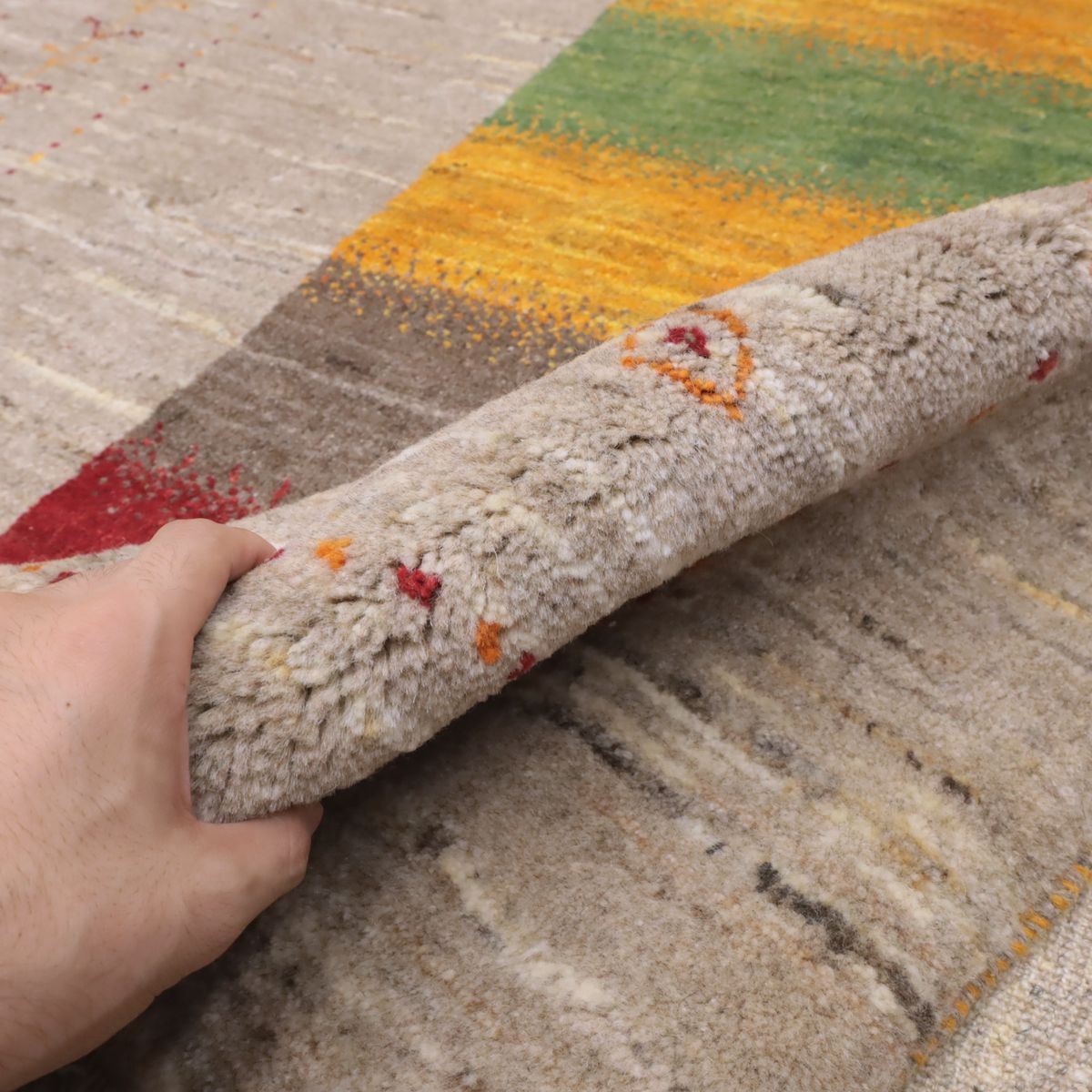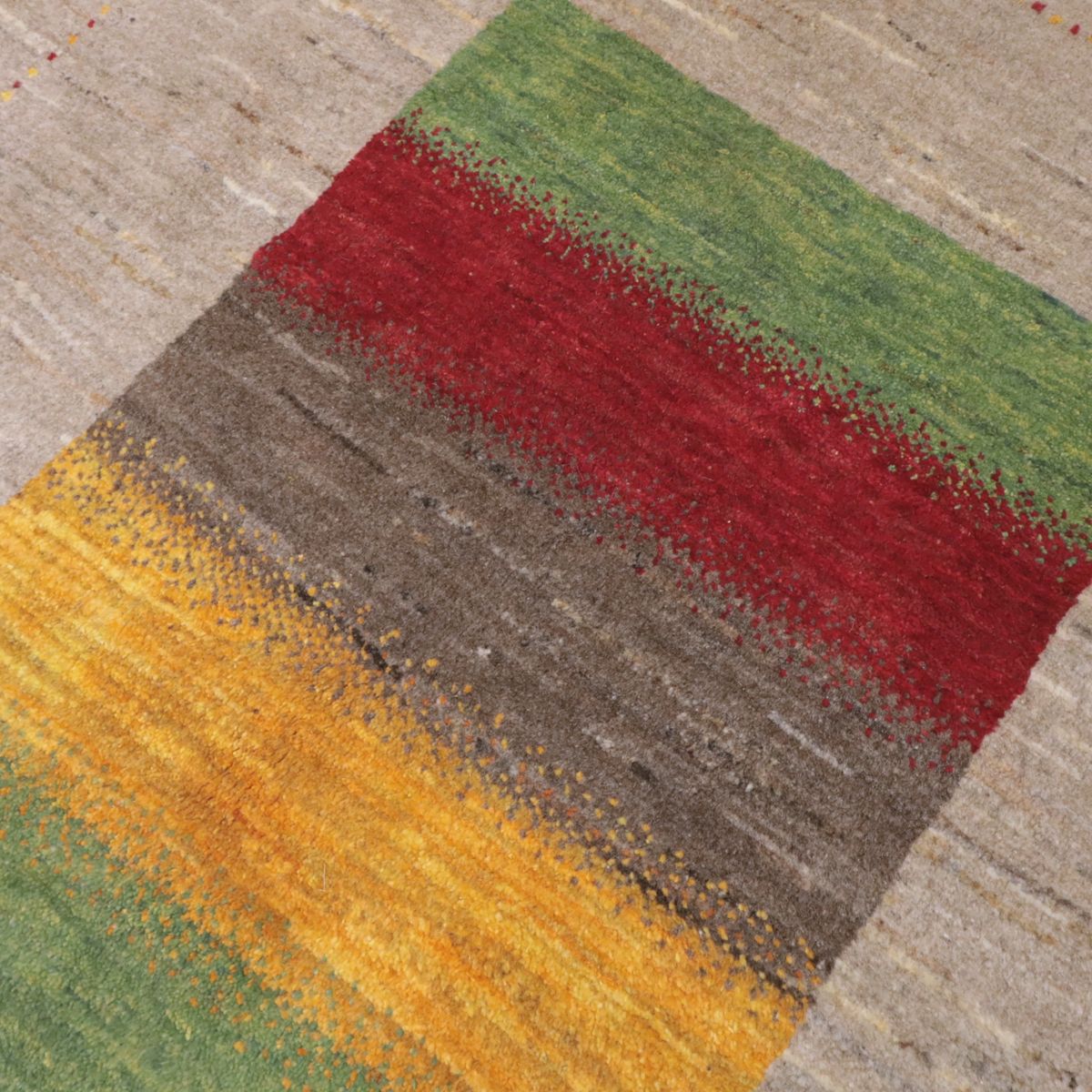羊の毛色をそのまま活かした無染色の羊色のベースは、どんな場所にも似合うナチュラルな風合い。薄いグレーやベージュのグラデーションがやんわり入った、シンプルなデザインのギャッベです。