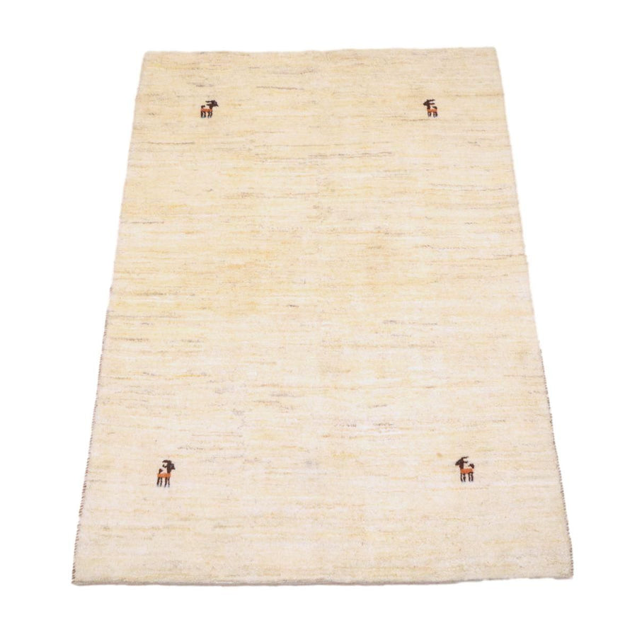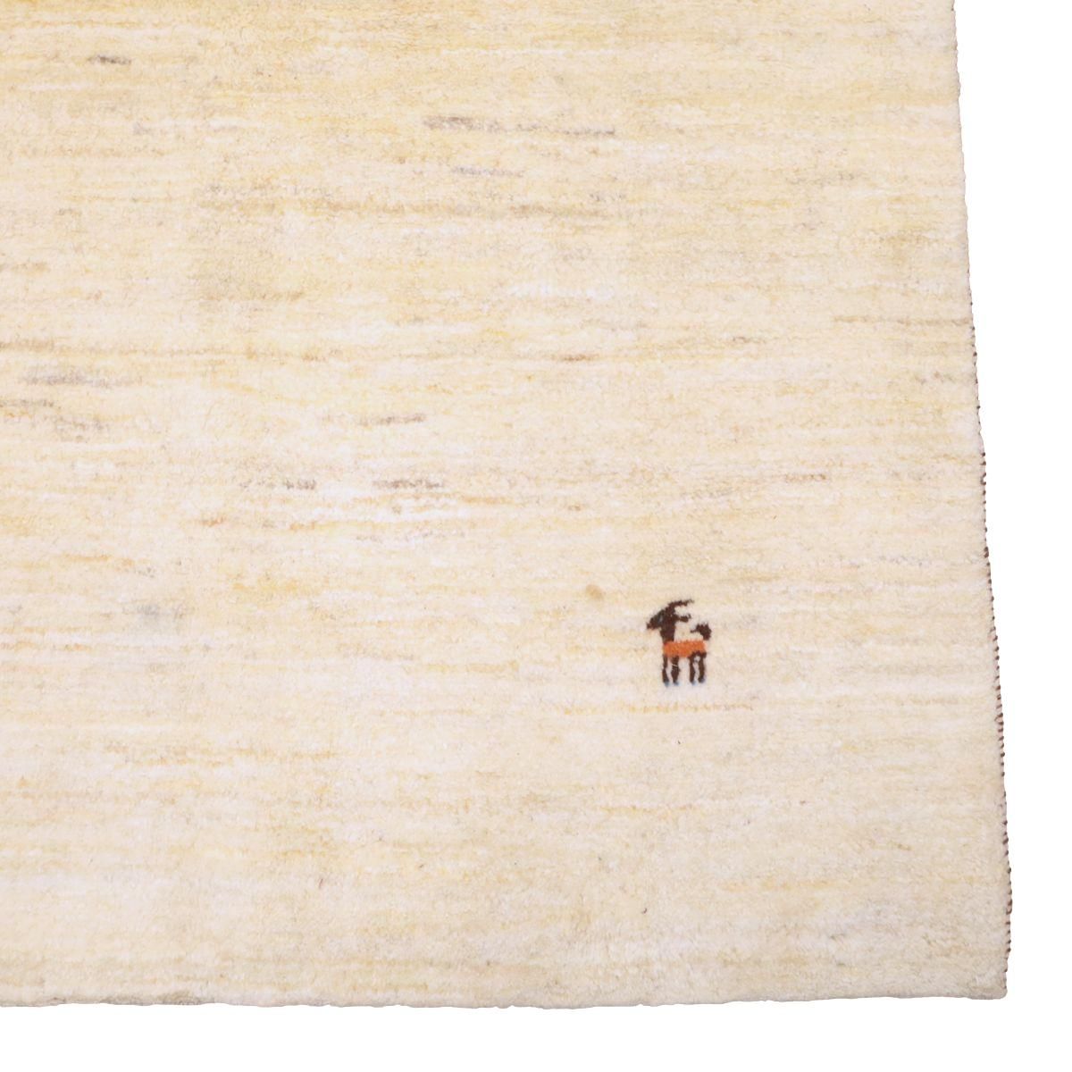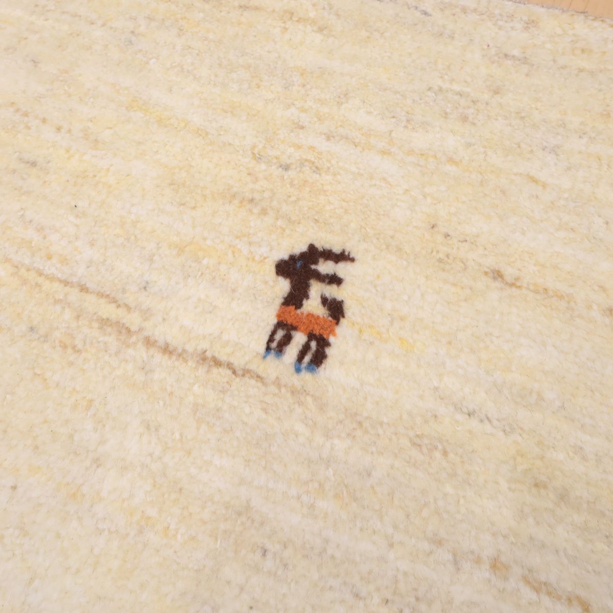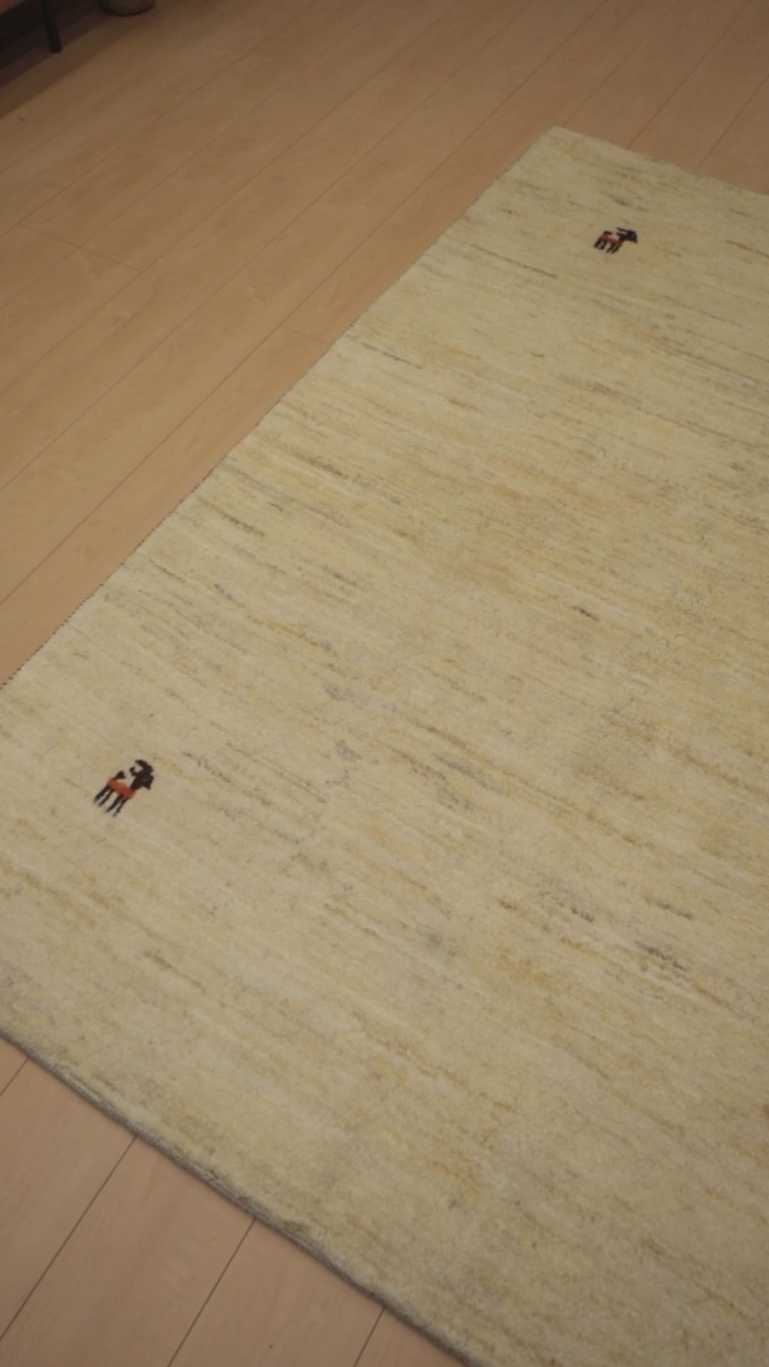 羊の毛色をそのまま活かした無染色の羊色のベースは、どんな場所にも似合うナチュラルな風合い。薄いグレーやベージュのグラデーションがやんわり入った、シンプルなデザインのギャッベです。
