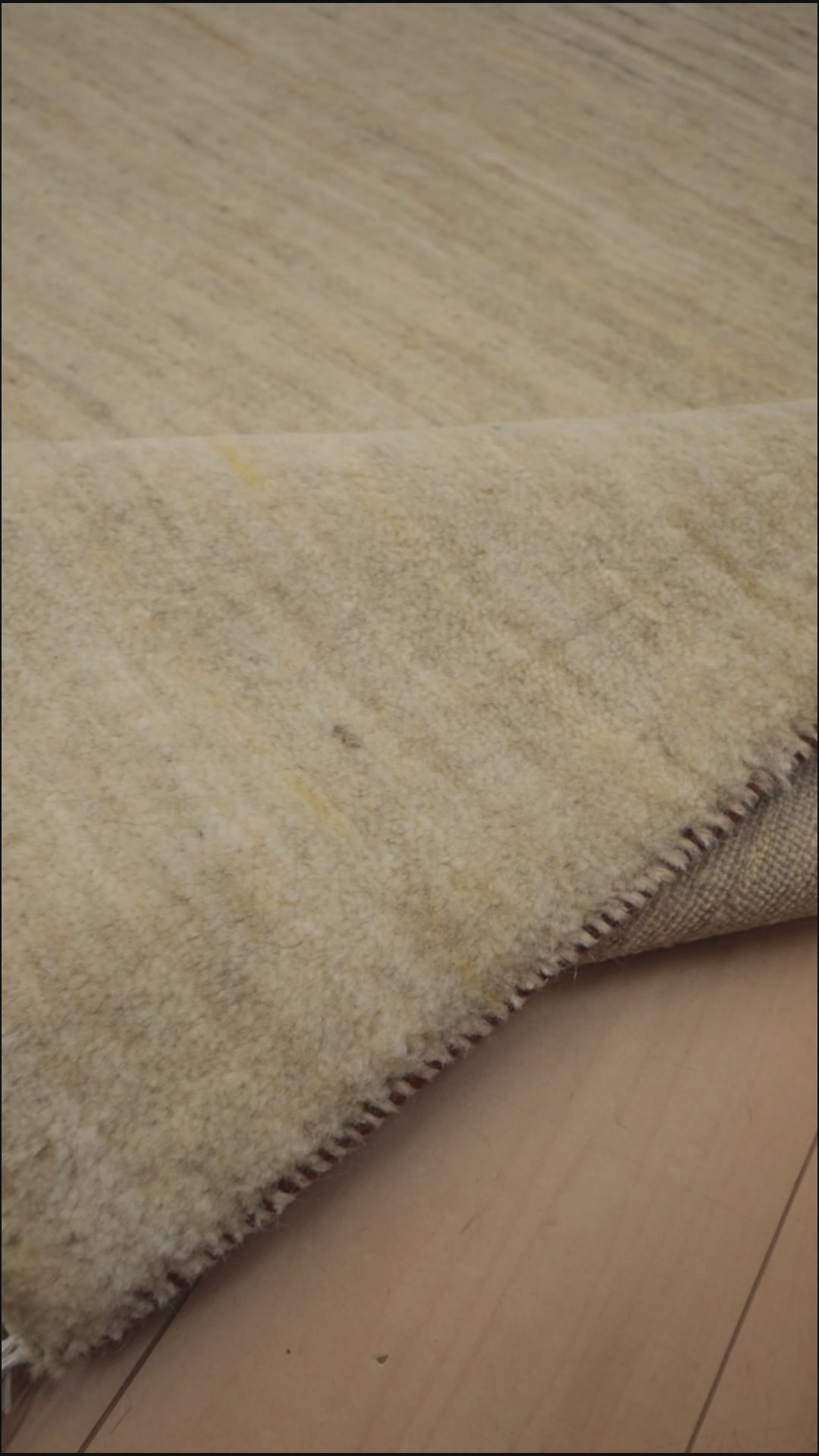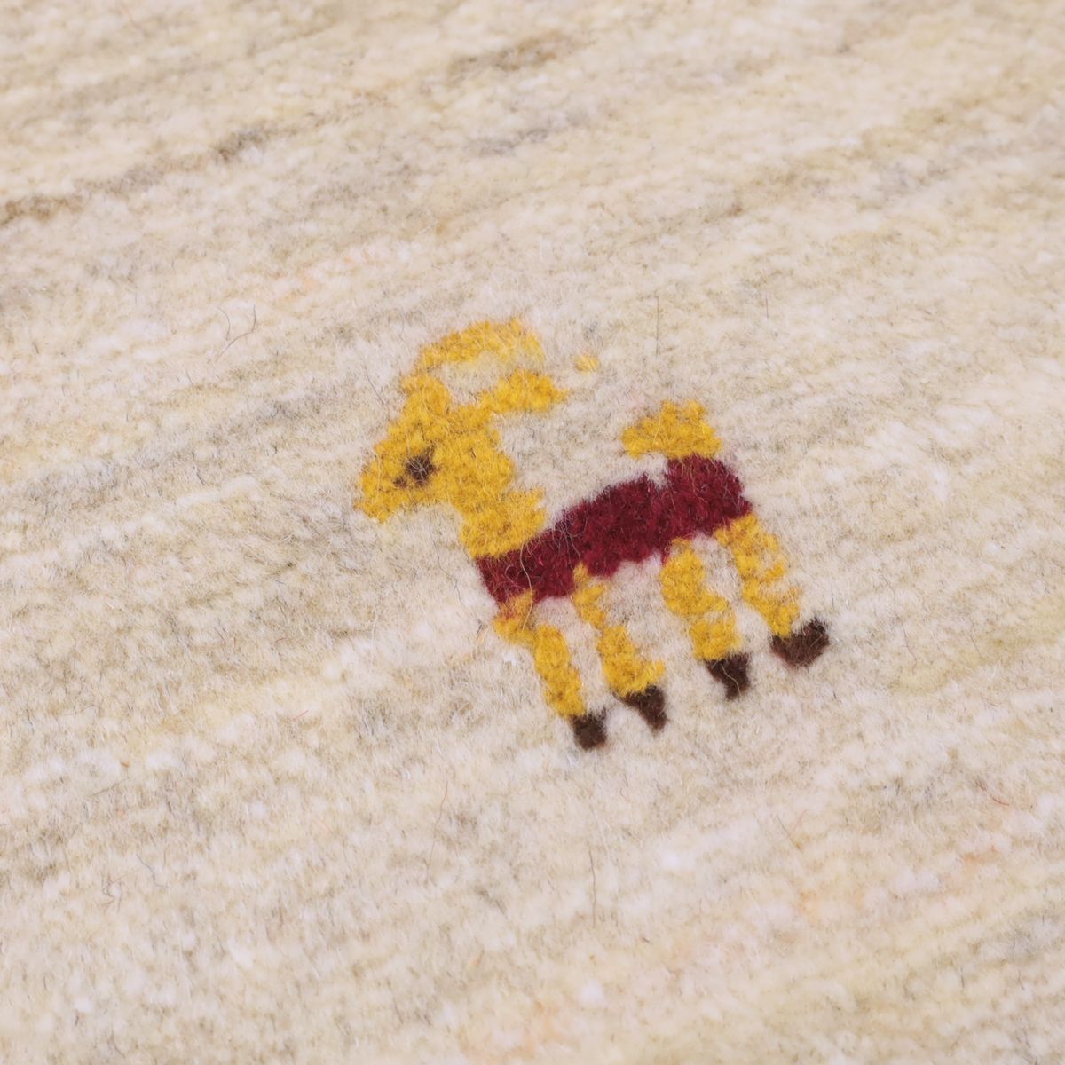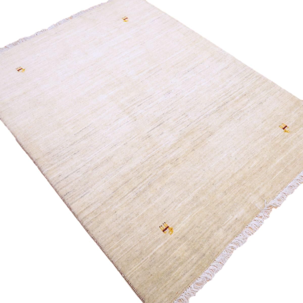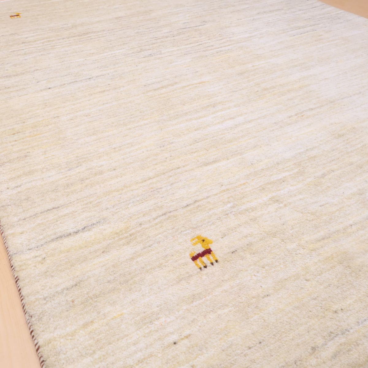 羊の毛色をそのまま活かした無染色の羊色のベースは、どんな場所にも似合うナチュラルな風合い。薄いグレーやベージュのグラデーションがやんわり入った、シンプルなデザインのギャッベです。