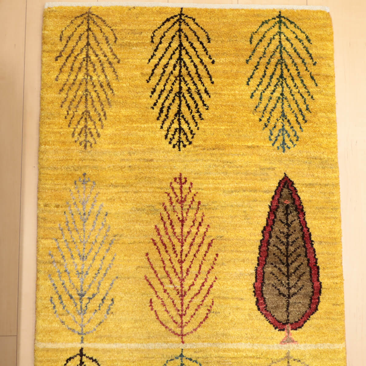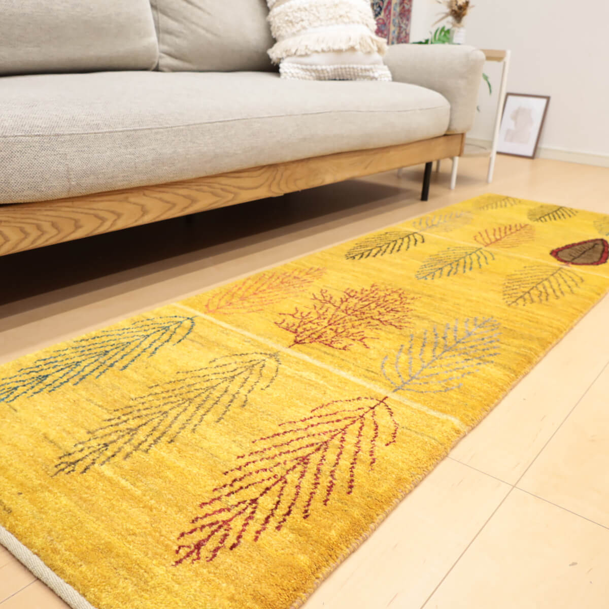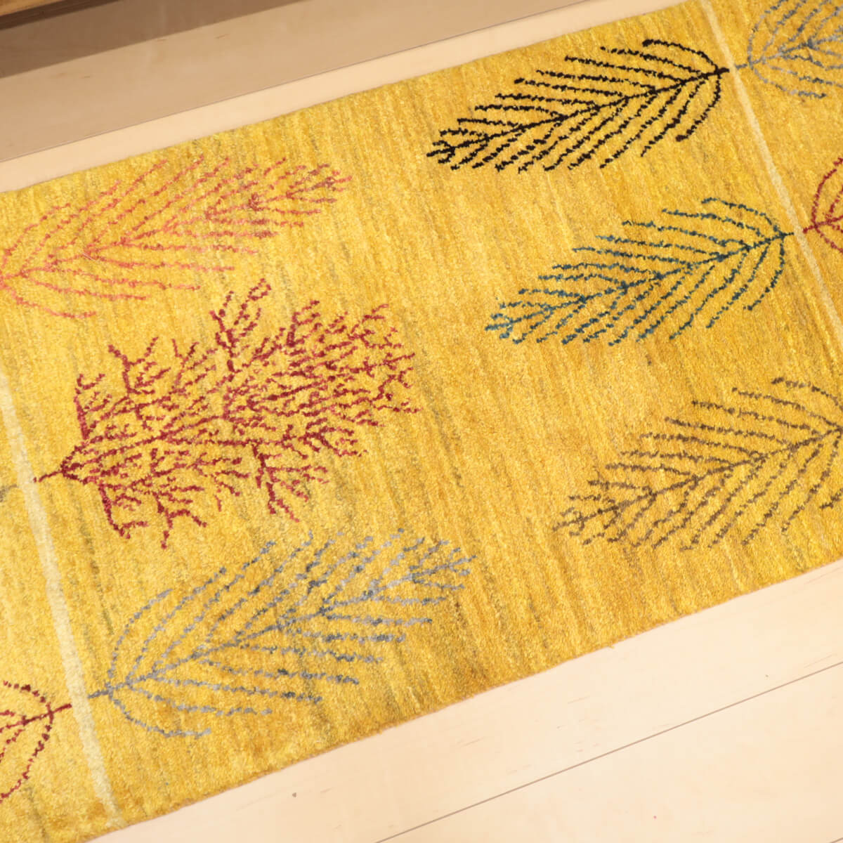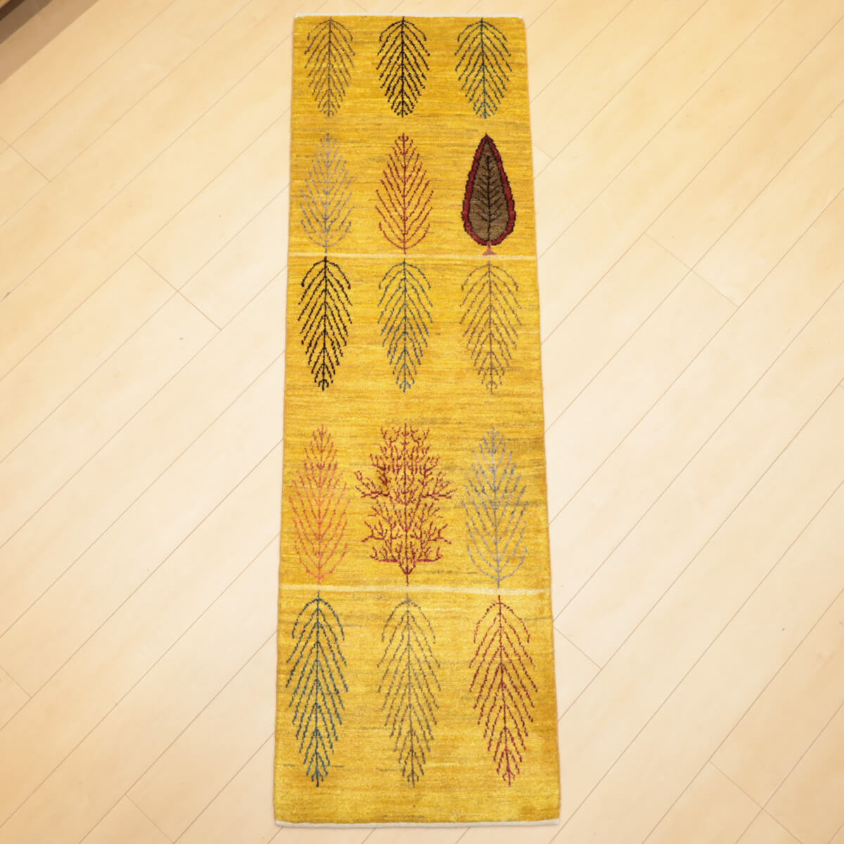 デザインの魅力 黄金色を基調に、繊細な葉文様を規則正しく並べた穏やかで洗練されたデザインです。中央にはワインレッドと深緑の濃い色合いの葉が一枚、アクセントとして配置され、シンプルながら奥深い美しさを表現しています。ランナー仕様で、玄関やリビング前に置くと上質な落ち着きが生まれます。