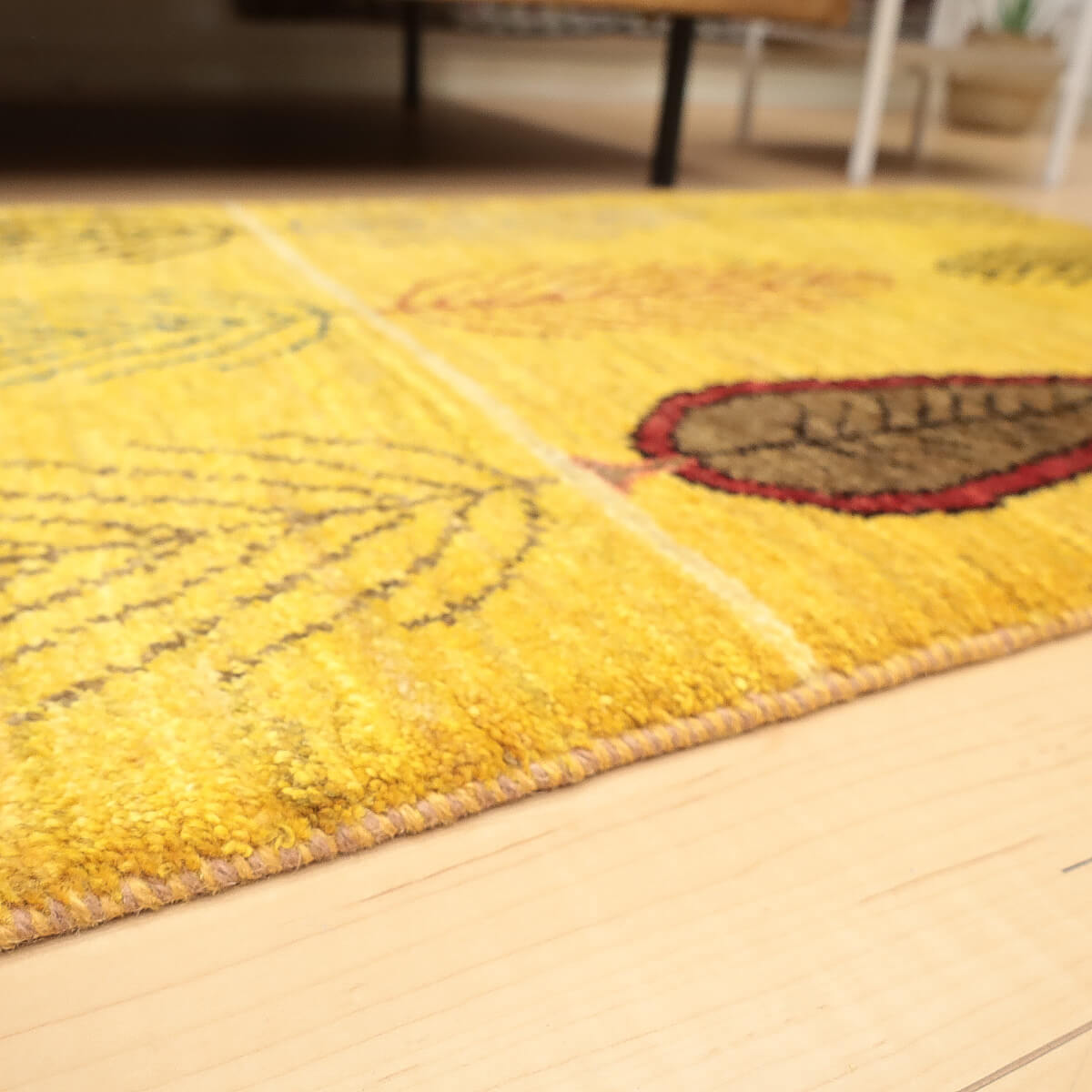 色 温かみのある黄金色の背景に、深緑、ワインレッド、グレー、さらに赤茶色の葉が調和した優雅な色合いです。秋の情景を思わせる色使いながら、どのような季節のお部屋にも自然に溶け込み、インテリアを品よくまとめます。
