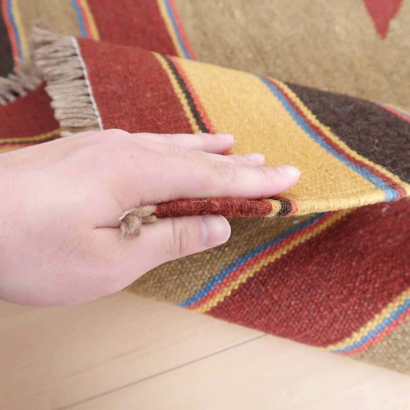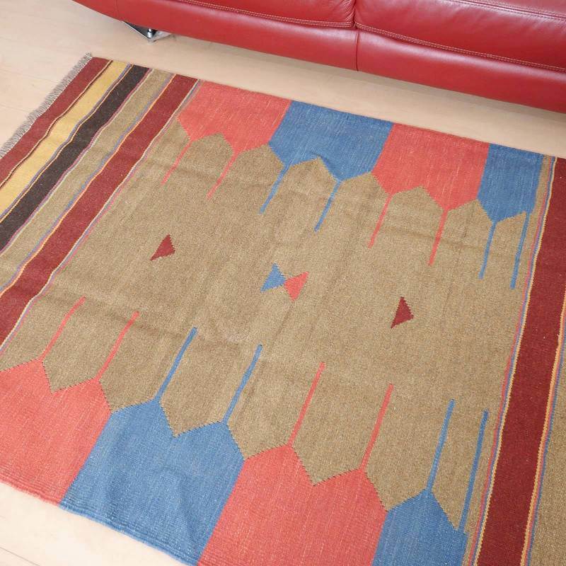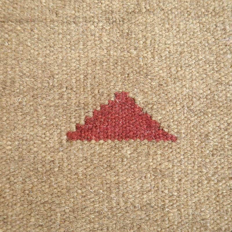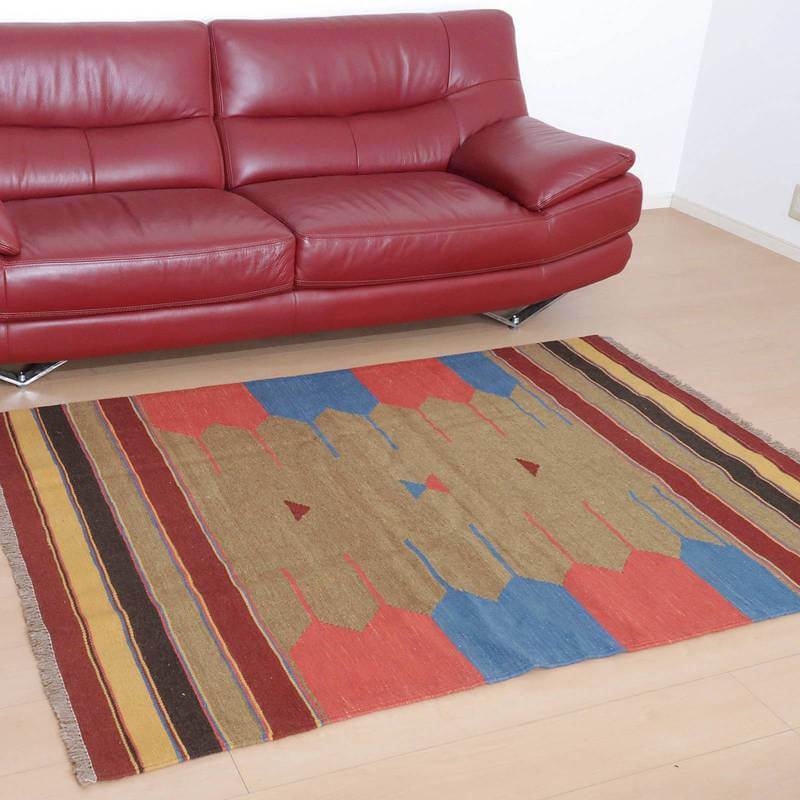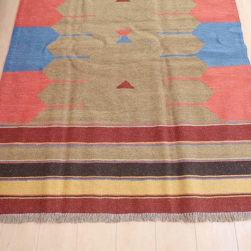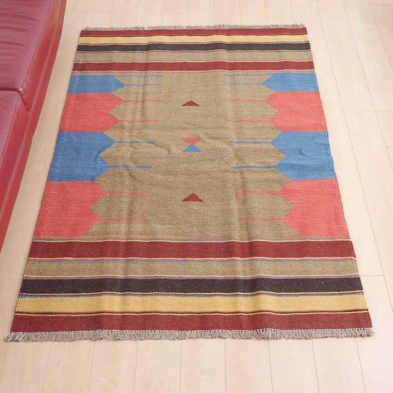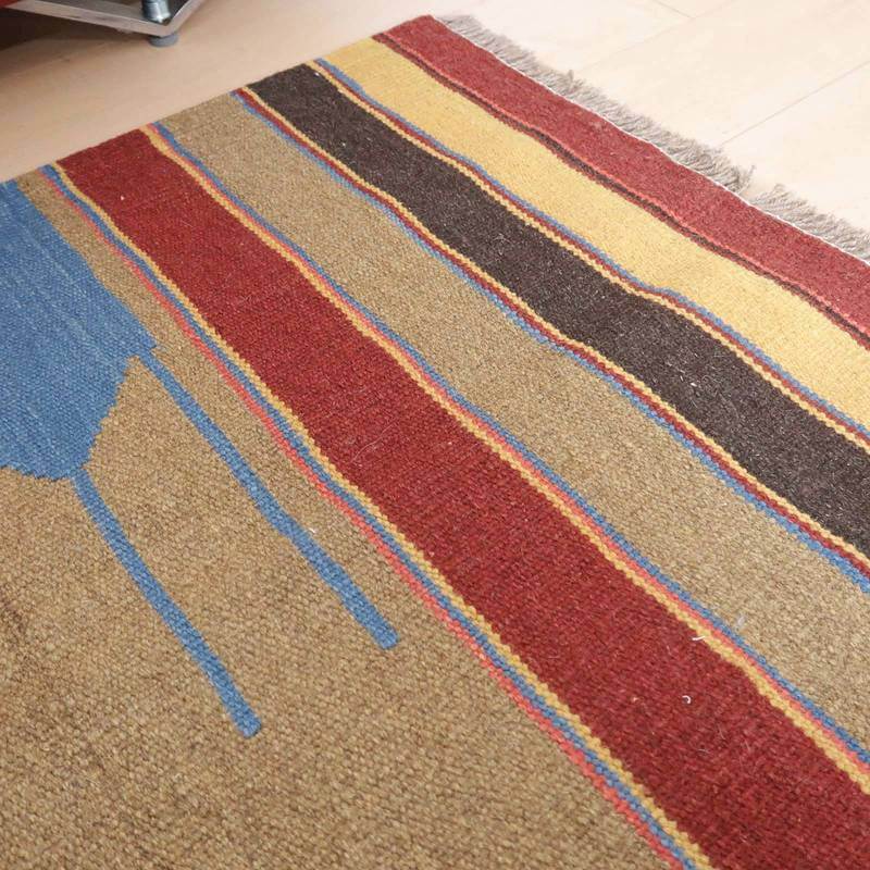 イラン南部シラーズ地方のキリムです。いくつかの色を使用した幾何学柄やギザギザ文様はリズムのある明るい雰囲気。使用している色はどれも、くすみのある落ち着いた色なので、目立たずインテリアに馴染みます。カシュガイの女性が昔ながらに織り上げたキリムなので、よく締まった丈夫な織り目で、早く仕上げる為、ゆるく粗く織られる商用生産のキリムには無い、誠実さが伝わってくる一枚です。また、平織り(ひらおり)という裏表の無い織り方で両面使えます。カシュガイ・キリムは遊牧のテント生活用の為、丈夫に織られ、洗濯も簡単、普段使いのラグとして扱いやすいキリムです。