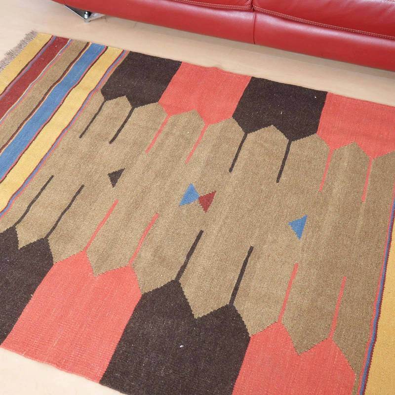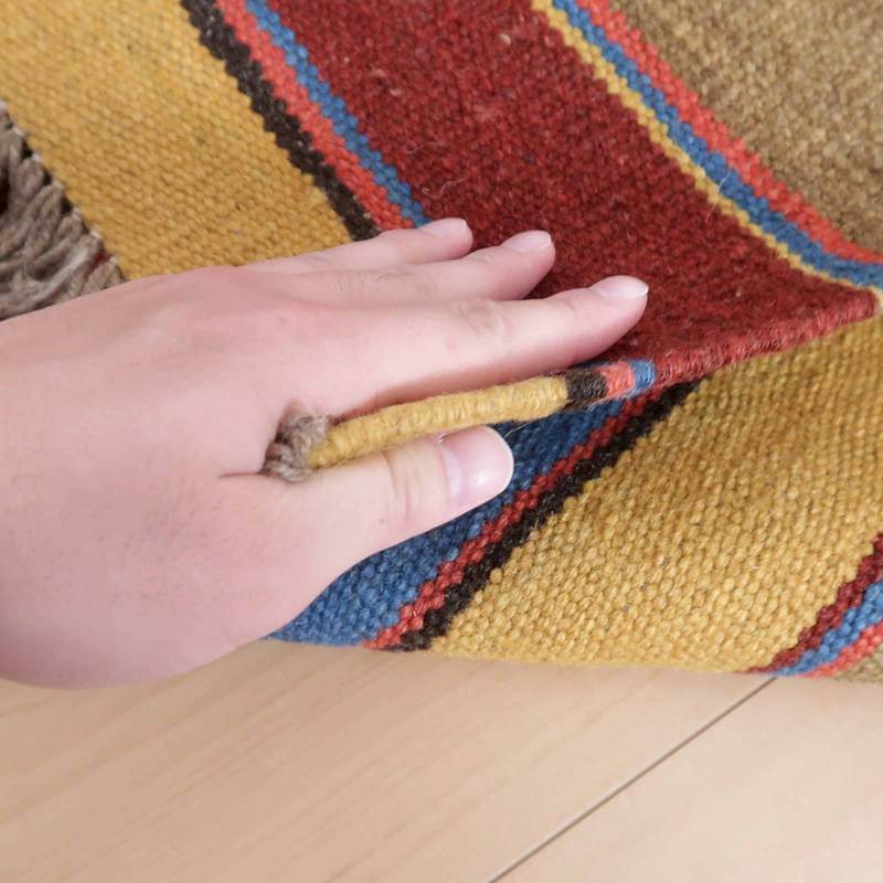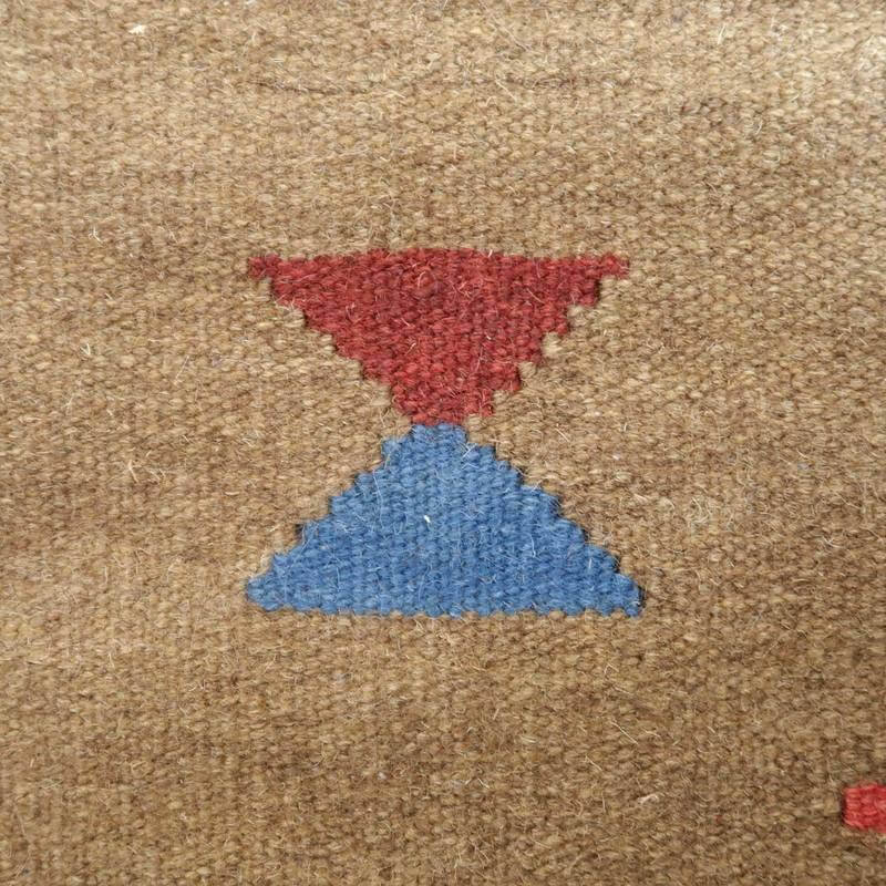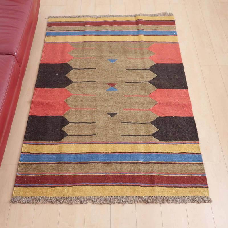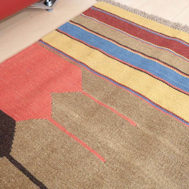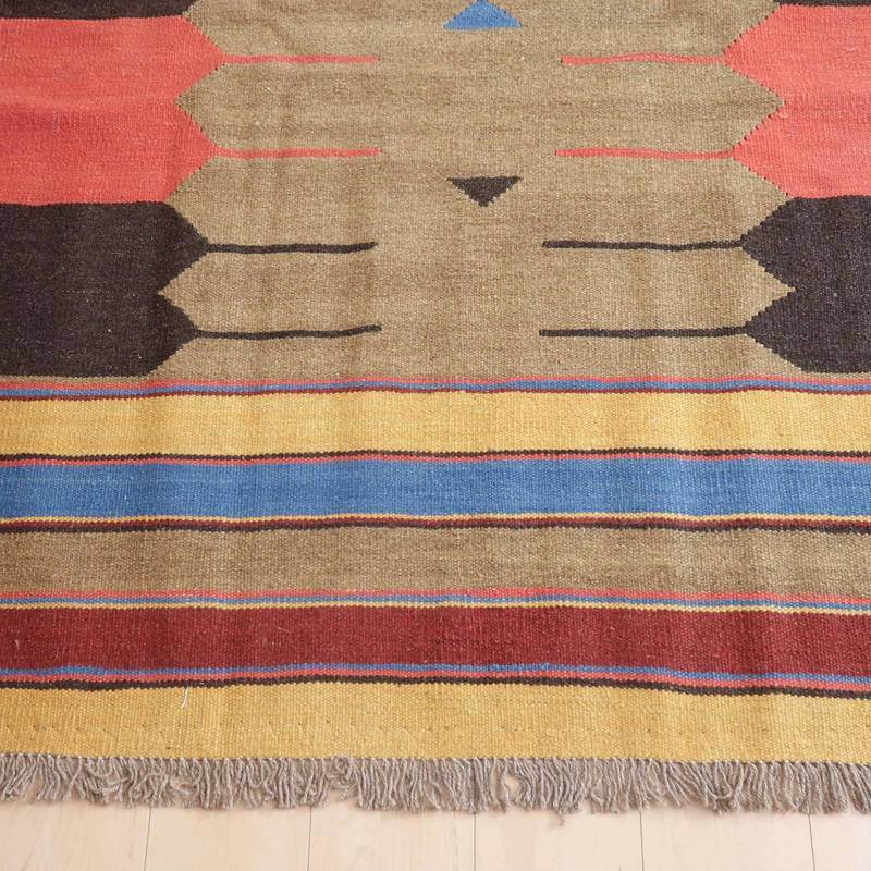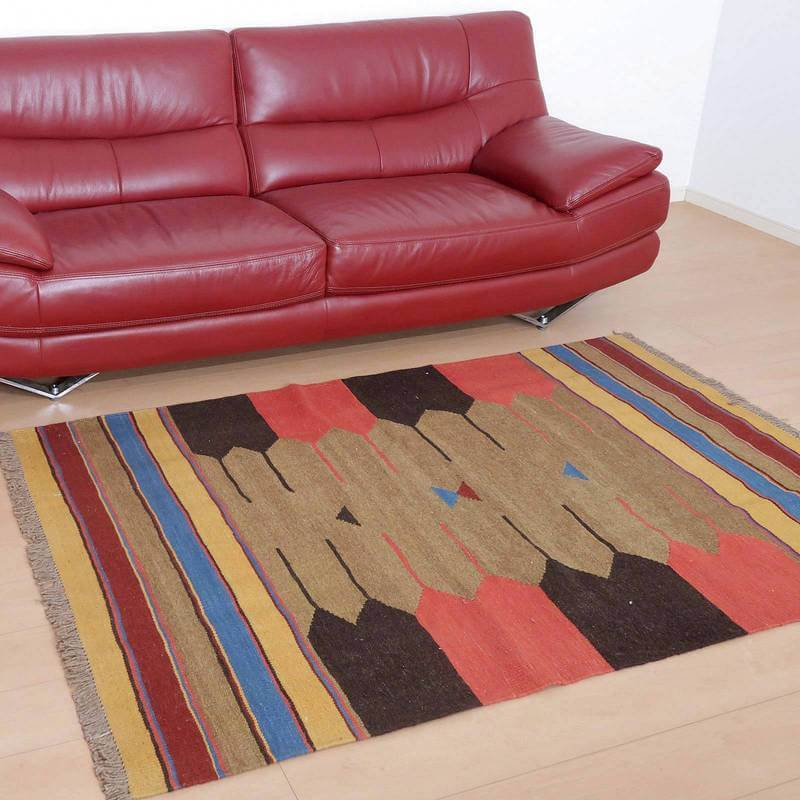 イラン南部シラーズ地方のキリムです。いくつかの色を使用した幾何学柄やギザギザ文様はリズムのある明るい雰囲気。使用している色はどれも、くすみのある落ち着いた色なので、目立たずインテリアに馴染みます。カシュガイの女性が昔ながらに織り上げたキリムなので、よく締まった丈夫な織り目で、早く仕上げる為、ゆるく粗く織られる商用生産のキリムには無い、誠実さが伝わってくる一枚です。また、平織り(ひらおり)という裏表の無い織り方で両面使えます。カシュガイ・キリムは遊牧のテント生活用の為、丈夫に織られ、洗濯も簡単、普段使いのラグとして扱いやすいキリムです。