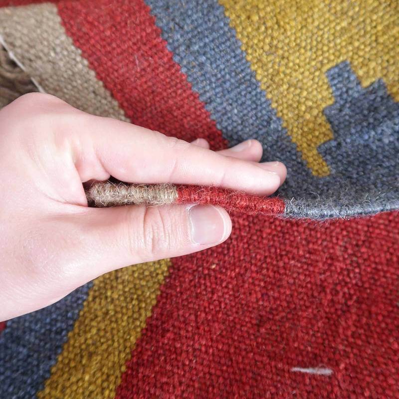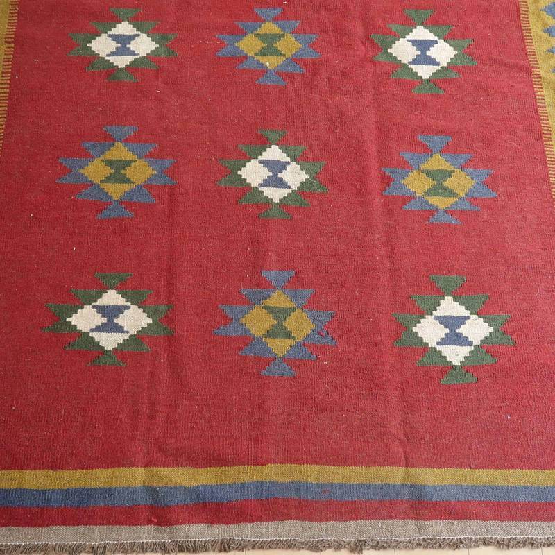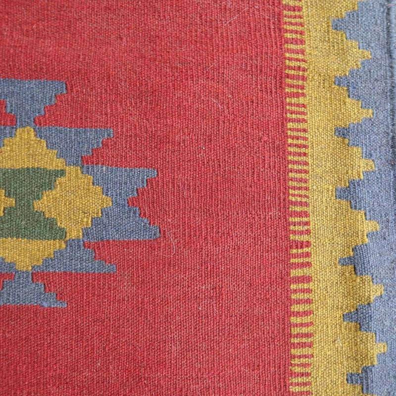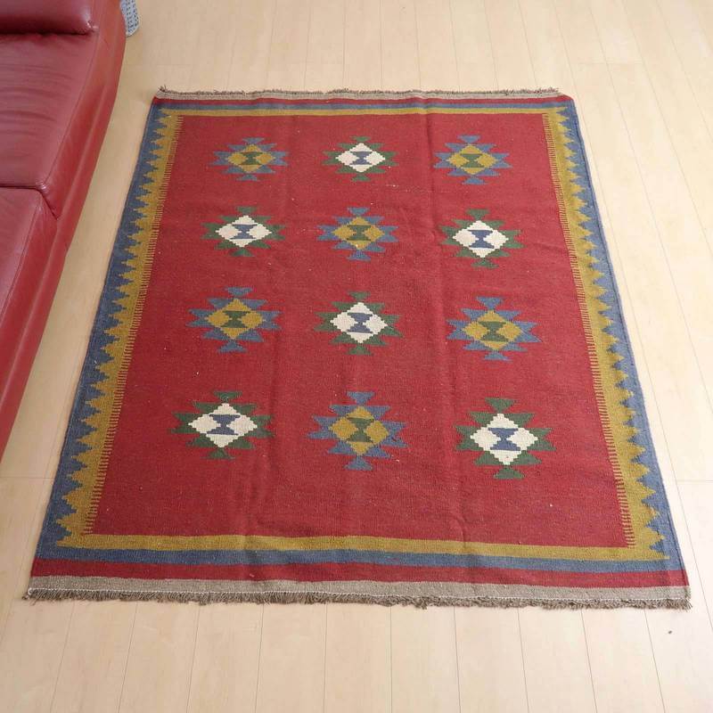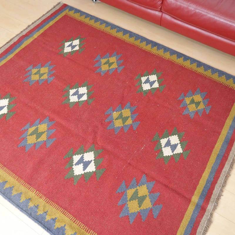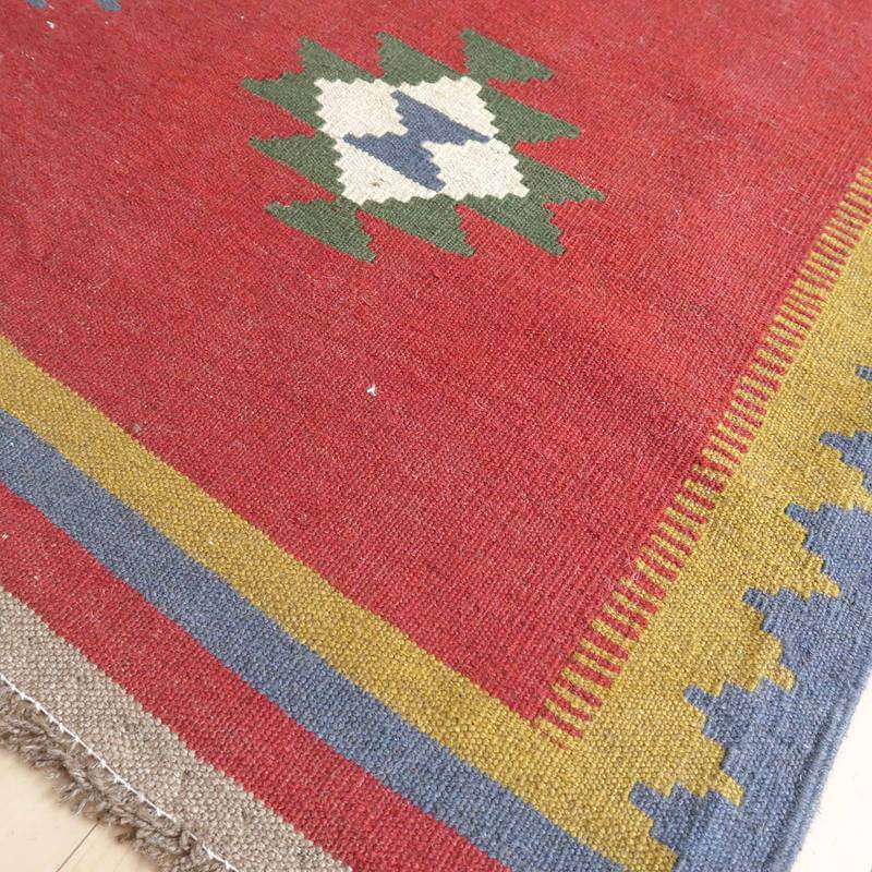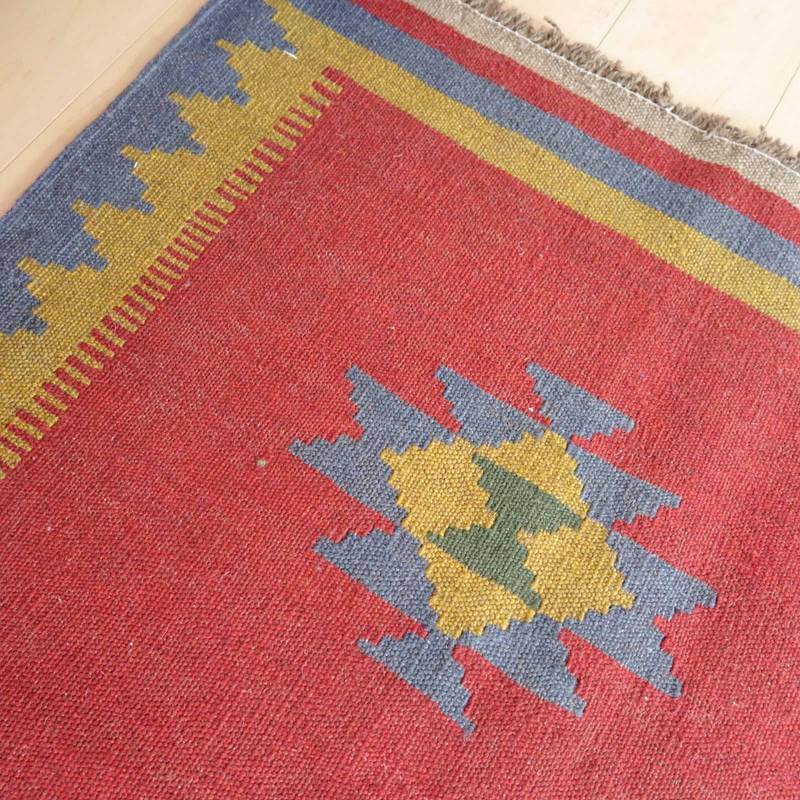 イラン南部シラーズ地方のキリムです。いくつかの色を使用した幾何学柄やギザギザ文様はリズムのある明るい雰囲気。程よく落ち着いた色とウールの風合いが、やさしくインテリアに馴染みます。カシュガイの女性が昔ながらに織り上げたキリムなので、よく締まった丈夫な織り目で、早く仕上げる為、ゆるく粗く織られる商用生産のキリムには無い、誠実さが伝わってくる一枚です。また、平織り(ひらおり)という裏表の無い織り方で両面使えます。カシュガイ族の遊牧のテント生活用の為、丈夫に織られ、洗濯も簡単、床なじみの良い適度な厚さで、普段使いのラグとして大変使いやすいキリムです。