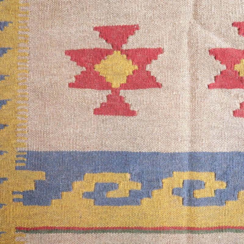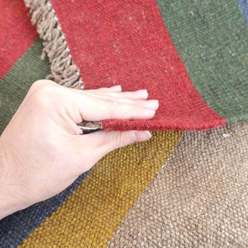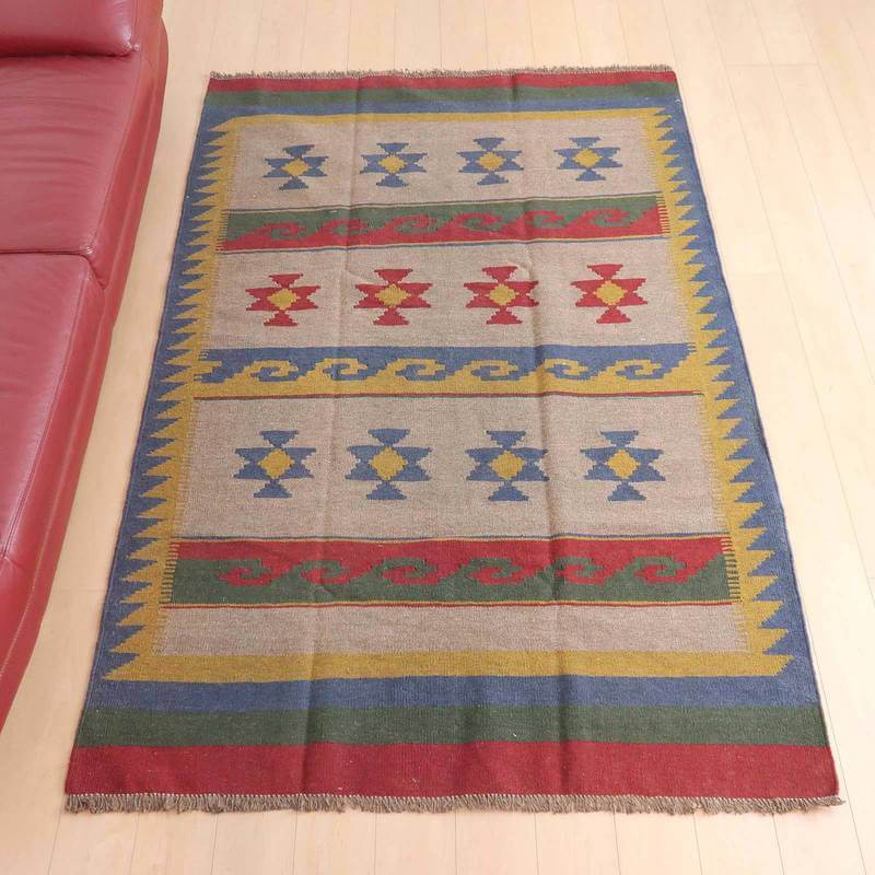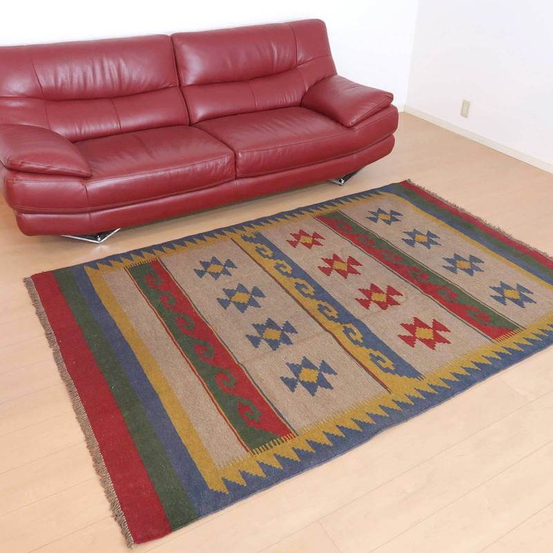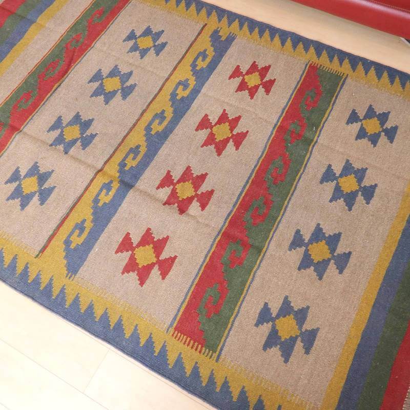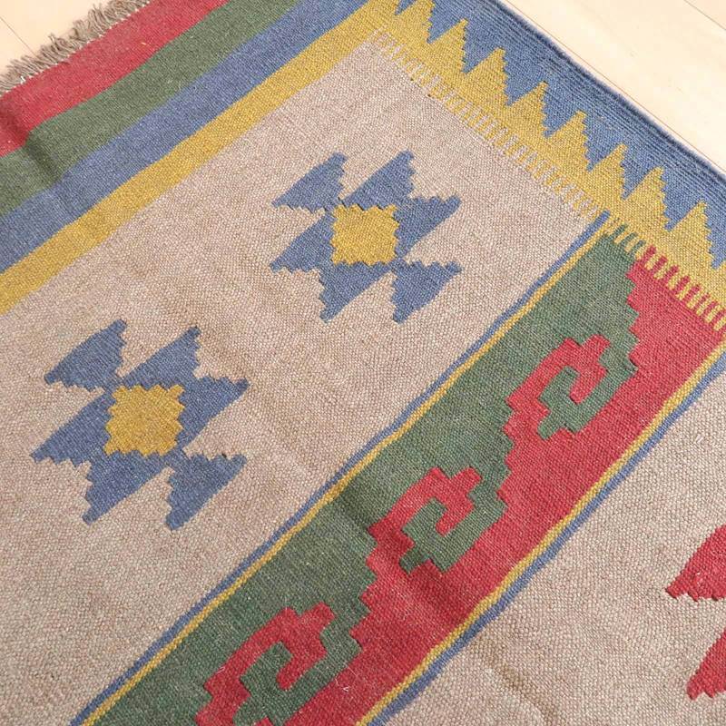 イラン南部シラーズ地方のキリムです。いくつかの色を使用した幾何学柄やギザギザ文様はリズムのある明るい雰囲気。使用している色はどれも、くすみのある落ち着いた色なので、目立たずインテリアに馴染みます。カシュガイの女性が昔ながらに織り上げたキリムなので、よく締まった丈夫な織り目で、早く仕上げる為、ゆるく粗く織られる商用生産のキリムには無い、誠実さが伝わってくる一枚です。また、平織り(ひらおり)という裏表の無い織り方で両面使えます。カシュガイ・キリムは遊牧のテント生活用の為、丈夫に織られ、洗濯も簡単、普段使いのラグとして扱いやすいキリムです。