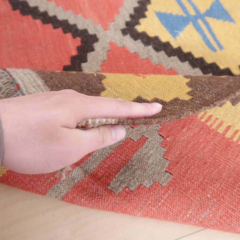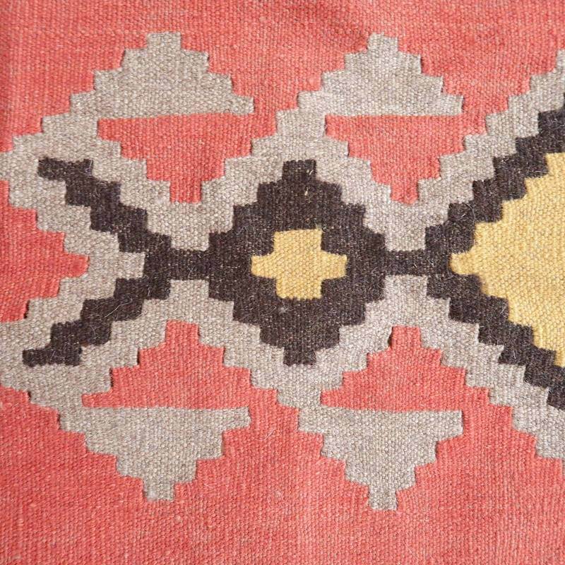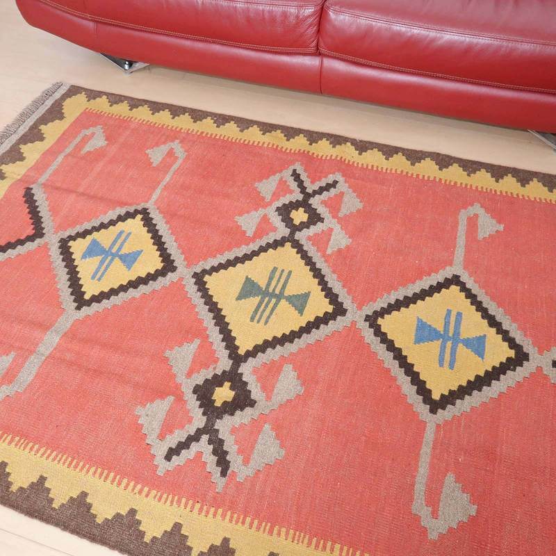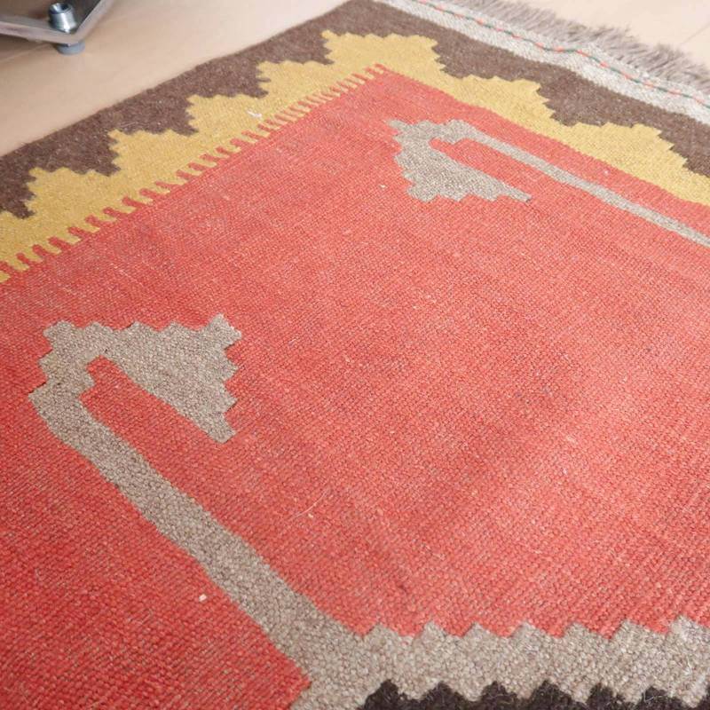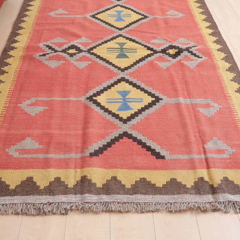 イラン南部シラーズ地方のキリムです。いくつかの色を使用した幾何学柄やギザギザ文様はリズムのある明るい雰囲気。使用している色はどれも、くすみのある落ち着いた色なので、目立たずインテリアに馴染みます。カシュガイの女性が昔ながらに織り上げたキリムなので、よく締まった丈夫な織り目で、早く仕上げる為、ゆるく粗く織られる商用生産のキリムには無い、誠実さが伝わってくる一枚です。また、平織り(ひらおり)という裏表の無い織り方で両面使えます。カシュガイ・キリムは遊牧のテント生活用の為、丈夫に織られ、洗濯も簡単、普段使いのラグとして扱いやすいキリムです。