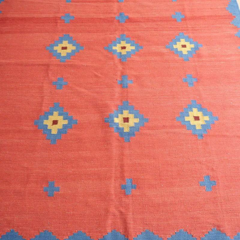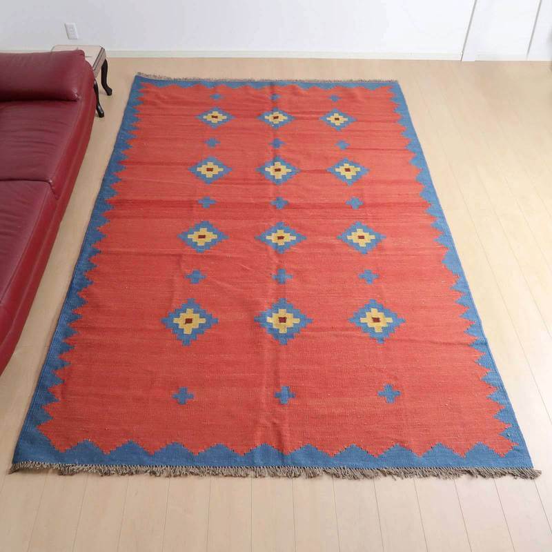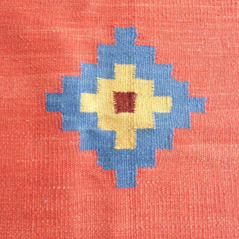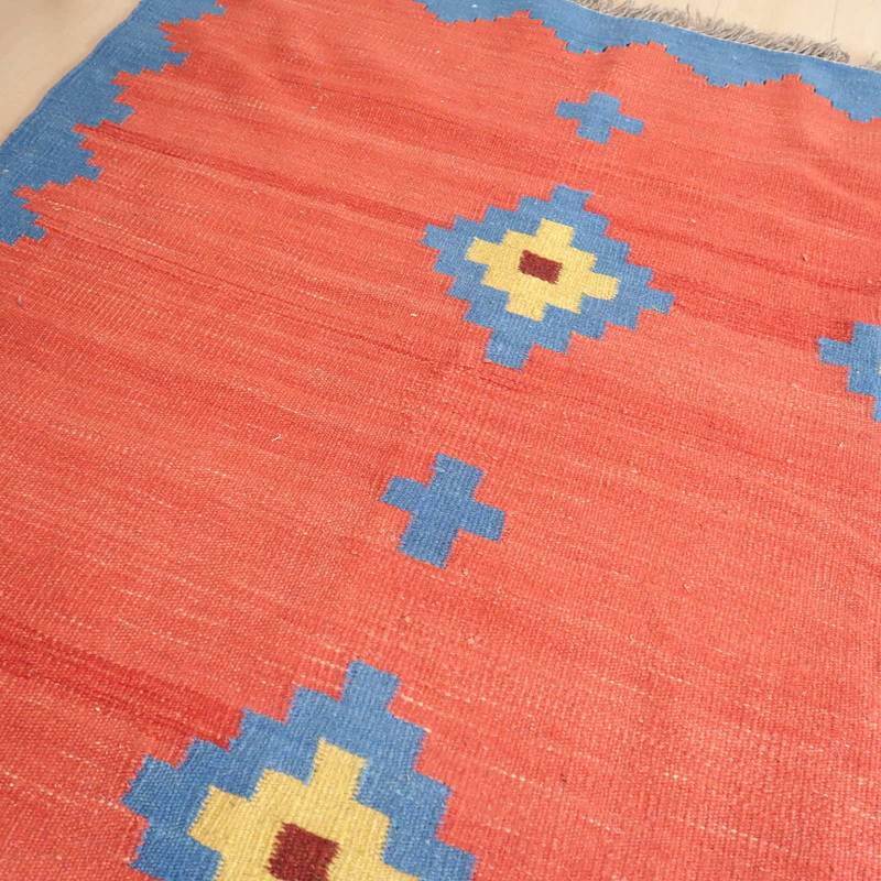 イラン南部シラーズ地方のキリムです。いくつかの色を使用した幾何学柄やギザギザ文様はリズムのある明るい雰囲気。程よく落ち着いた色とウールの風合いが、やさしくインテリアに馴染みます。カシュガイの女性が昔ながらに織り上げたキリムなので、よく締まった丈夫な織り目で、早く仕上げる為、ゆるく粗く織られる商用生産のキリムには無い、誠実さが伝わってくる一枚です。また、平織り(ひらおり)という裏表の無い織り方で両面使えます。カシュガイ族の遊牧のテント生活用の為、丈夫に織られ、洗濯も簡単、床なじみの良い適度な厚さで、普段使いのラグとして大変使いやすいキリムです。