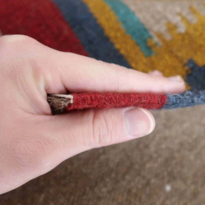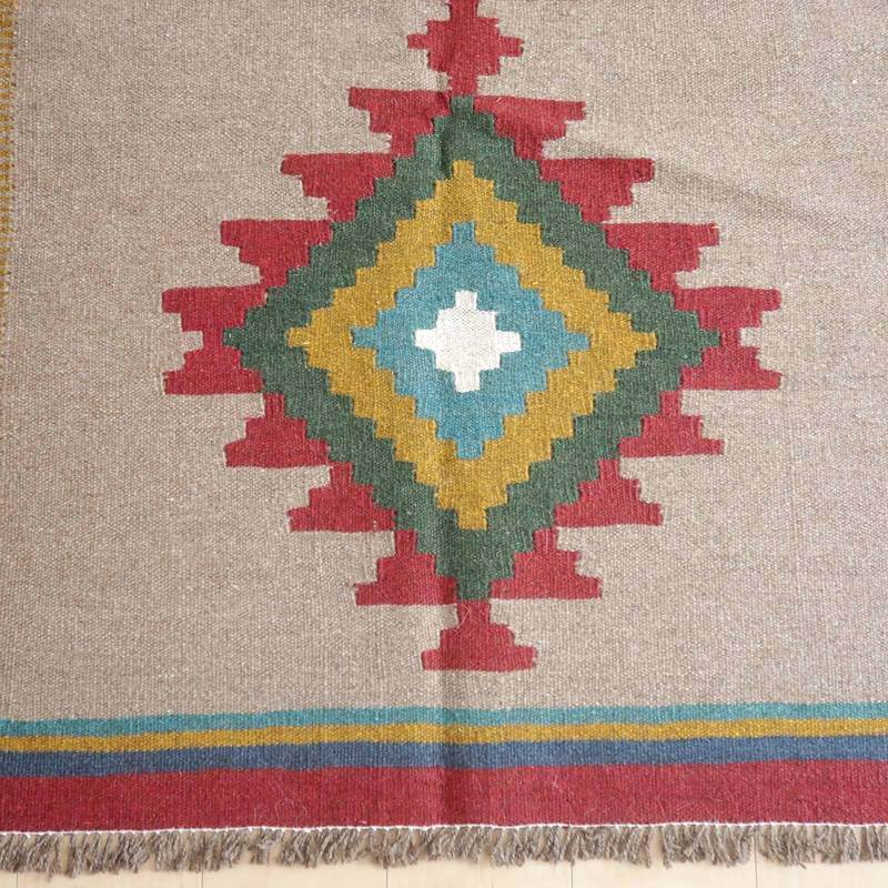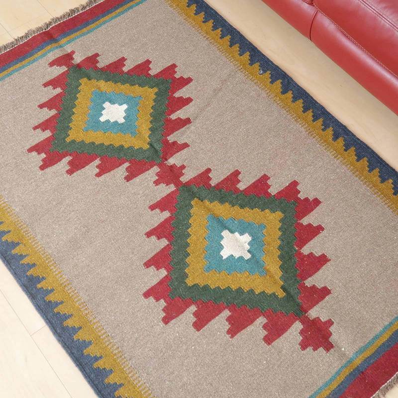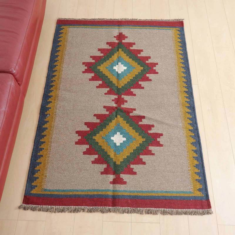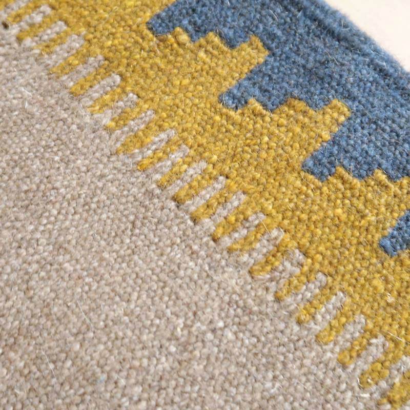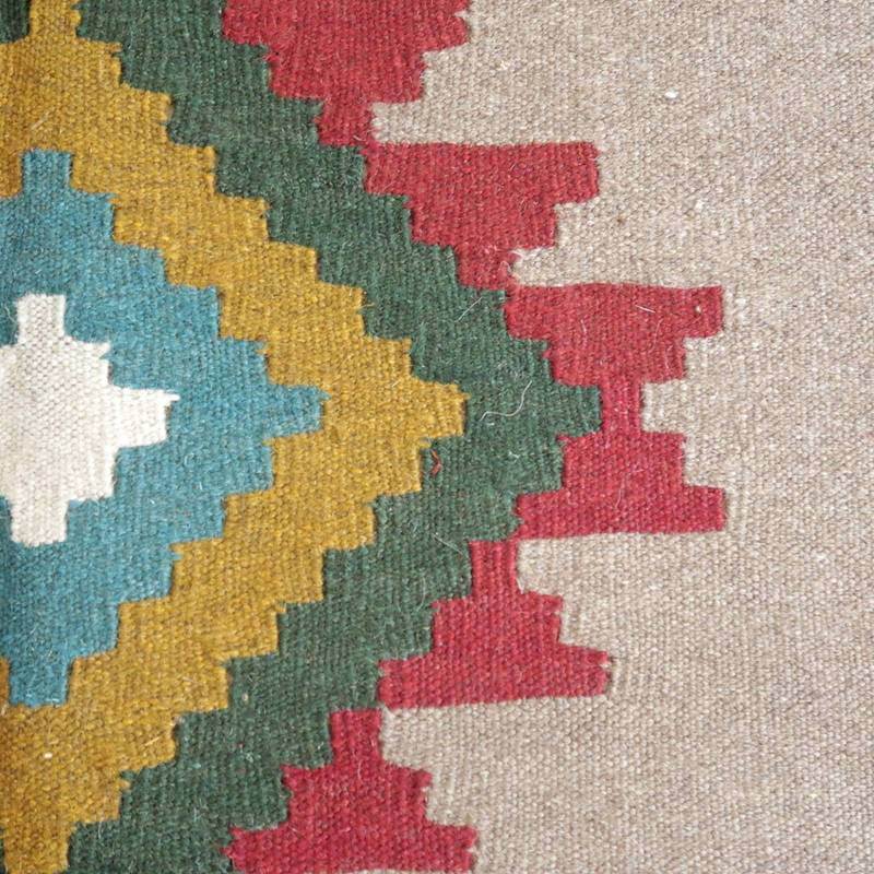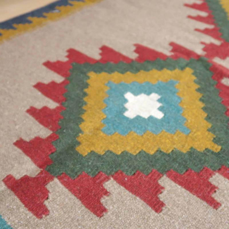 イラン南部シラーズ地方のキリムです。いくつかの色を使用した幾何学柄やギザギザ文様はリズムのある明るい雰囲気。程よく落ち着いた色とウールの風合いが、やさしくインテリアに馴染みます。カシュガイの女性が昔ながらに織り上げたキリムなので、よく締まった丈夫な織り目で、早く仕上げる為、ゆるく粗く織られる商用生産のキリムには無い、誠実さが伝わってくる一枚です。また、平織り(ひらおり)という裏表の無い織り方で両面使えます。カシュガイ族の遊牧のテント生活用の為、丈夫に織られ、洗濯も簡単、床なじみの良い適度な厚さで、普段使いのラグとして大変使いやすいキリムです。