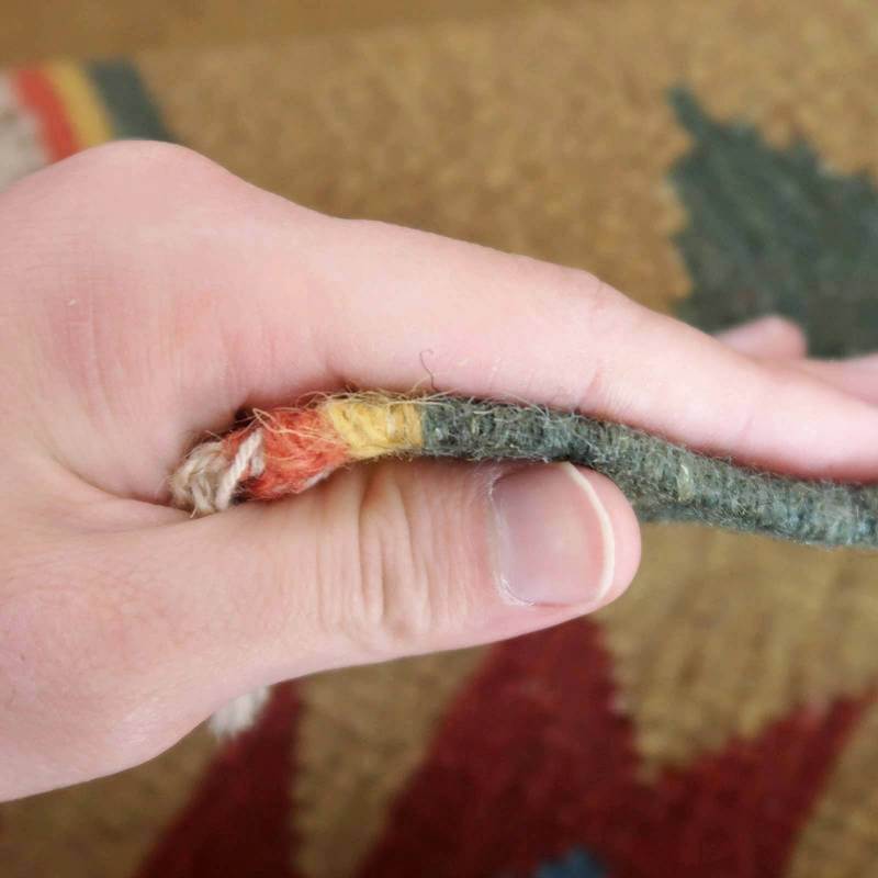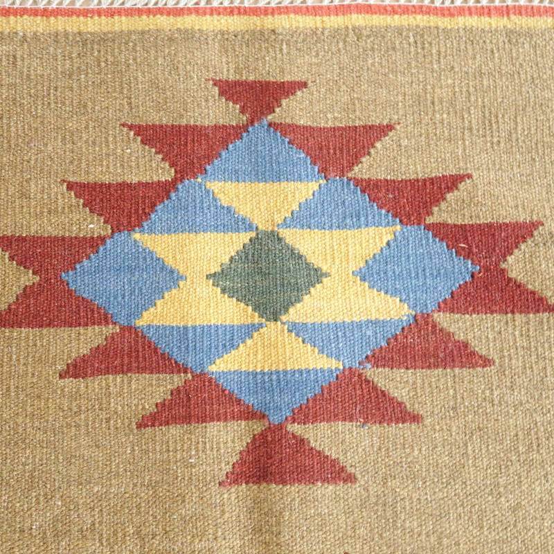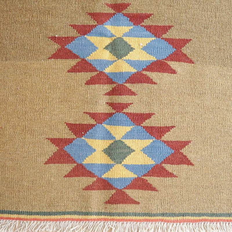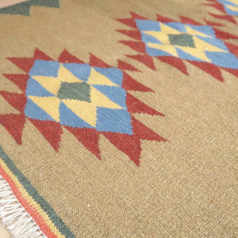 イラン南部シラーズ地方のキリムです。いくつかの色を使用した幾何学柄やギザギザ文様はリズムのある明るい雰囲気。程よく落ち着いた色とウールの風合いが、やさしくインテリアに馴染みます。カシュガイの女性が昔ながらに織り上げたキリムなので、よく締まった丈夫な織り目で、早く仕上げる為、ゆるく粗く織られる商用生産のキリムには無い、誠実さが伝わってくる一枚です。また、平織り(ひらおり)という裏表の無い織り方で両面使えます。カシュガイ族の遊牧のテント生活用の為、丈夫に織られ、洗濯も簡単、床なじみの良い適度な厚さで、普段使いのラグとして大変使いやすいキリムです。