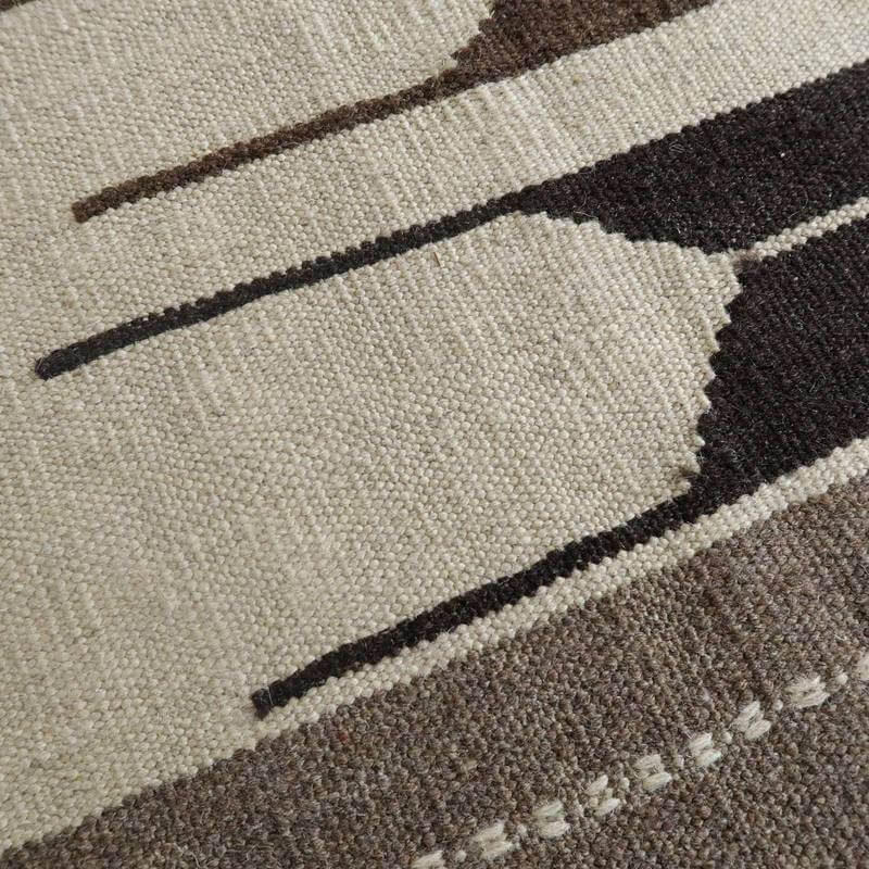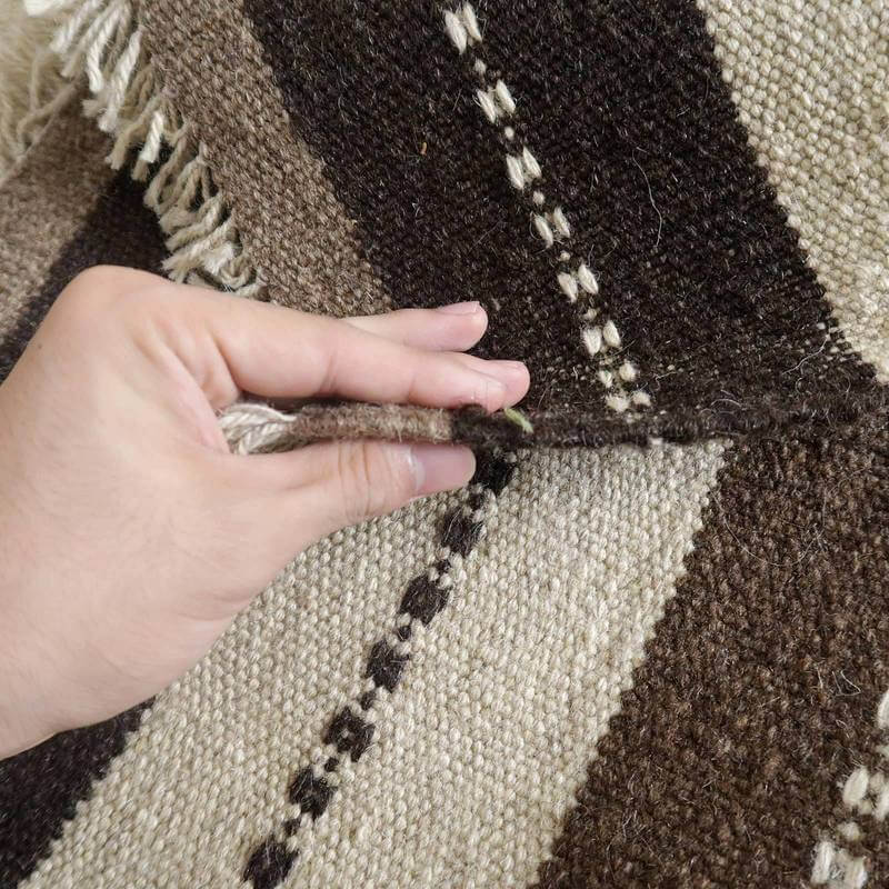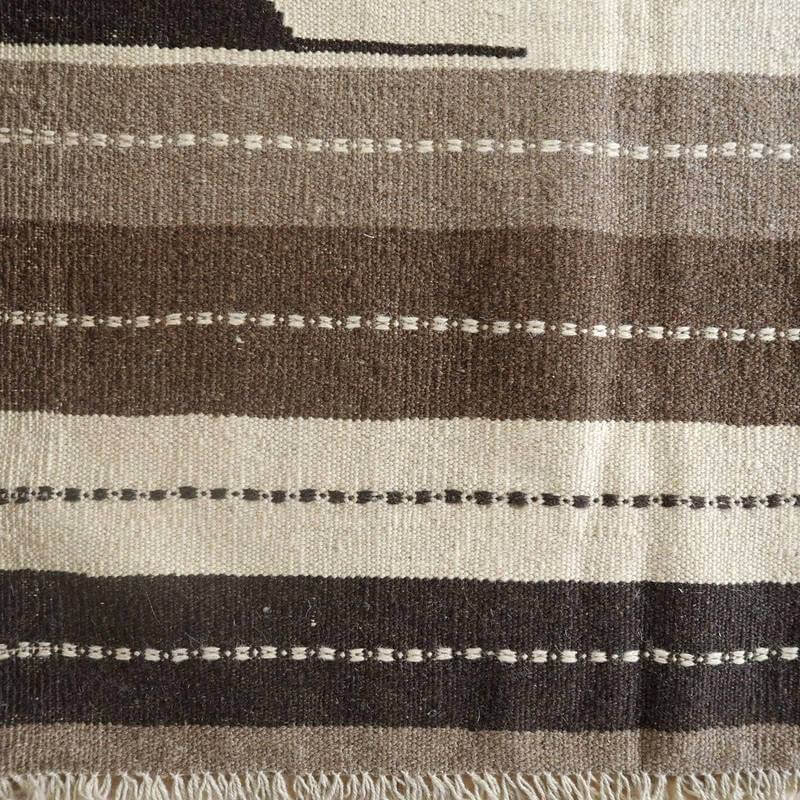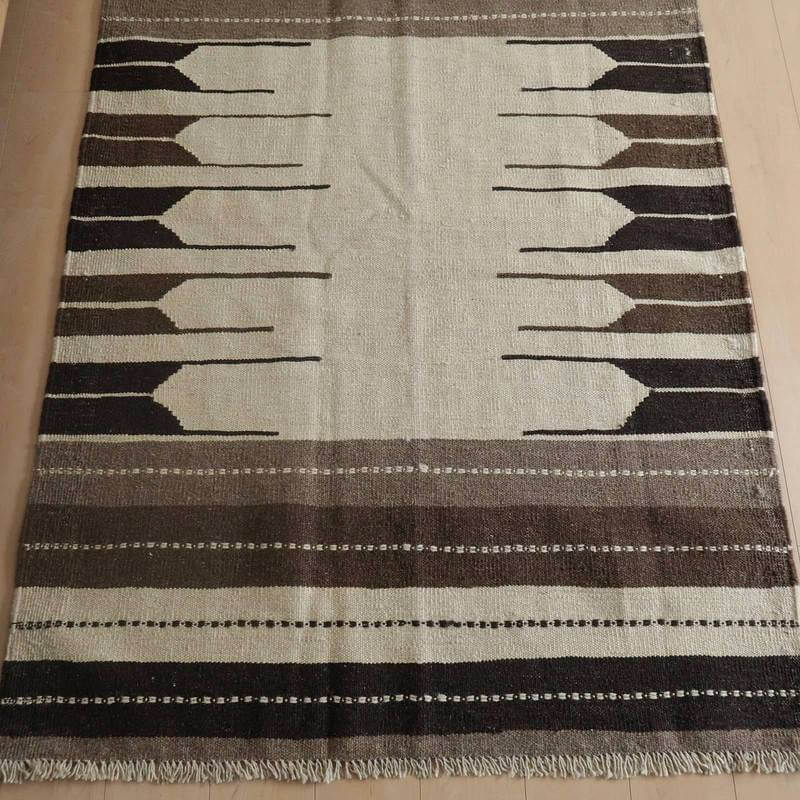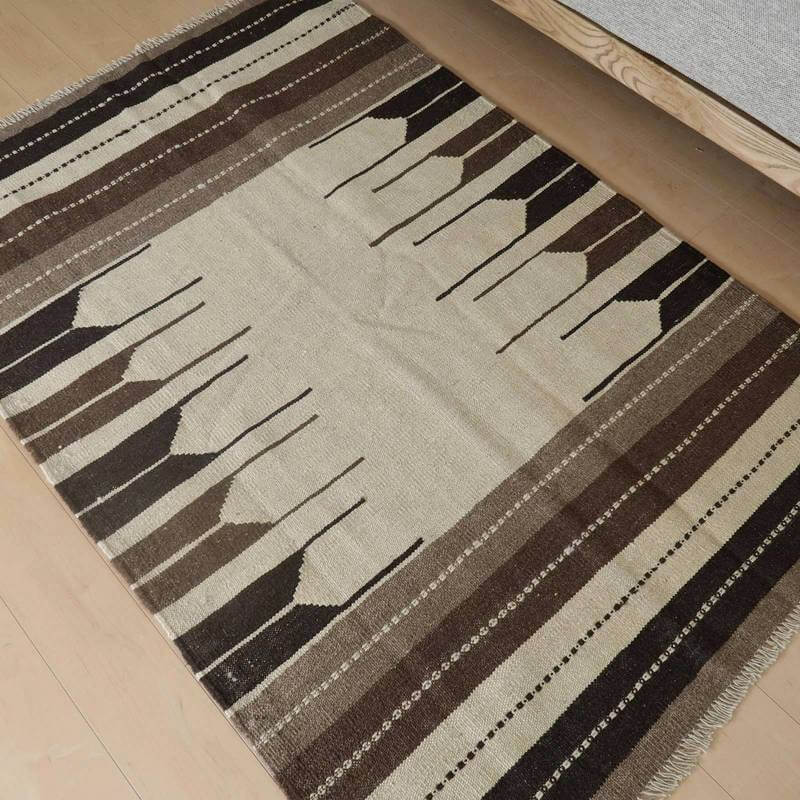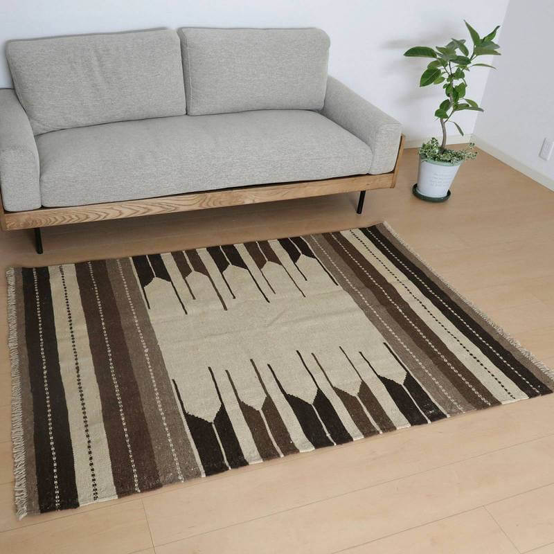 イラン南部シラーズ地方のキリムです。ベージュや茶色など使われているのは全て染色しないそのままの羊の自然な毛色です。リズム感のある幾何学柄やギザギザ文様が茶系のモノトーン風のナチュラルな雰囲気でインテリアに馴染みます。カシュガイの女性が昔ながらに織り上げたキリムなので、よく締まった丈夫な織り目で、早く仕上げる為、ゆるく粗く織られる商用生産のキリムには無い、誠実さが伝わってくる一枚です。また、平織り(ひらおり)という裏表の無い織り方で両面使えます。カシュガイ族の遊牧のテント生活用の為、丈夫に織られ、洗濯も簡単、床なじみの良い適度な厚さで、普段使いのラグとして大変使いやすいキリムです。