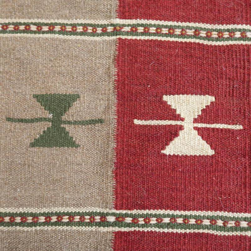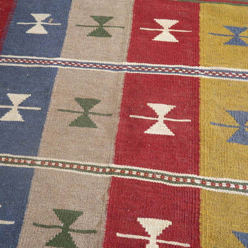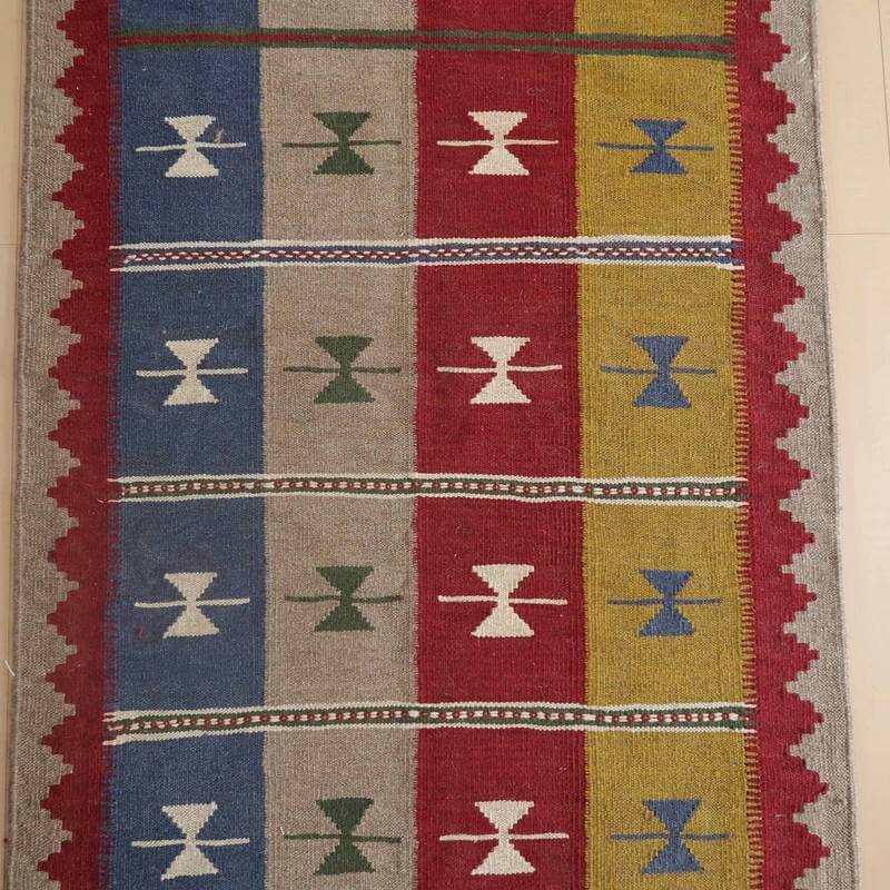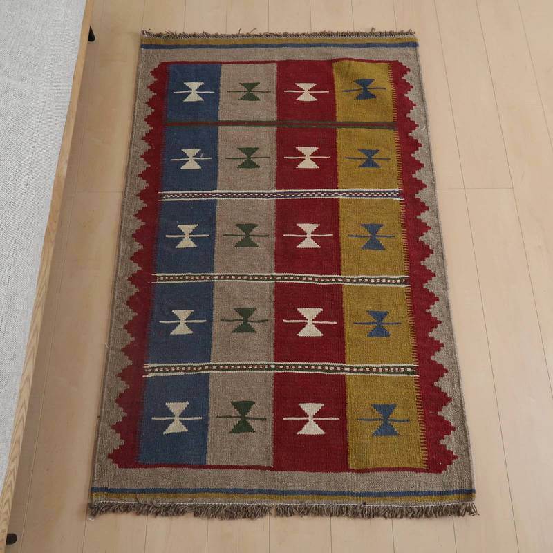 イラン南部シラーズ地方のキリムです。いくつかの色を使用した幾何学柄やギザギザ文様はリズムのある明るい雰囲気。程よく落ち着いた色とウールの風合いが、やさしくインテリアに馴染みます。カシュガイの女性が昔ながらに織り上げたキリムなので、よく締まった丈夫な織り目で、早く仕上げる為、ゆるく粗く織られる商用生産のキリムには無い、誠実さが伝わってくる一枚です。また、平織り(ひらおり)という裏表の無い織り方で両面使えます。カシュガイ族の遊牧のテント生活用の為、丈夫に織られ、洗濯も簡単、床なじみの良い適度な厚さで、普段使いのラグとして大変使いやすいキリムです。