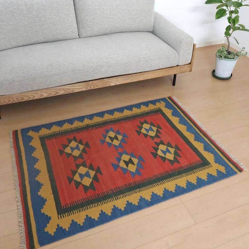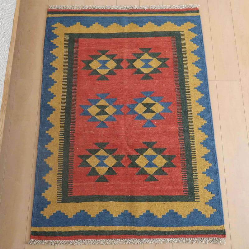 ギャッベでお馴染みのシラーズ地方カシュガイ族に伝わるキリムです。いくつかの色を使用した幾何学柄やギザギザ文様はリズムのある明るい雰囲気。程よく落ち着いた色とウールの風合いが、やさしくインテリアに馴染みます。カシュガイの女性が昔ながらに織り上げたキリムなので、よく締まった丈夫な織り目で、早く仕上げる為、ゆるく粗く織られる商用生産のキリムには無い、誠実さが伝わってくる一枚です。また、平織り(ひらおり)という裏表の無い織り方で両面使えます。カシュガイ族の遊牧のテント生活用の為、丈夫に織られ、洗濯も簡単、床なじみの良い適度な厚さで、普段使いのラグとして大変使いやすいキリムです。