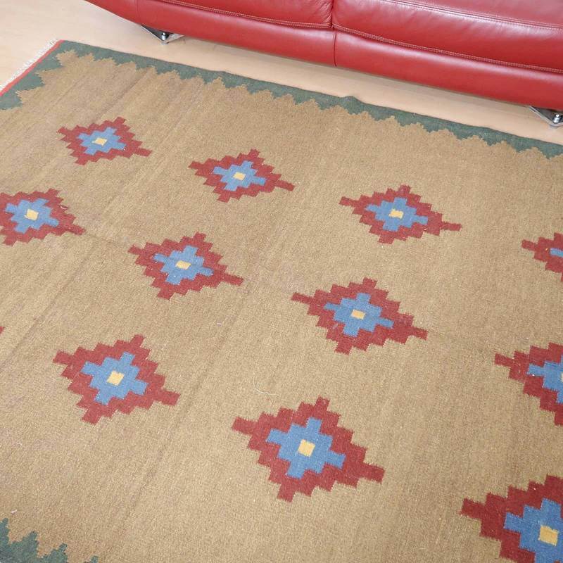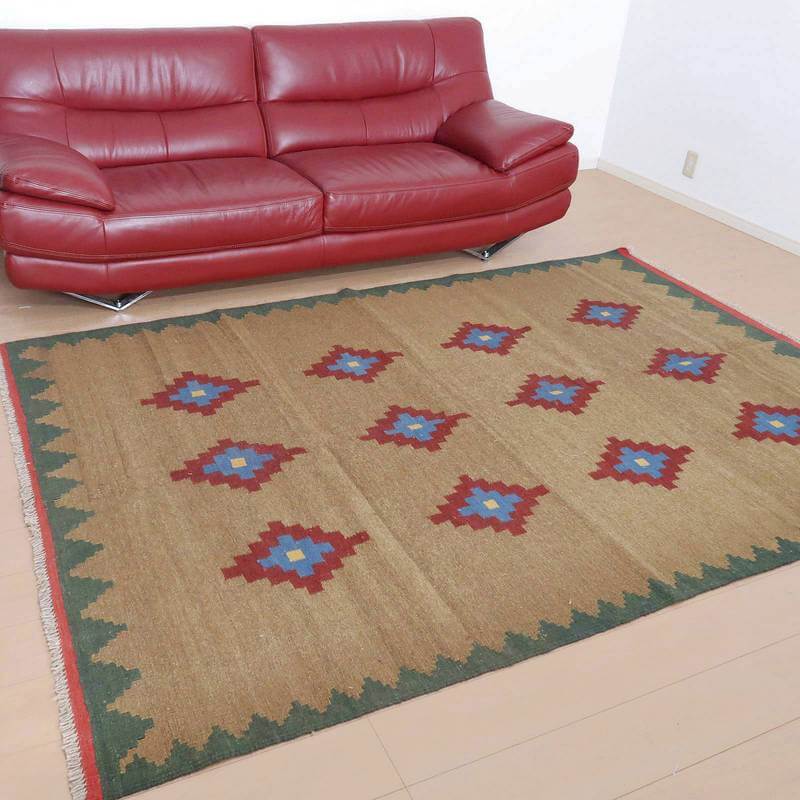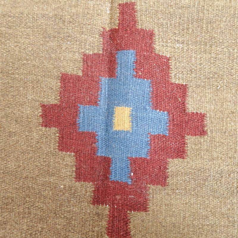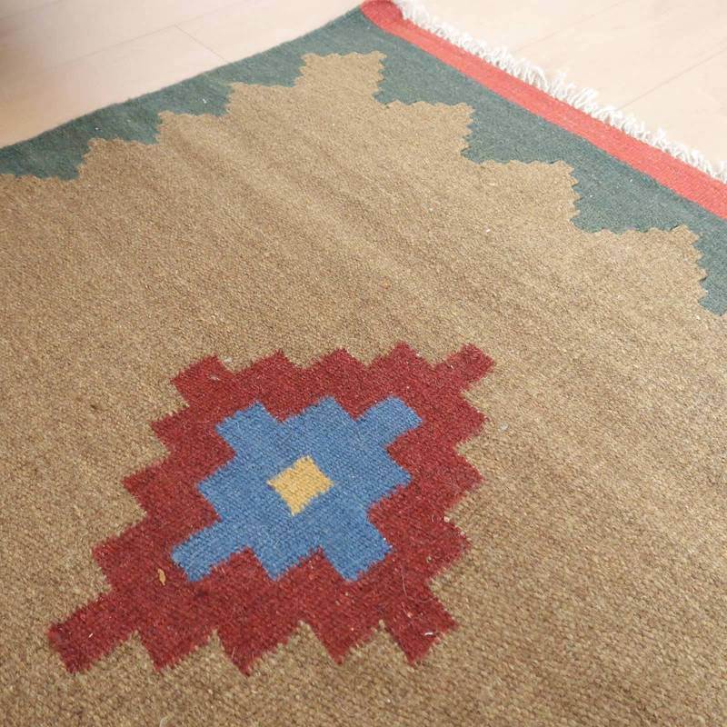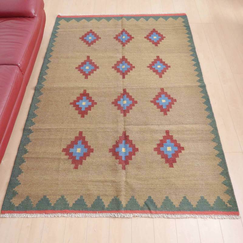 イラン南部シラーズ地方のキリムです。いくつかの色を使用した幾何学柄やギザギザ文様はリズムのある明るい雰囲気。使用している色はどれも、くすみのある落ち着いた色なので、目立たずインテリアに馴染みます。カシュガイの女性が昔ながらに織り上げたキリムなので、よく締まった丈夫な織り目で、早く仕上げる為、ゆるく粗く織られる商用生産のキリムには無い、誠実さが伝わってくる一枚です。また、平織り(ひらおり)という裏表の無い織り方で両面使えます。カシュガイ・キリムは遊牧のテント生活用の為、丈夫に織られ、洗濯も簡単、普段使いのラグとして扱いやすいキリムです。