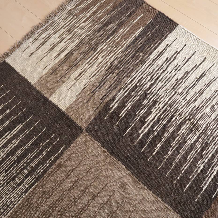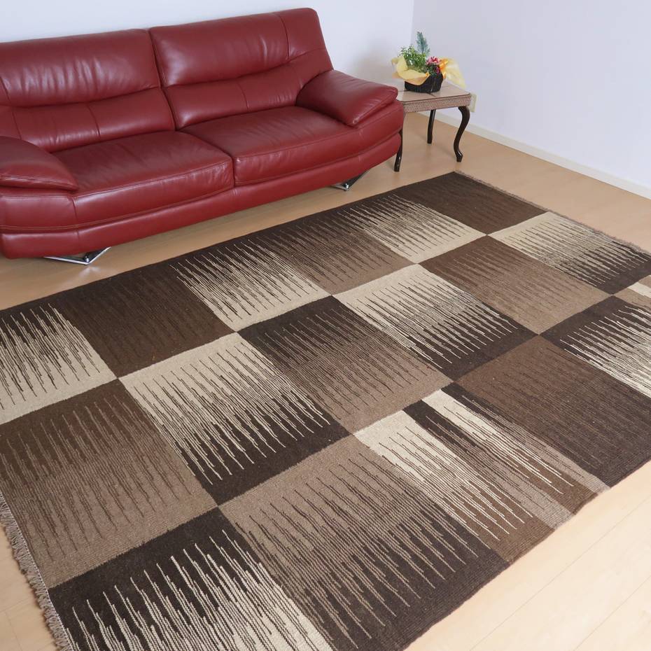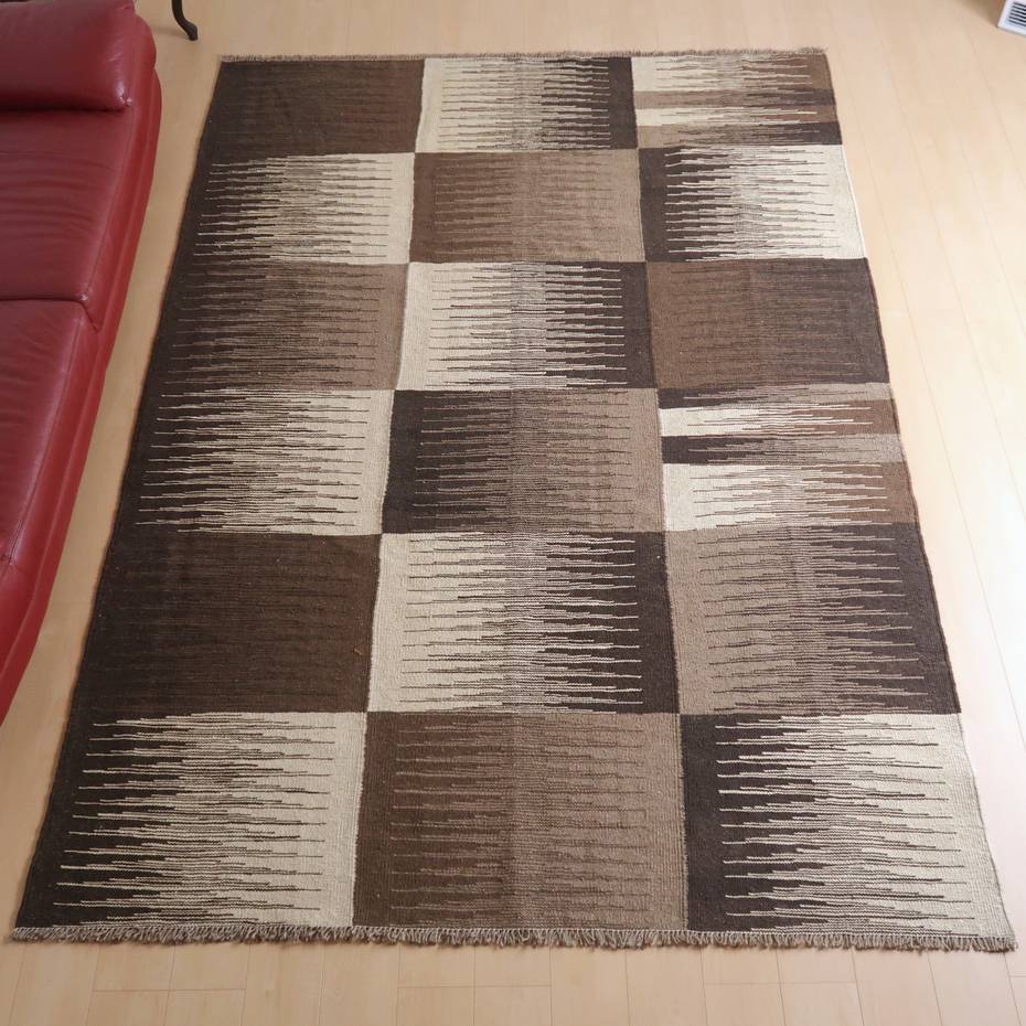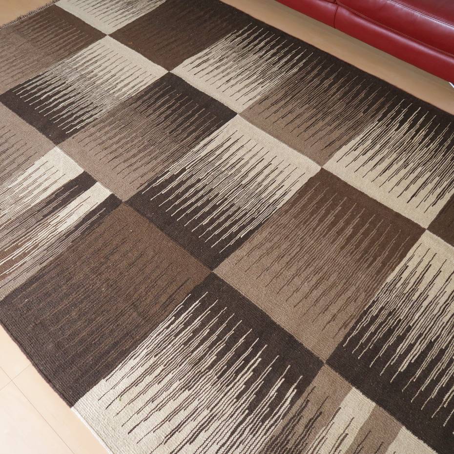 ギャッベでお馴染みのシラーズ地方カシュガイ族に伝わるキリムです。生成りや茶、グレーなどの元々の羊の毛色をそのまま活かした無染色のウールを使用したナチュラルカラーなので、敷く場所を選ばず、落ち着いた雰囲気で馴染みます。幾何学やギザギザ文様のシンプルな中にもリズムのあるモダンなデザイン。カシュガイの女性が昔ながらに織り上げたキリムなので、よく締まった丈夫な織り目で、早く仕上げる為、ゆるく粗く織られる商用生産のキリムには無い、誠実さと愛着が感じられる味わい深さがあります。作りは、平織り(ひらおり)という裏表の無い、両面を使える織り方。カシュガイ・キリムは遊牧のテント生活用の為、丈夫に織られ、洗濯も簡単、普段使いのラグとして扱いやすいキリムです。
