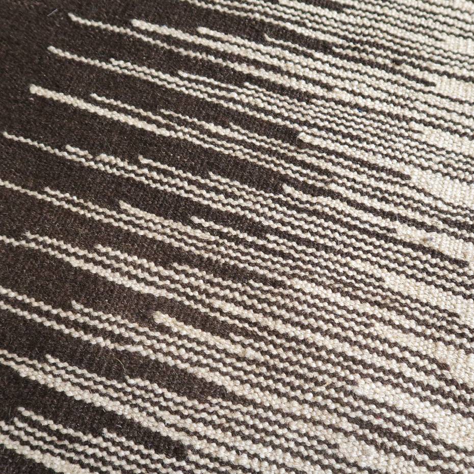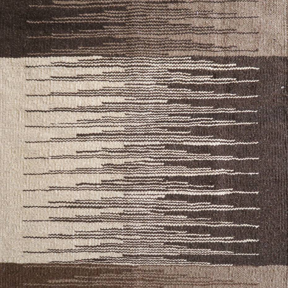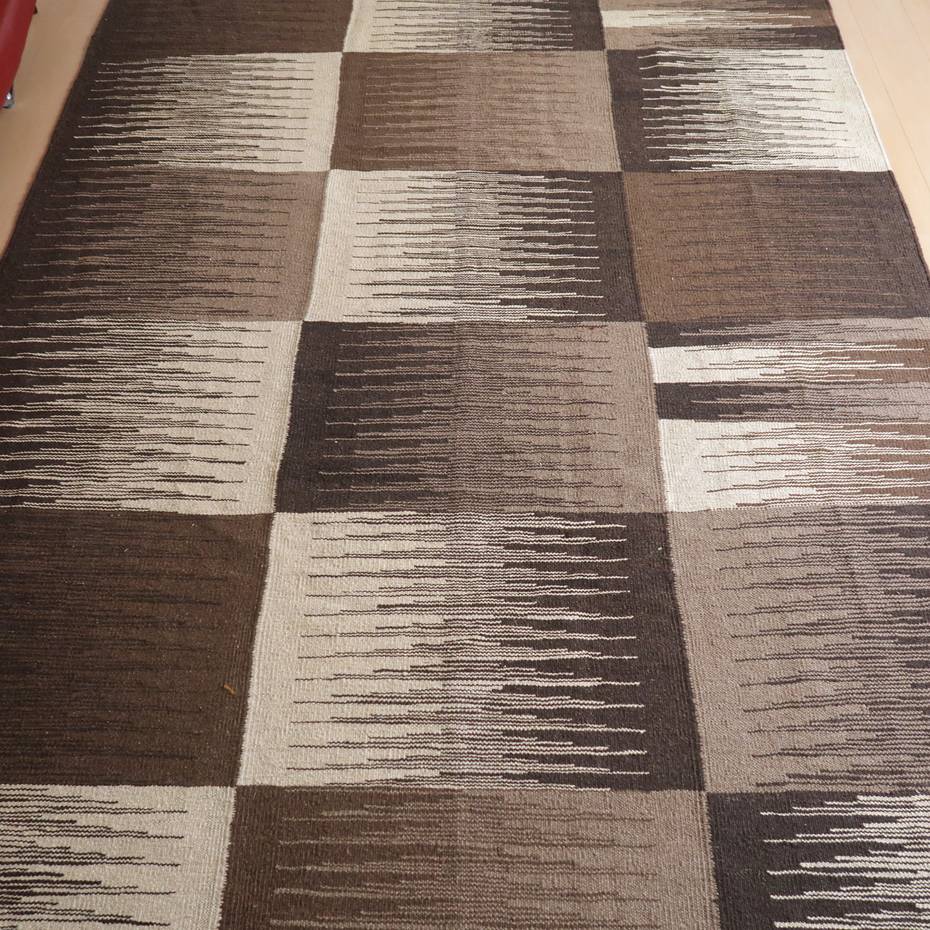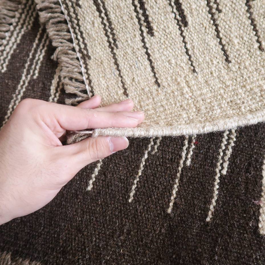 ギャッベでお馴染みのシラーズ地方カシュガイ族に伝わるキリムです。生成りや茶、グレーなどの元々の羊の毛色をそのまま活かした無染色のウールを使用したナチュラルカラーなので、敷く場所を選ばず、落ち着いた雰囲気で馴染みます。幾何学やギザギザ文様のシンプルな中にもリズムのあるモダンなデザイン。カシュガイの女性が昔ながらに織り上げたキリムなので、よく締まった丈夫な織り目で、早く仕上げる為、ゆるく粗く織られる商用生産のキリムには無い、誠実さと愛着が感じられる味わい深さがあります。作りは、平織り(ひらおり)という裏表の無い、両面を使える織り方。カシュガイ・キリムは遊牧のテント生活用の為、丈夫に織られ、洗濯も簡単、普段使いのラグとして扱いやすいキリムです。
