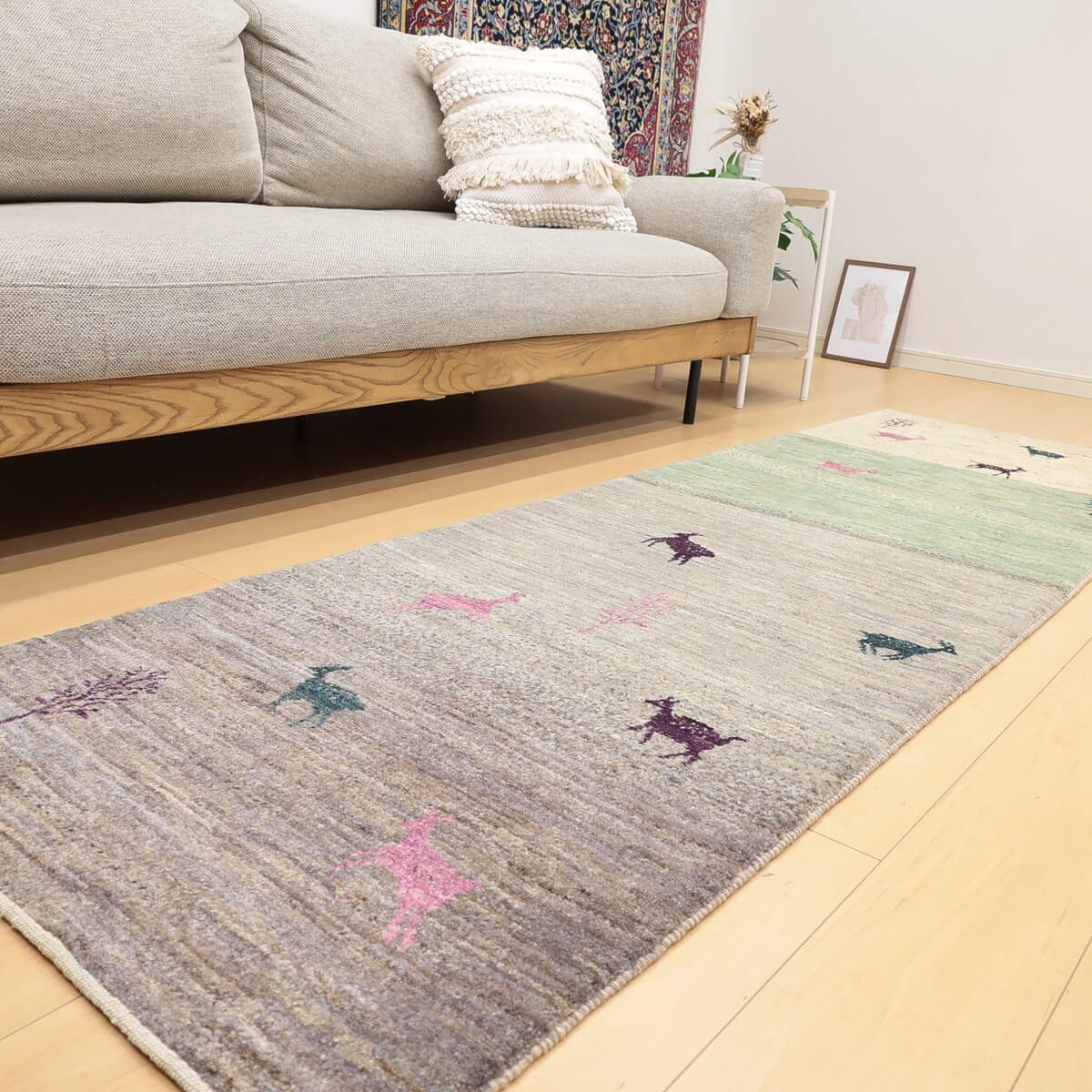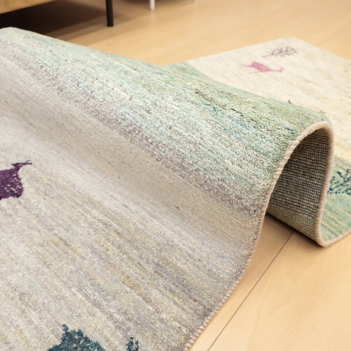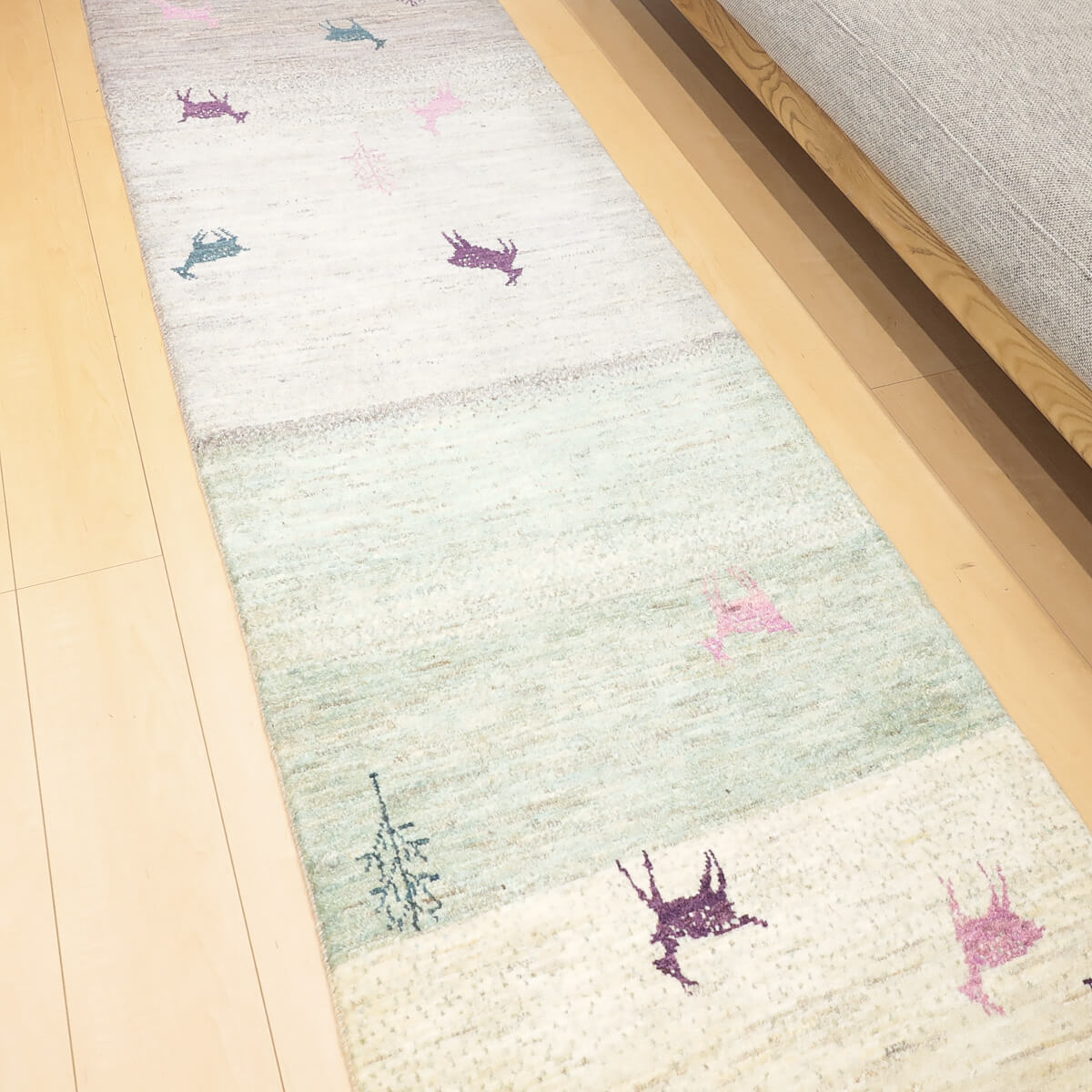 質感の良さ 丁寧に織られたウール素材が、しっとりとした優しい踏み心地を実現しています。ランナーとしての扱いやすさと、ギャッベならではの耐久性を兼ね備えており、毎日のご使用で素材本来の温かみと深みが感じられるようになっていきます。