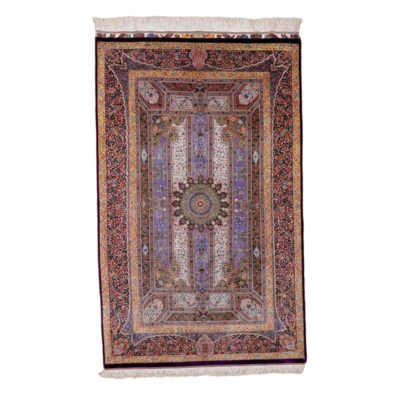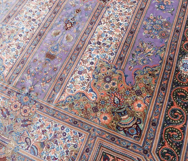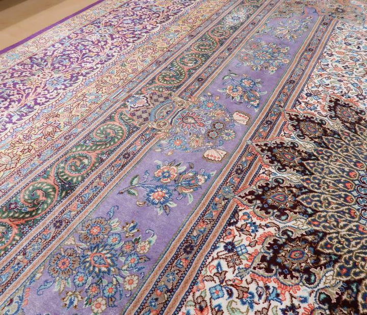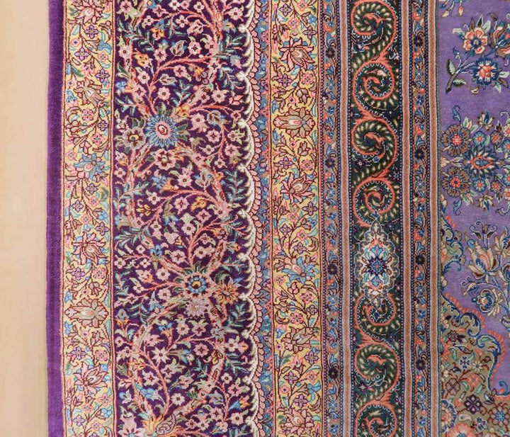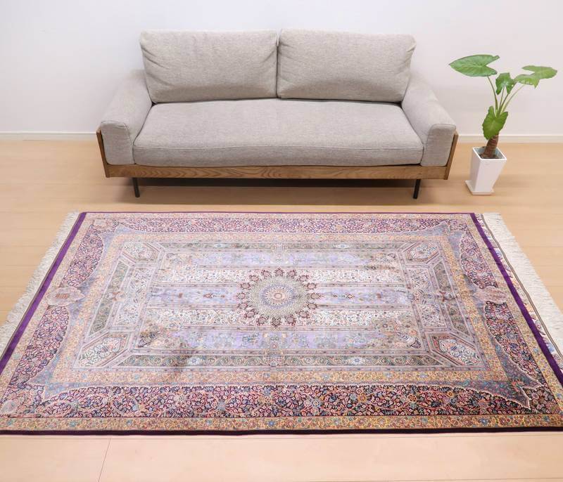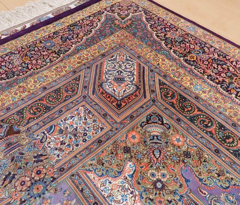最高級のシルク絨毯の代名詞と言えばクム地方。その中でトップを誇るブランドであるのがジャムシーディ工房です。ふんわり柔らかな紫色とアイボリーのやさしげなニュアンスカラーのボーダーを主に、優美な曲線も入れながら、それぞれのスペースに美しい花を精密に織り描いています。どの向きから眺めてみても美しいデザイン・バランス、その計算され尽くした構図には感心させられます。気の遠くなるような正確で細密な手仕事の積み重ね、吸い付くような滑らかなシルクの手触り。工芸品ではなく美術品としての価値ある最高峰のペルシャ絨毯は、日々の生活に豊かな感動をもたらしてくれます。「ゴム(クム) ジャファール ジャムシーディ」のサイン入り。シルク絨毯は毛足の光沢により見る向きによってまったく趣の異なる色合いになります、敷く向きを好みで調整してください。