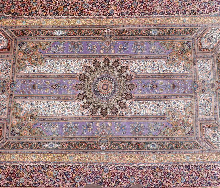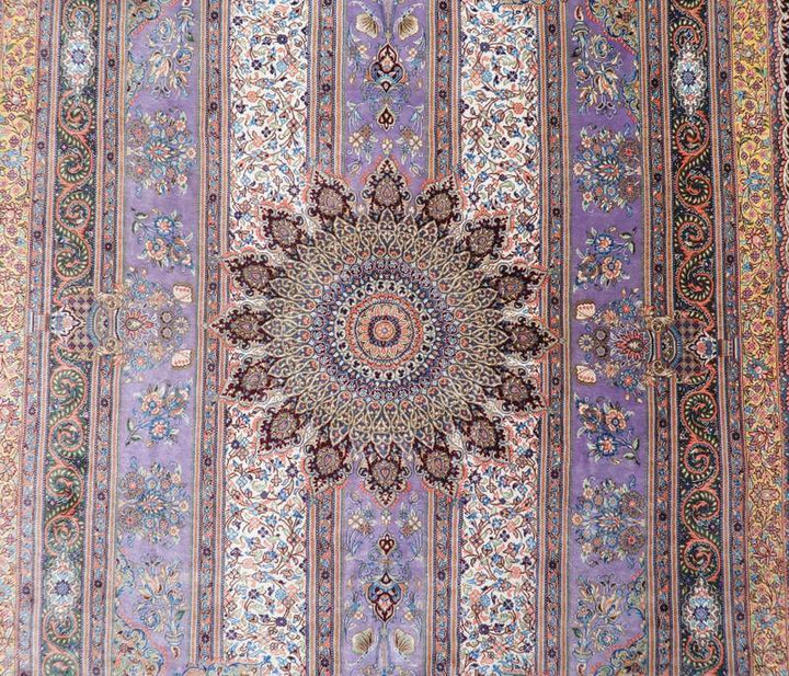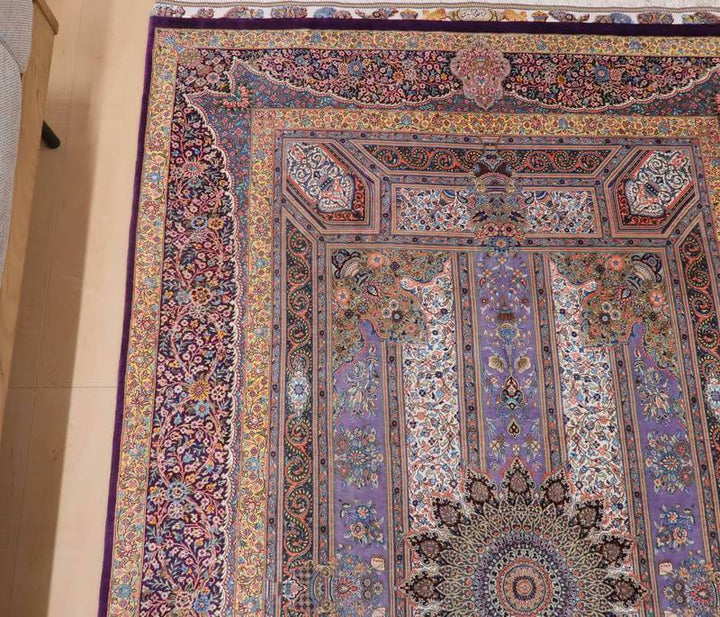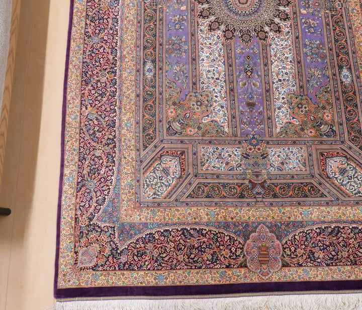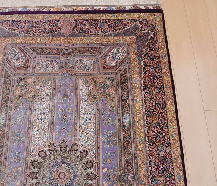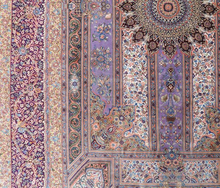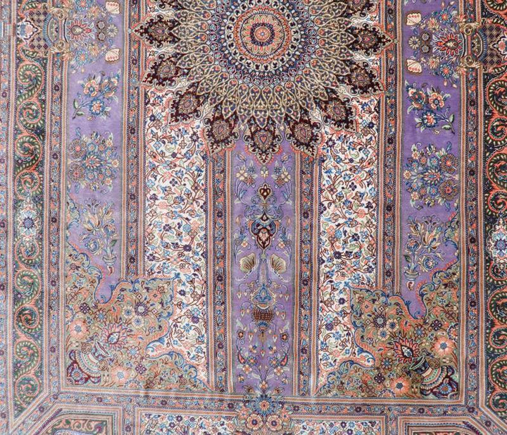 最高級のシルク絨毯の代名詞と言えばクム地方。その中でトップを誇るブランドであるのがジャムシーディ工房です。ふんわり柔らかな紫色とアイボリーのやさしげなニュアンスカラーのボーダーを主に、優美な曲線も入れながら、それぞれのスペースに美しい花を精密に織り描いています。どの向きから眺めてみても美しいデザイン・バランス、その計算され尽くした構図には感心させられます。気の遠くなるような正確で細密な手仕事の積み重ね、吸い付くような滑らかなシルクの手触り。工芸品ではなく美術品としての価値ある最高峰のペルシャ絨毯は、日々の生活に豊かな感動をもたらしてくれます。「ゴム(クム) ジャファール ジャムシーディ」のサイン入り。シルク絨毯は毛足の光沢により見る向きによってまったく趣の異なる色合いになります、敷く向きを好みで調整してください。