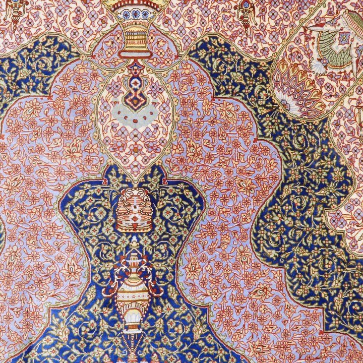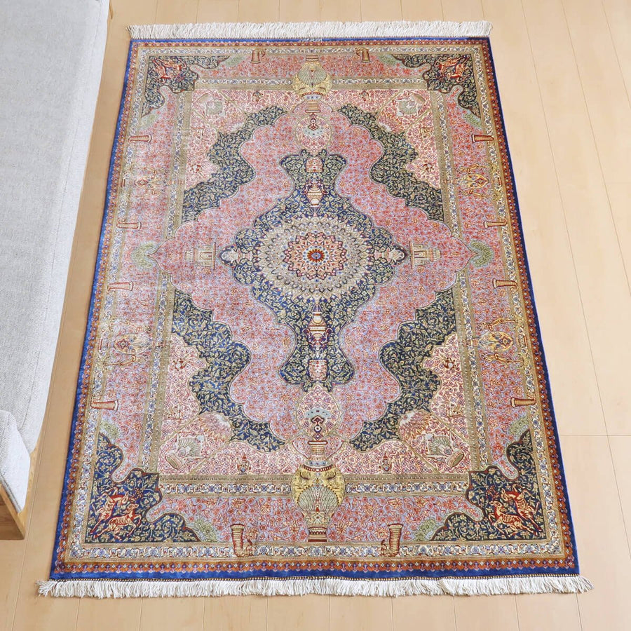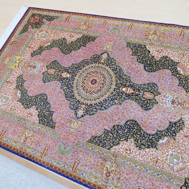 ソフトな青紫色と紺色を基調とした落ち着きのある色使い。2つの大きな壺から立つ煙のようなくねる曲線、ペルセポリスに見られるような古代のモチーフを大小随所に織り入れているので、一つ一つ眺めて楽しく、ペルシャの雰囲気たっぷりのデザインです。手に取れば、しっとり吸い付くようなシルクの滑らかな感触にうっとり。まさに、「The ペルシャ絨毯」と言うべき最高峰のペルシャ絨毯は、もはや工芸品ではなく美術品としての価値となります。「イラン ゴム(クム) ジャムシーディ」のサイン入り。シルクの絨毯は毛足の光沢が見る向きによってまったく趣の異なる色合いになりますので、敷く際は向きを調整してください。※高額のため代金引換払いはご利用いただけません。