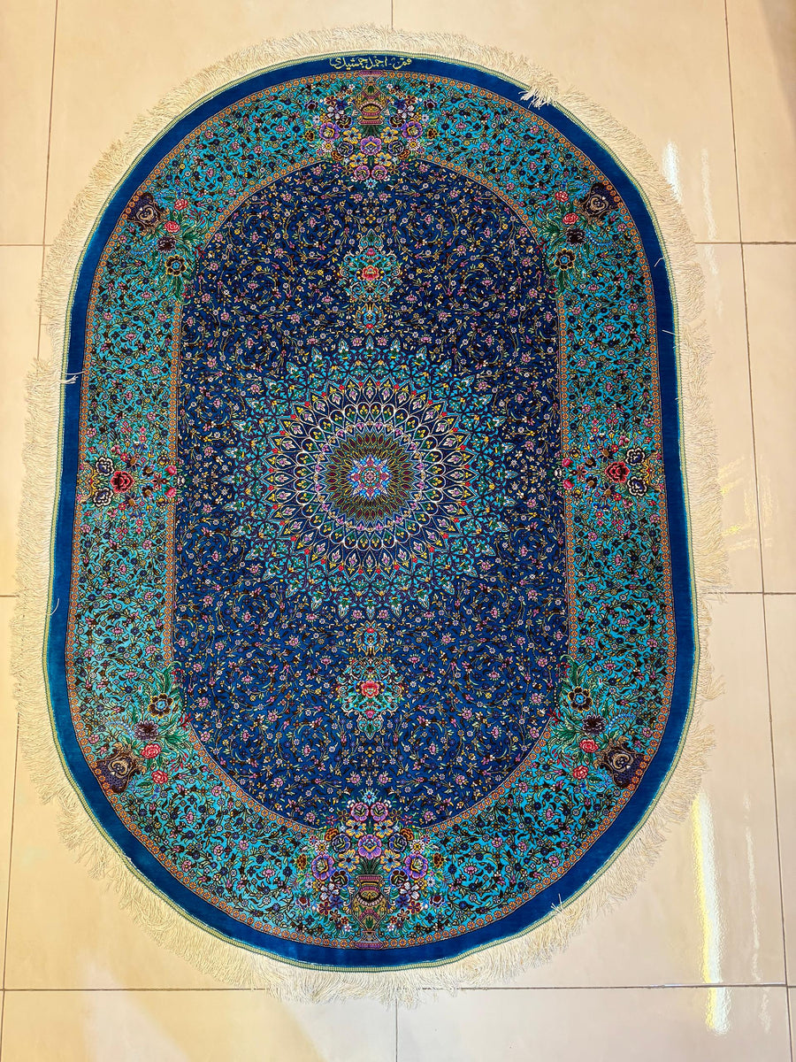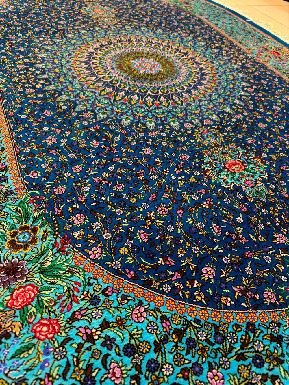 青を基調とした優美な楕円形のペルシャ絨毯です。中央には放射状に広がる花模様が描かれ、周囲には色とりどりの小花や植物が繊細に織り込まれています。縁取りには壺に活けられた花々のモチーフが織り込まれ、華やかさと調和が感じられるデザインが魅力です。