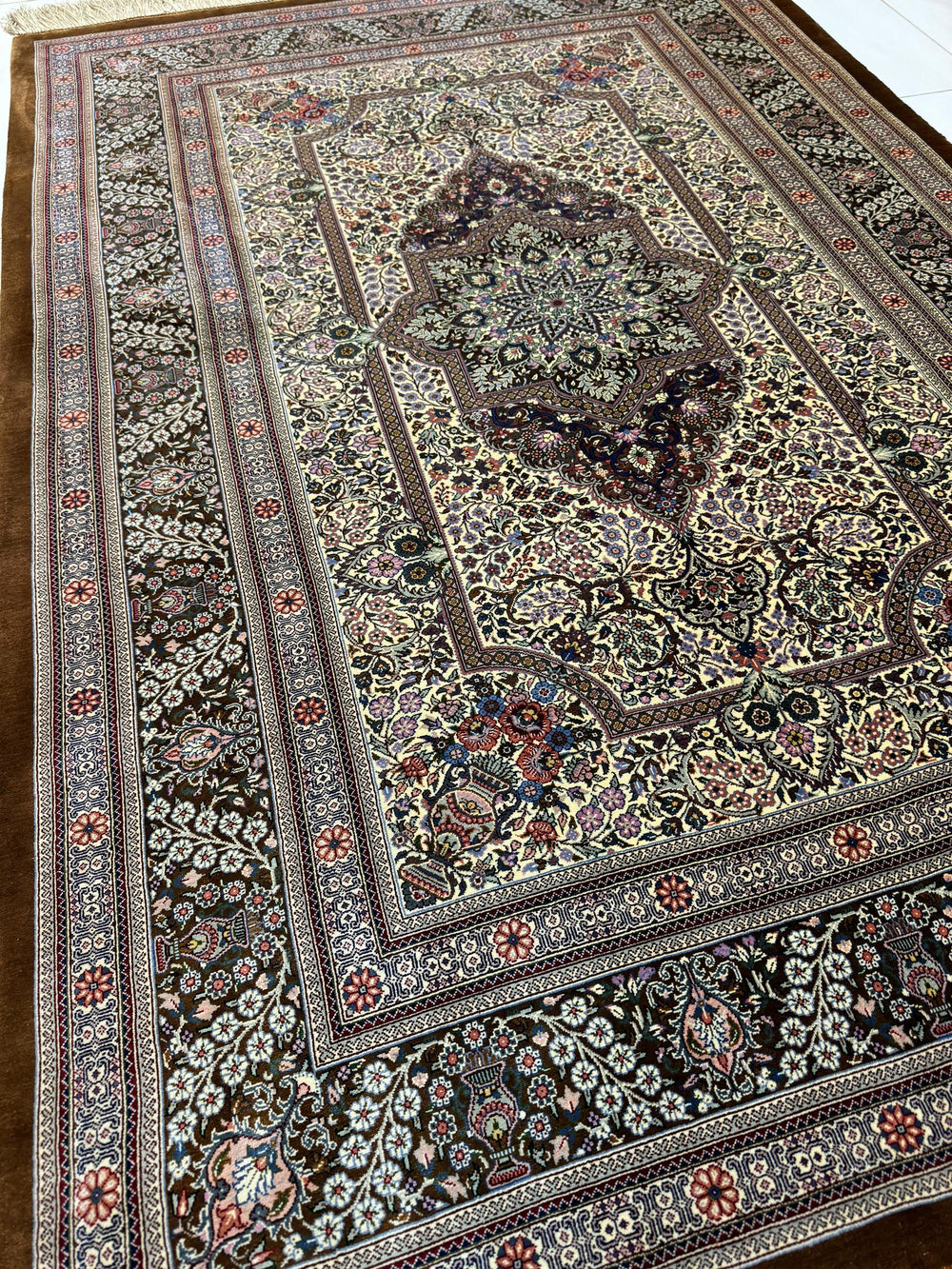 ブラウンを基調にした優雅なデザインが魅力のペルシャ絨毯です。中央には星型の幾何学的なモチーフが描かれ、その周囲にはカラフルな花々や植物模様が繊細に織り込まれています。縁には花瓶や蔦をモチーフにしたデザインが施され、絨毯全体に調和のとれた伝統的な美しさを感じさせます。