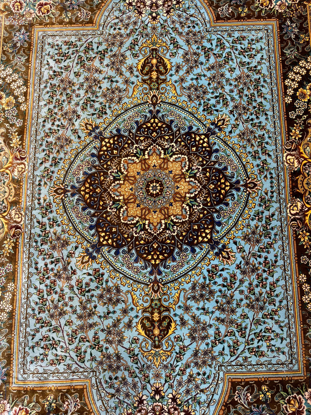 驚くような細かな織り目とビロードのような生地、肌に吸い付くようなシルクの艶やかな光沢感が豪華絢爛。まさに、「The ペルシャ絨毯」と言うべき最高峰のペルシャ絨毯は、もはや工芸品ではなく美術品としての価値となります。ノウリ工房のサイン入り。シルクの絨毯は毛足の光沢が見る向きによってまったく趣の異なる色合いになりますので、敷く際は向きを調整してください。