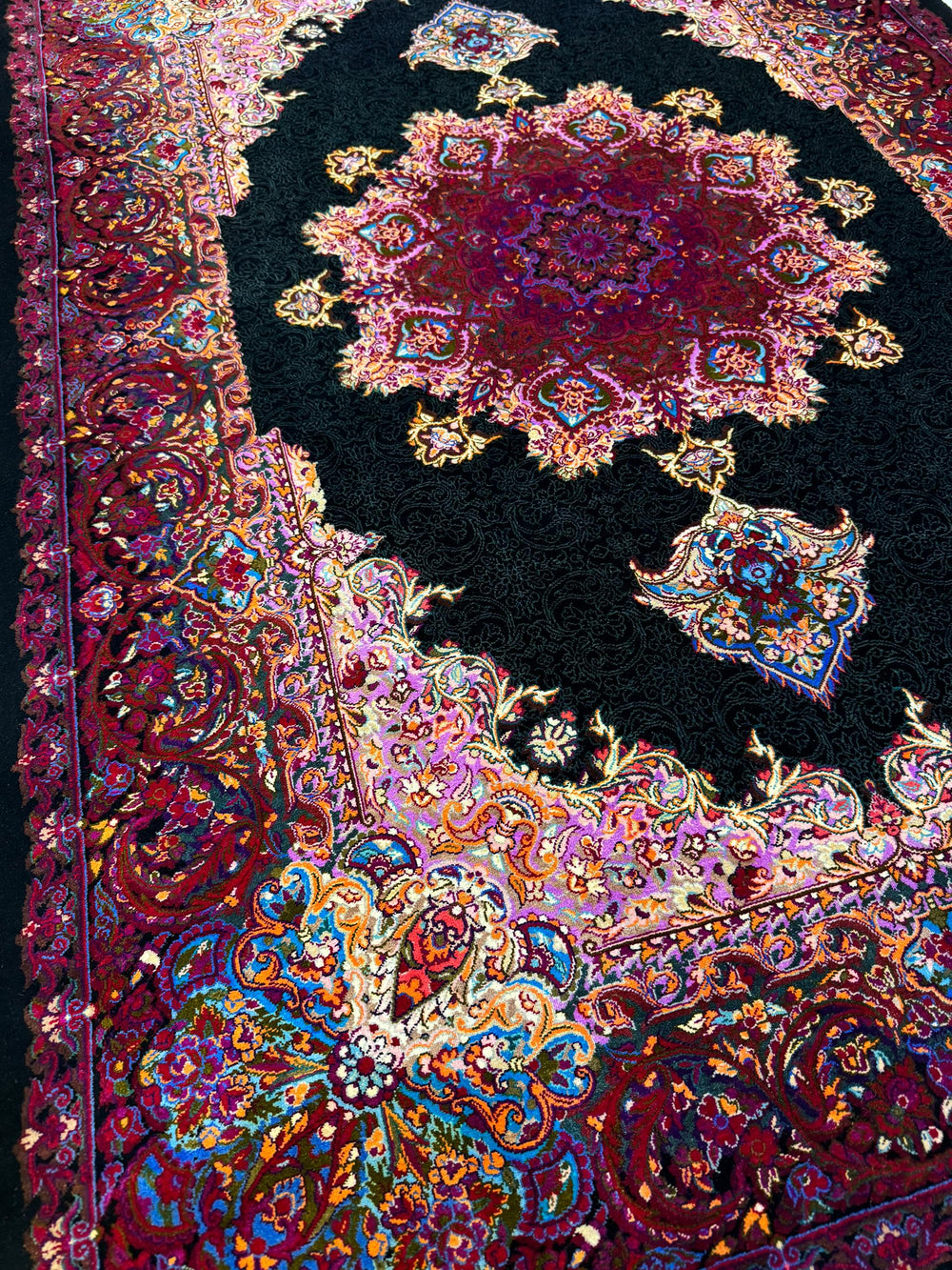 驚くような細かな織り目とビロードのような生地、肌に吸い付くようなシルクの艶やかな光沢感が豪華絢爛。まさに、「The ペルシャ絨毯」と言うべき最高峰のペルシャ絨毯は、もはや工芸品ではなく美術品としての価値となります。ライモン工房のサイン入り。シルクの絨毯は毛足の光沢が見る向きによってまったく趣の異なる色合いになりますので、敷く際は向きを調整してください。