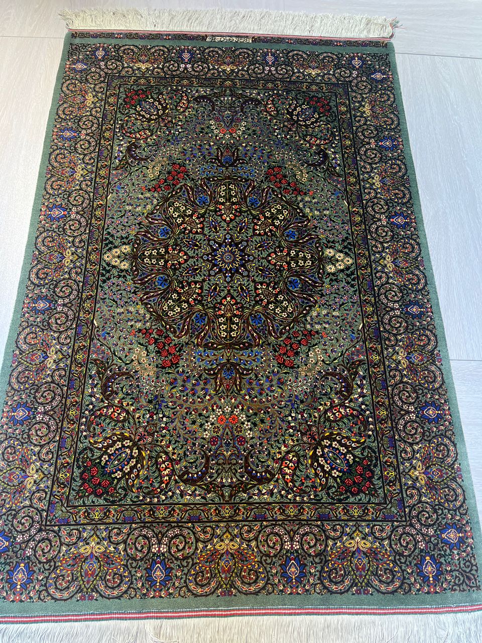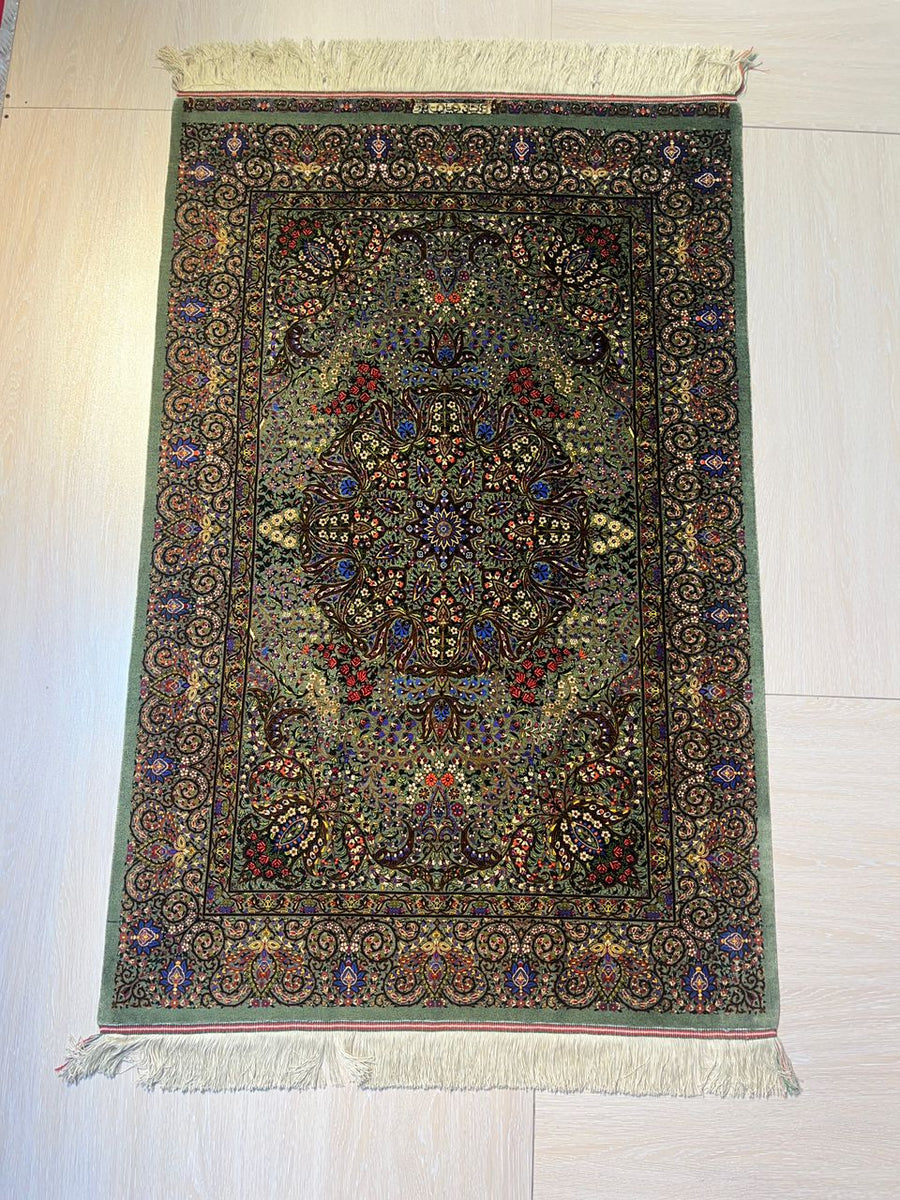 驚くような細かな織り目とビロードのような生地、肌に吸い付くようなシルクの艶やかな光沢感が豪華絢爛。まさに、「The ペルシャ絨毯」と言うべき最高峰のペルシャ絨毯は、もはや工芸品ではなく美術品としての価値となります。アッバス・ジャムシディのサイン入り。シルクの絨毯は毛足の光沢が見る向きによってまったく趣の異なる色合いになりますので、敷く際は向きを調整してください。