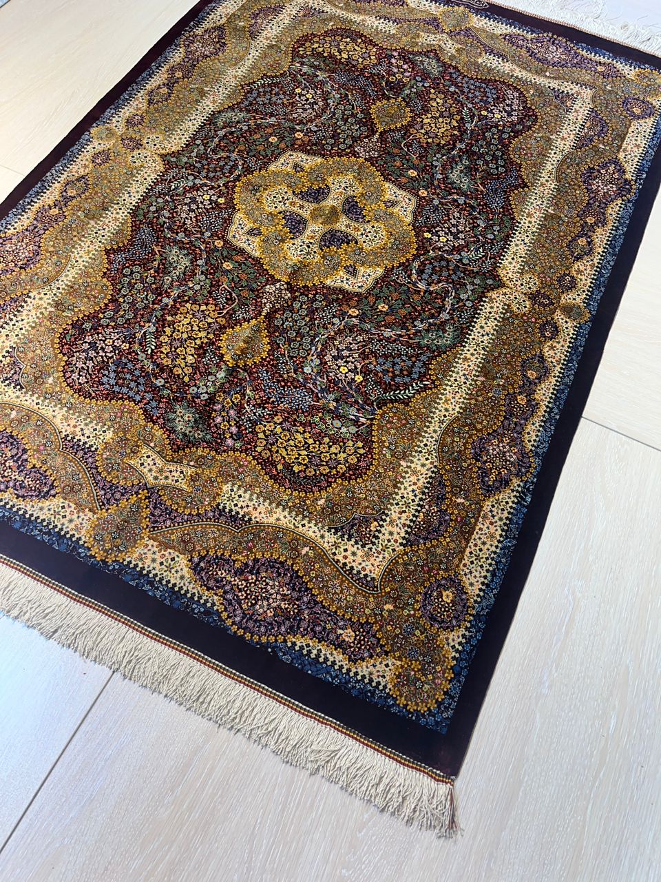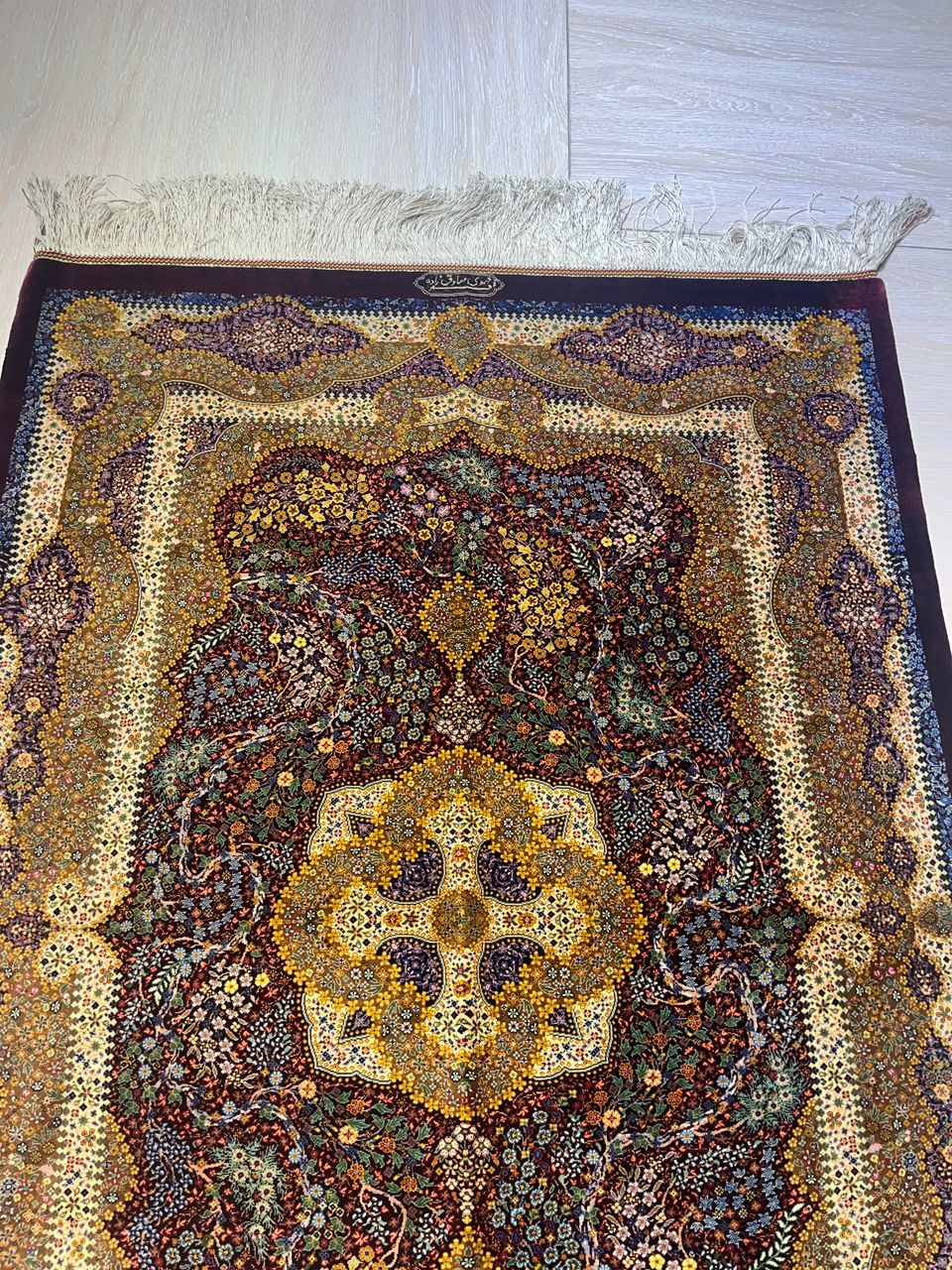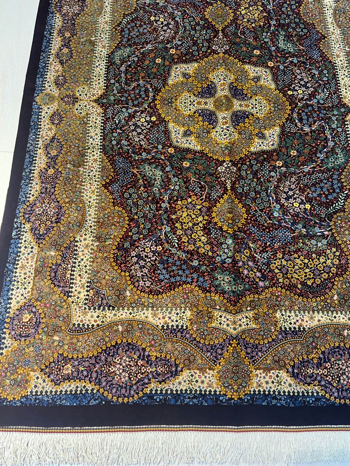 驚くような細かな織り目とビロードのような生地、肌に吸い付くようなシルクの艶やかな光沢感が豪華絢爛。まさに、「The ペルシャ絨毯」と言うべき最高峰のペルシャ絨毯は、もはや工芸品ではなく美術品としての価値となります。サデグザデ工房のサイン入り。シルクの絨毯は毛足の光沢が見る向きによってまったく趣の異なる色合いになりますので、敷く際は向きを調整してください。