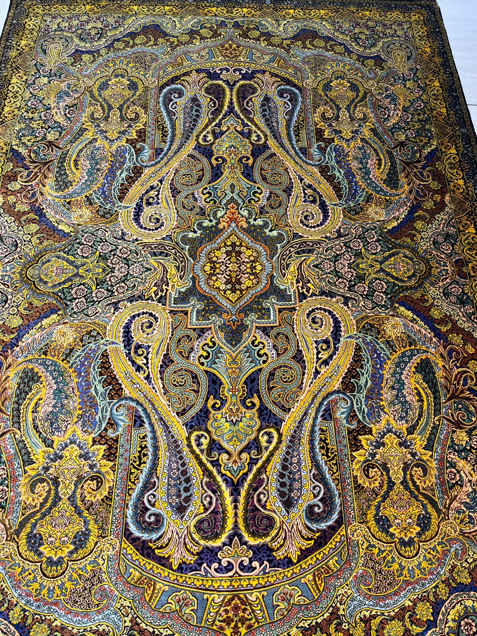 複雑で華麗なペイズリーモチーフが描かれたペルシャ絨毯です。黄色や金色を基調とした温かみのある色合いが、エレガントで落ち着いた雰囲気を演出しています。繊細なディテールと緻密な織りが、この絨毯の高級感と美しさを際立たせています。