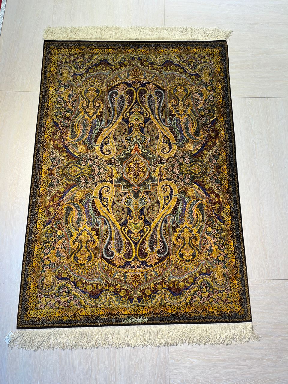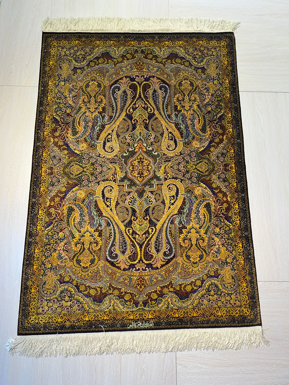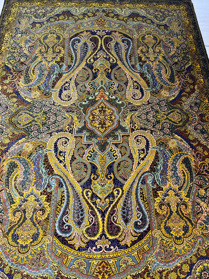 驚くような細かな織り目とビロードのような生地、肌に吸い付くようなシルクの艶やかな光沢感が豪華絢爛。まさに、「The ペルシャ絨毯」と言うべき最高峰のペルシャ絨毯は、もはや工芸品ではなく美術品としての価値となります。カズミ工房のサイン入り。シルクの絨毯は毛足の光沢が見る向きによってまったく趣の異なる色合いになりますので、敷く際は向きを調整してください。