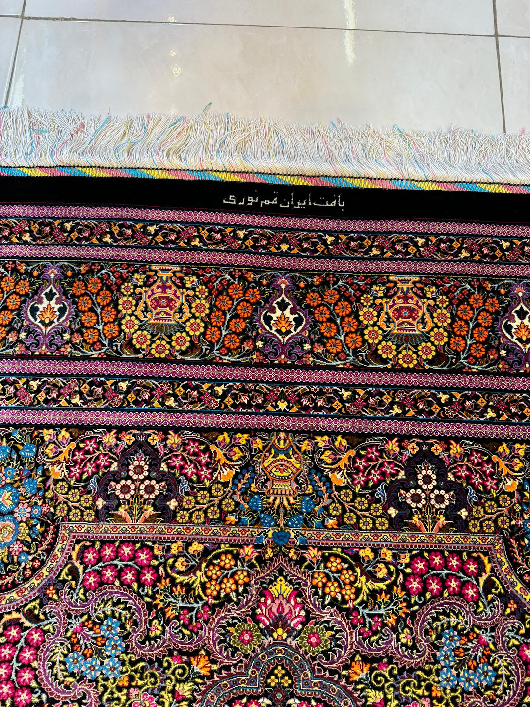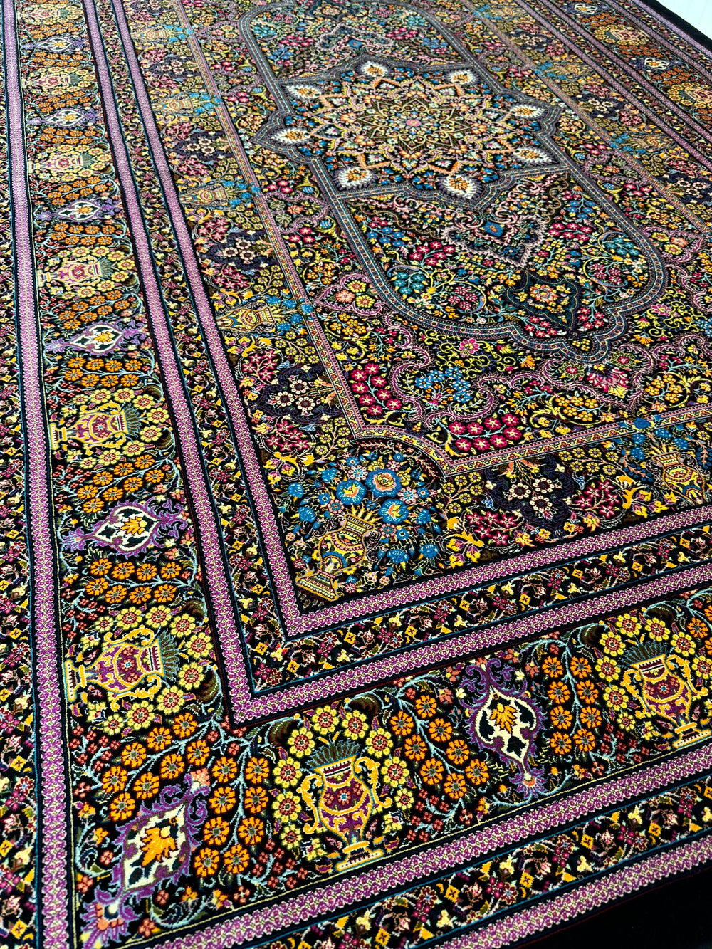 繊細なデザインが特徴のペルシャ絨毯です。深みのある黒を基調にした色彩が高級感を引き立て、中央の華やかなモチーフが空間に優雅さを添えます。周囲を囲む花模様や装飾は、カラフルな色彩で緻密に描かれており、伝統とモダンが調和した逸品です。