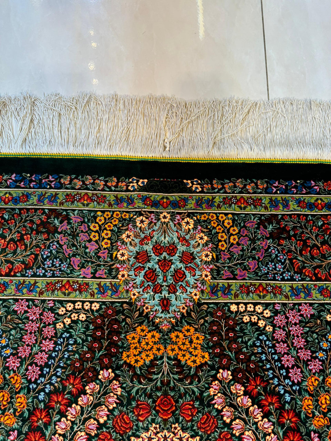 驚くような細かな織り目とビロードのような生地、肌に吸い付くようなシルクの艶やかな光沢感が豪華絢爛。まさに、「The ペルシャ絨毯」と言うべき最高峰のペルシャ絨毯は、もはや工芸品ではなく美術品としての価値となります。シルクの絨毯は毛足の光沢が見る向きによってまったく趣の異なる色合いになりますので、敷く際は向きを調整してください。