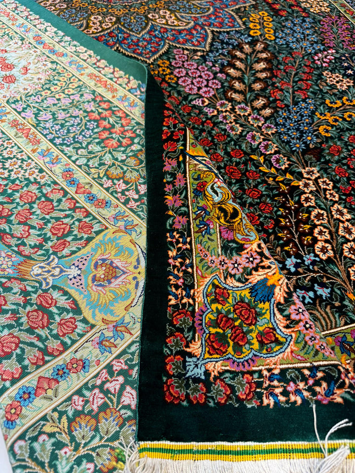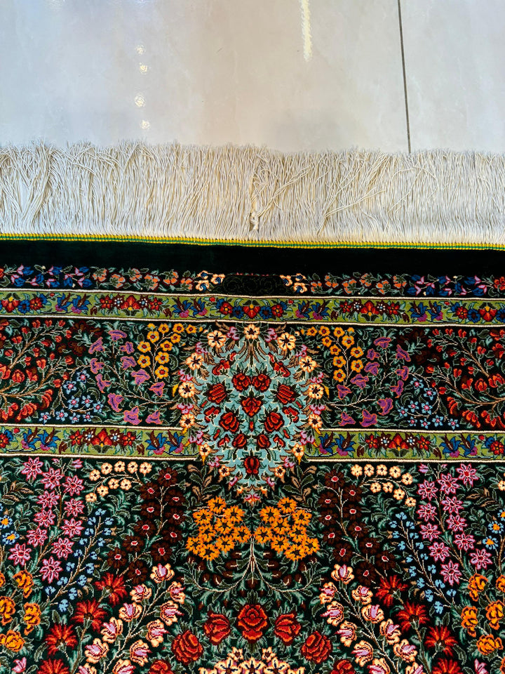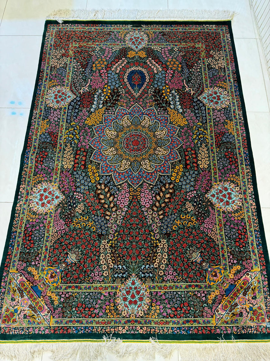 緻密な花柄デザインが特徴の美しいペルシャ絨毯です。深みのあるグリーンを基調に、赤、青、黄色などカラフルな色彩で描かれた花々が贅沢に散りばめられています。中央の花模様は豪華な大輪のデザインで、繊細なタッチが魅力です。周囲には色鮮やかな小花や植物が優雅に配置され、全体に洗練された調和が感じられます。
