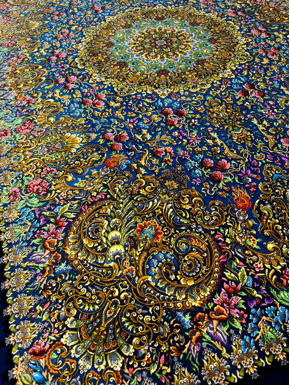 深い青色を基調とし、豪華で繊細なデザインが施された高級ペルシャ絨毯です。中央には複雑な円形の花模様が描かれ、周囲には鮮やかな花々と華やかな装飾が広がっています。細部まで美しく表現された植物模様とゴールド調のアクセントが特徴で、上品な輝きを放つ一枚です。