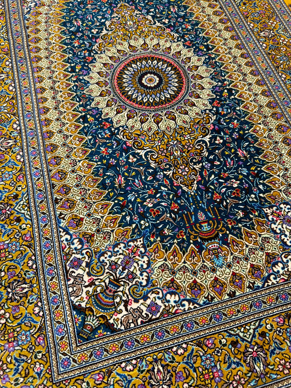 黄色を基調とした華やかなデザインが魅力のペルシャ絨毯です。中央には美しい花模様が描かれ、周囲の装飾がそれを際立たせています。細やかな柄と繊細な織りが、伝統的な職人技術の高さを感じさせます。小ぶりなサイズでありながら、存在感のある仕上がりです。
