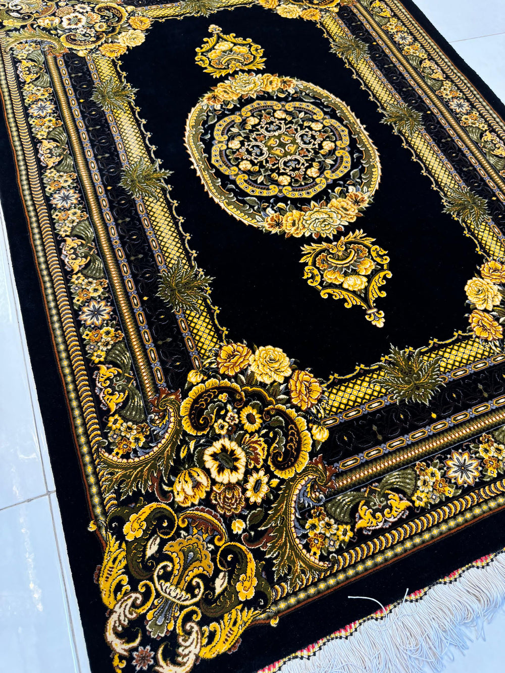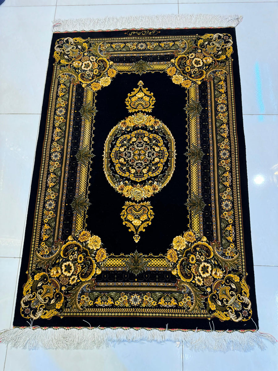 豪華な黒を基調とし、金色の花模様と幾何学的なデザインが調和したヴェルサーチ風のペルシャ絨毯です。洗練された色使いと精緻な織り模様が特徴で、空間に高級感をプラスします。